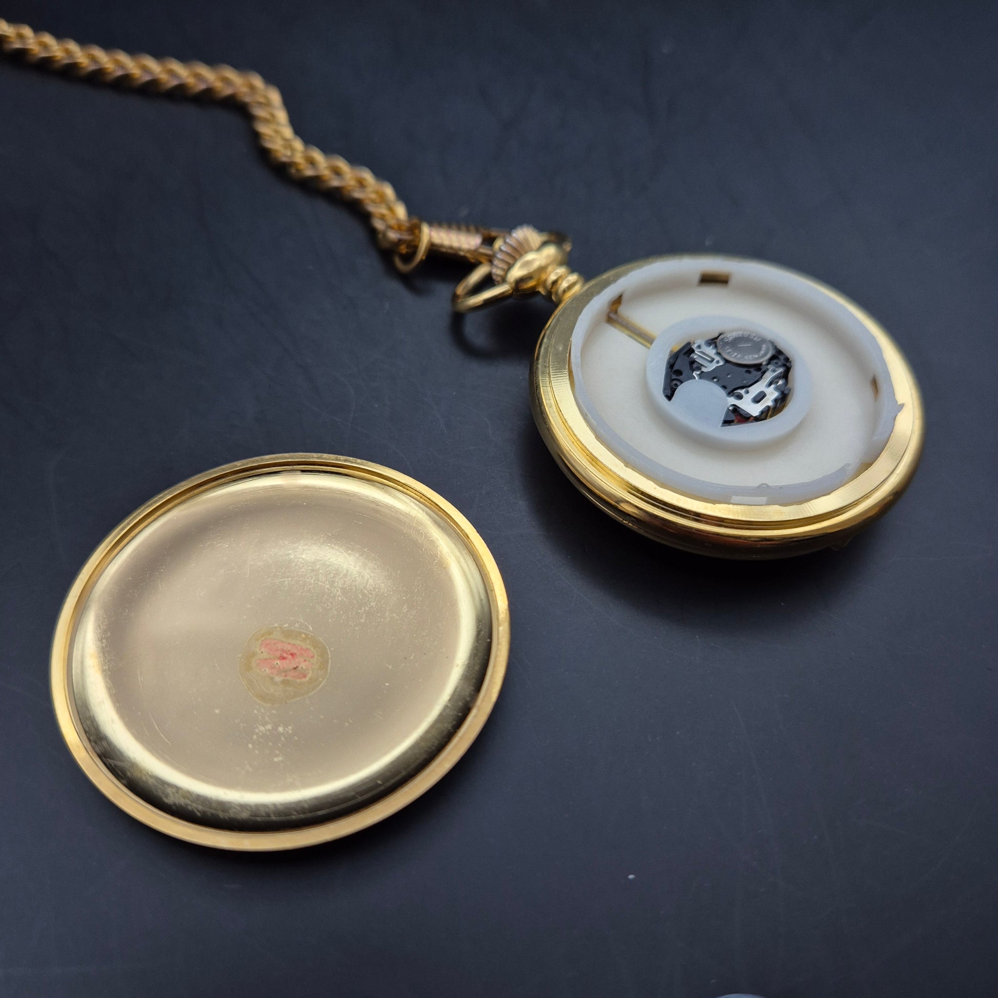 Diese elegante Brinex Taschenuhr präsentiert sich in einem zeitlosen, goldfarbenen Design mit fein strukturierter Oberfläche und dekorativer Gravur auf der Rückseite. Das weiße Zifferblatt mit schwarzen arabischen Ziffern und 24-Stunden-Skala sorgt für eine klare Lesbarkeit. Dank des robusten Quarzwerks bietet die Uhr präzise Zeitmessung bei klassischer Optik. Die mitgelieferte Kette rundet das edle Gesamtbild ab – ein stilvolles Accessoire für Sammler und Liebhaber traditioneller Uhrmacherkunst.