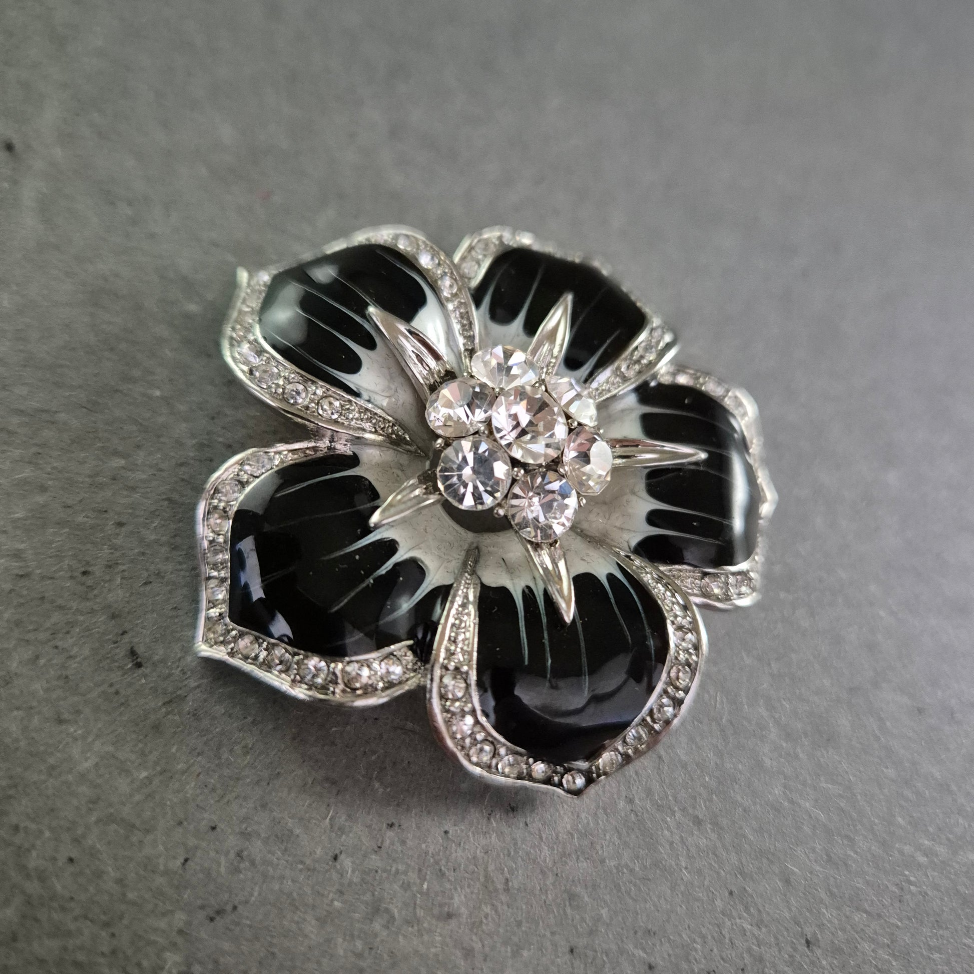 Brosche in Blütenform mit Strass und schwarzer Emaille – Glamourös