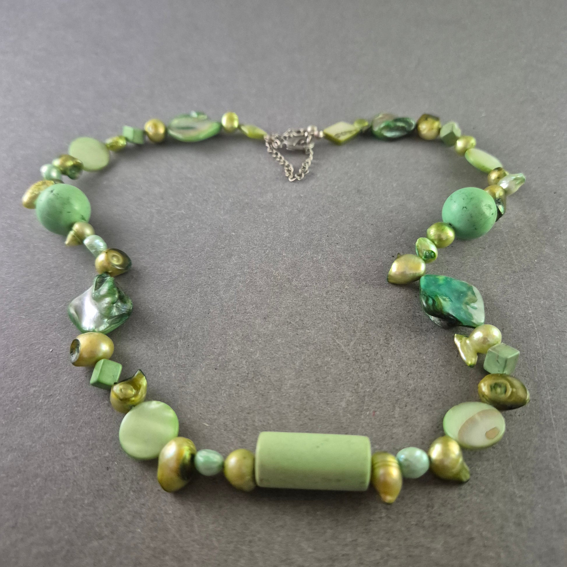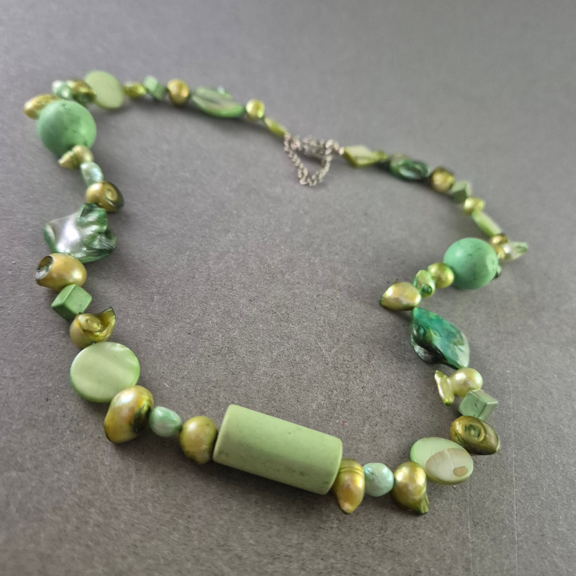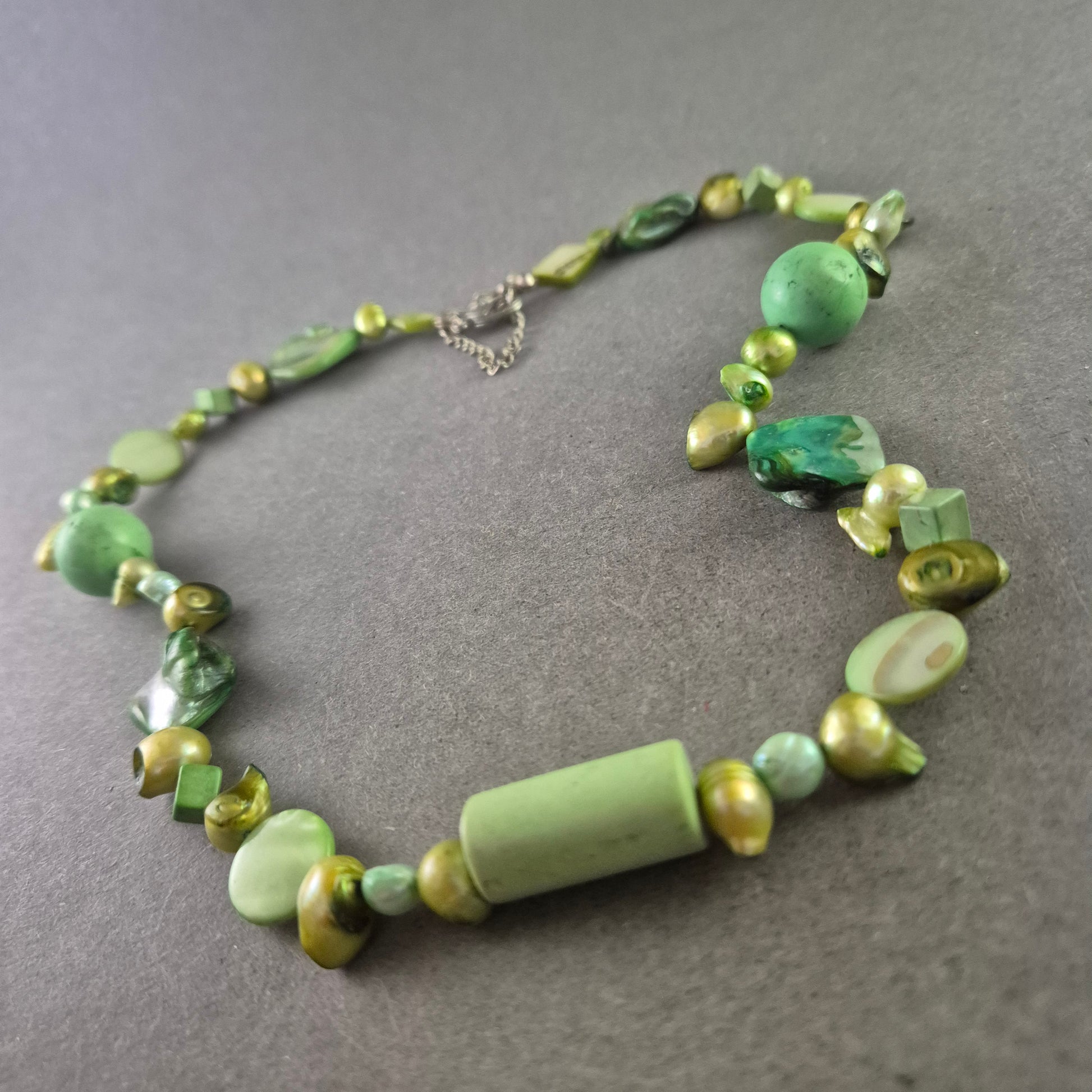 Diese kreative Halskette kombiniert verschiedene grüne Stein- und Perlenelemente zu einem einzigartigen Schmuckstück im natürlichen Boho-Stil. Mit ihrer Kombination aus glänzenden und matten Oberflächen bringt sie lebendige Frische und einen Hauch von Vintage in jedes Outfit. Ideal für kreative Modebewusste, die Wert auf Individualität legen.