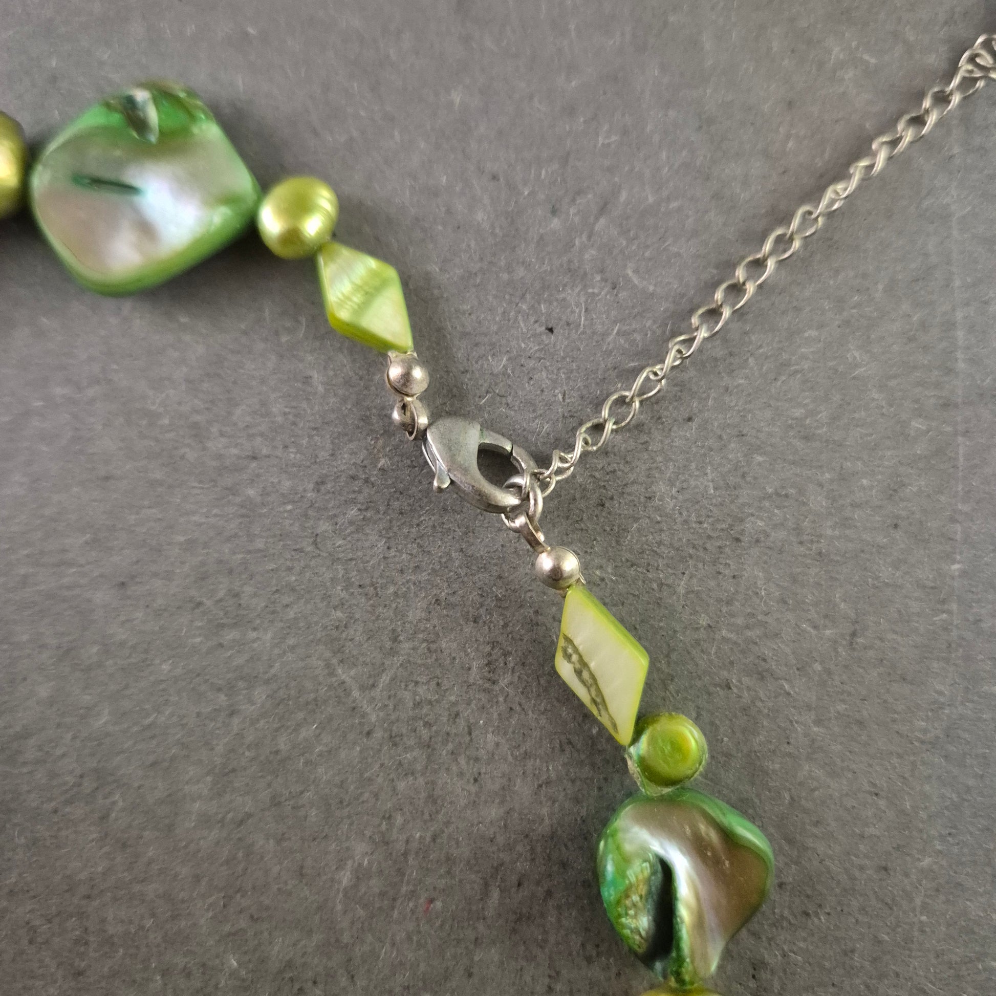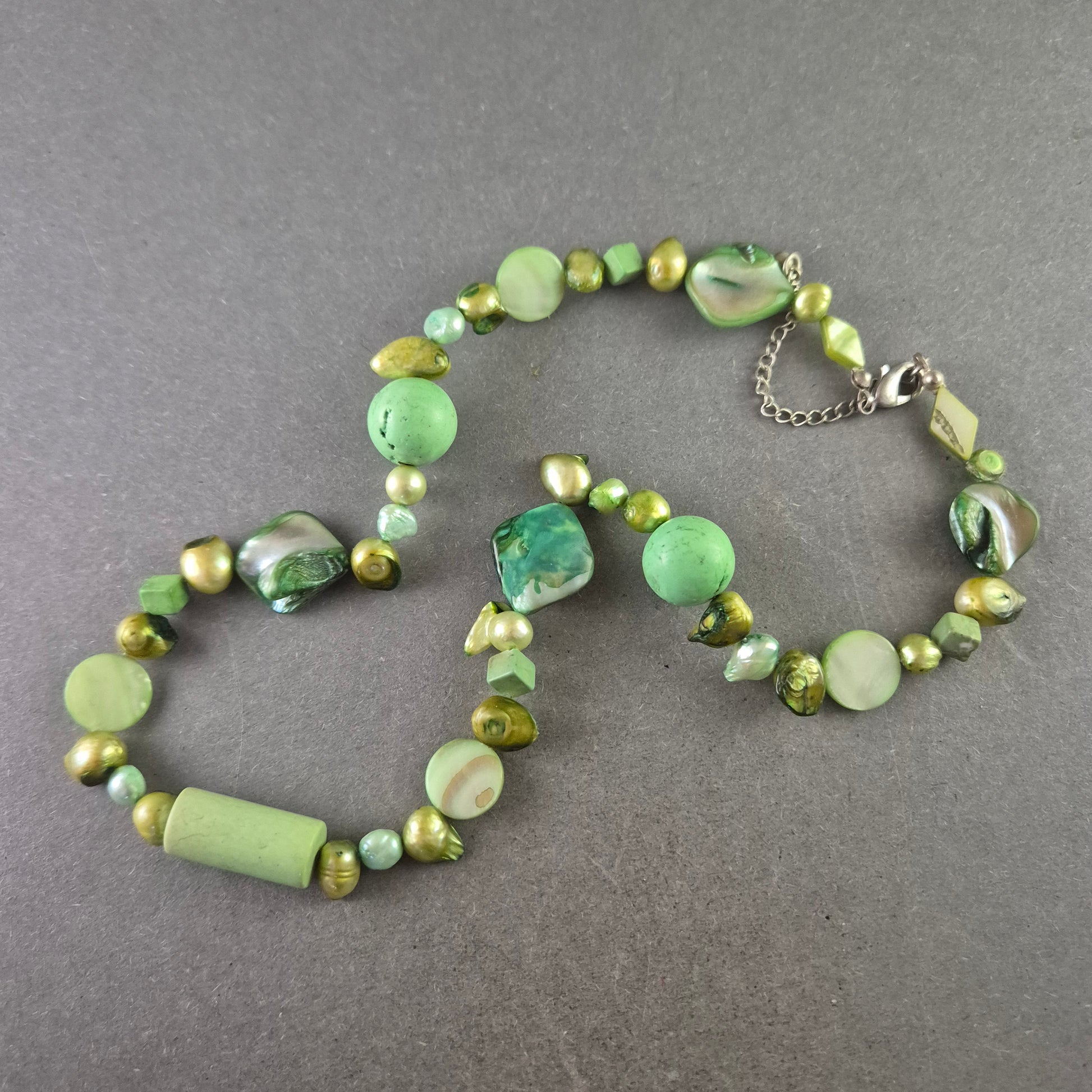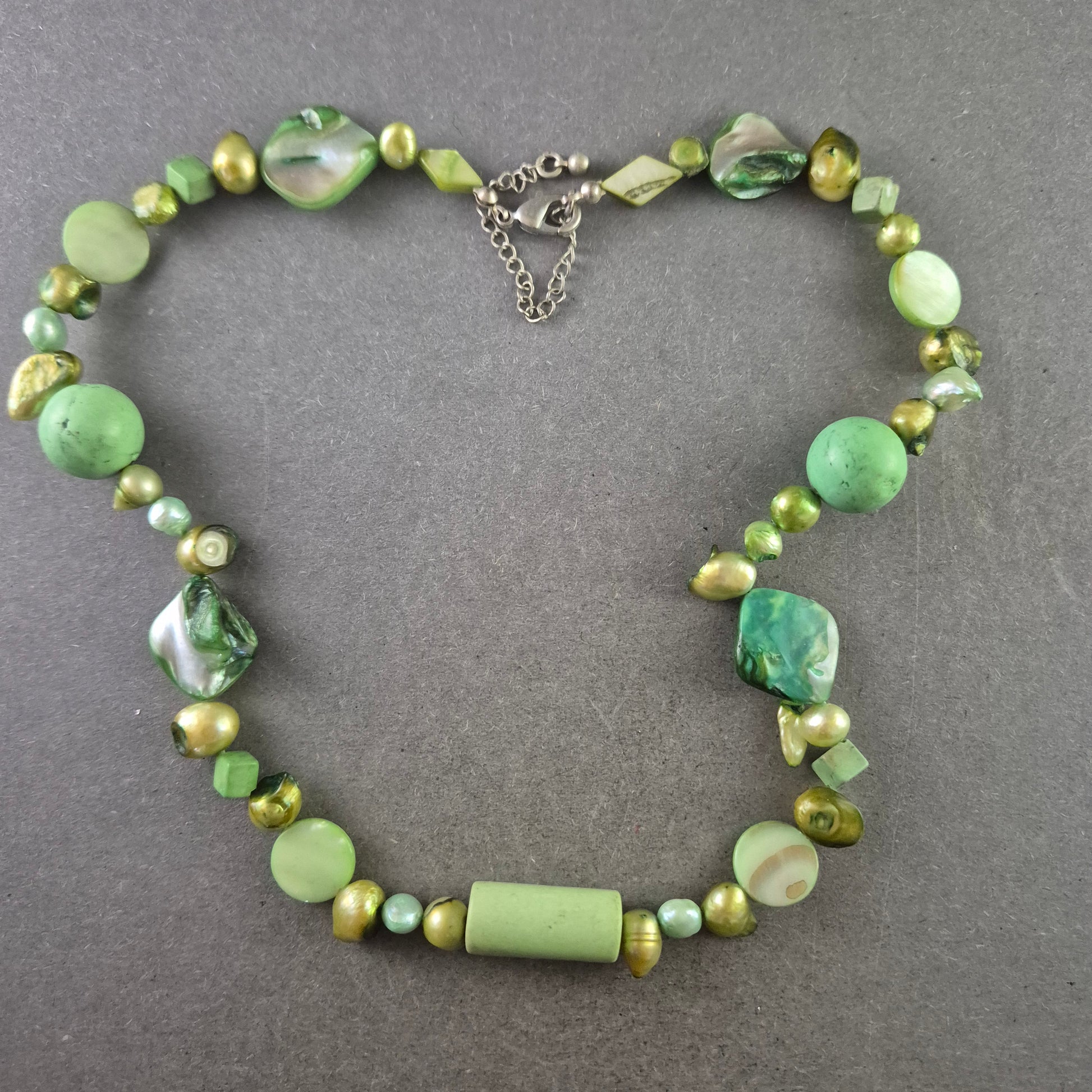 Diese kreative Halskette kombiniert verschiedene grüne Stein- und Perlenelemente zu einem einzigartigen Schmuckstück im natürlichen Boho-Stil. Mit ihrer Kombination aus glänzenden und matten Oberflächen bringt sie lebendige Frische und einen Hauch von Vintage in jedes Outfit. Ideal für kreative Modebewusste, die Wert auf Individualität legen.