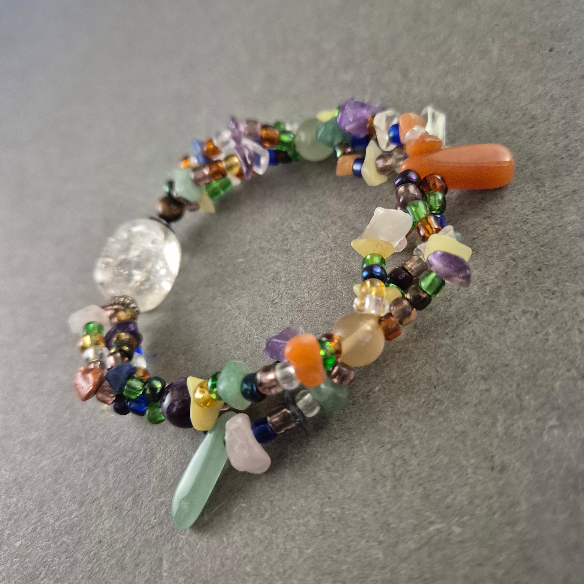 Dieses farbenfrohe Armband kombiniert verschiedenste Glas- und Natursteine zu einem verspielten und lebendigen Design. Die abwechslungsreiche Mischung aus bunten Perlen, Chips und größeren Edelstein-Elementen macht jedes Stück einzigartig. Ideal für alle, die gerne kreative, handgefertigte Schmuckstücke im Boho- oder Ethno-Stil tragen.
