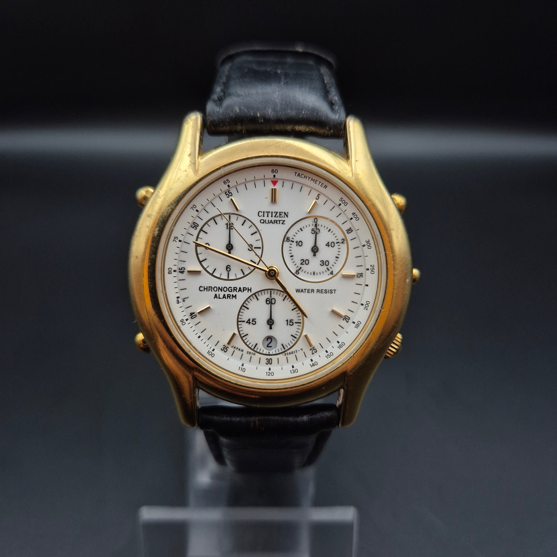 Diese Citizen Herren Uhr im klassischen Chronographen-Stil kombiniert Funktionalität mit zeitloser Eleganz. Das weiße Zifferblatt mit mehreren Totalisatoren und goldfarbenen Zeigern sowie ein schwarzes Lederarmband verleihen der Uhr eine hochwertige Optik. Leider befindet sich die Uhr in defektem Zustand und eignet sich daher ideal als Ersatzteilspender oder Restaurierungsprojekt für Bastler und Uhrensammler.