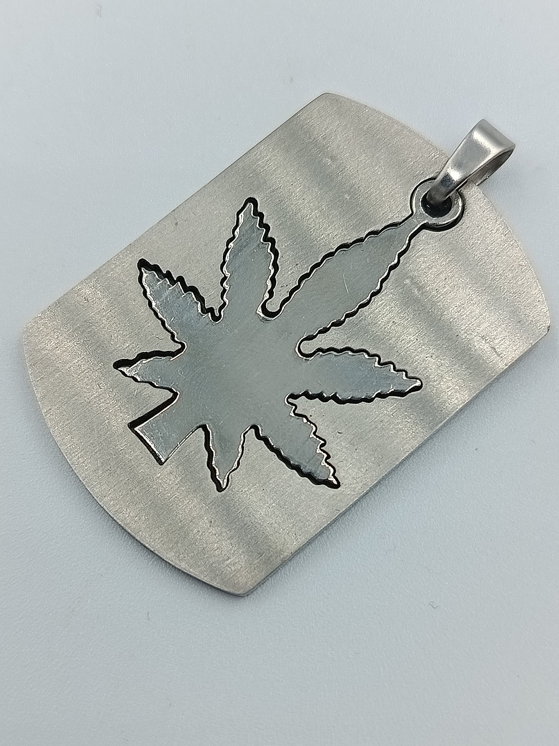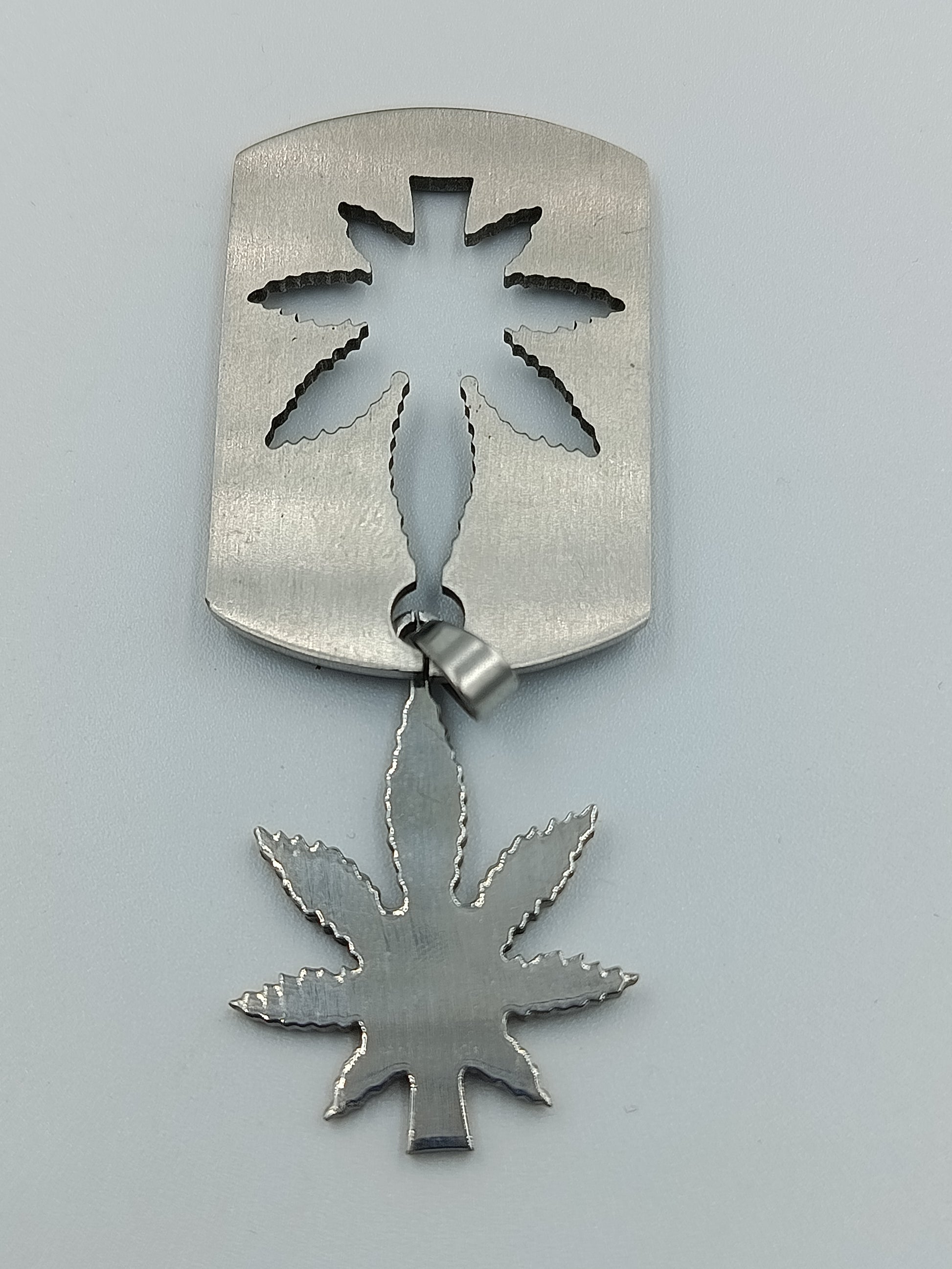 Moderner, massiver Edelstahl-Anhänger mit ausgeschnittenem Blattmotiv und passendem herausnehmbaren Einsatz. Ein echter Hingucker für alle, die ein auffälliges, urbanes Accessoire suchen.