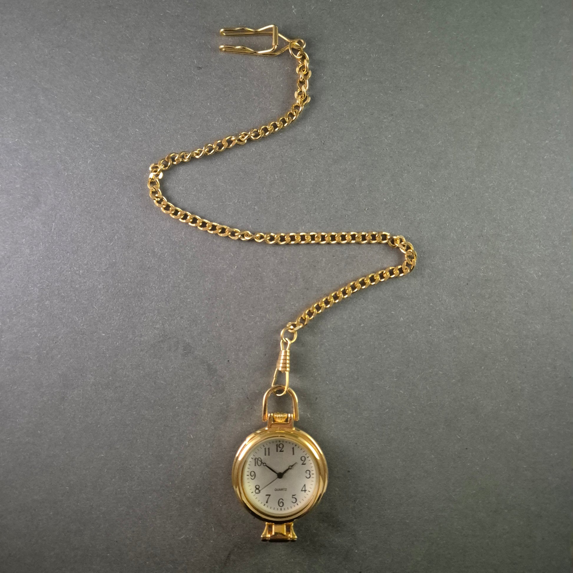 Diese stilvolle goldene Taschenuhr kombiniert klassisches Design mit moderner Präzision. Das runde Gehäuse mit glänzender Vergoldung verleiht ihr eine edle Optik, während das weiße Zifferblatt mit schwarzen Ziffern eine klare Ablesbarkeit bietet. Mit der passenden goldenen Kette kann sie stilvoll an einer Weste oder Hose befestigt werden – perfekt für Vintage-Liebhaber und Sammler zeitloser Accessoires.