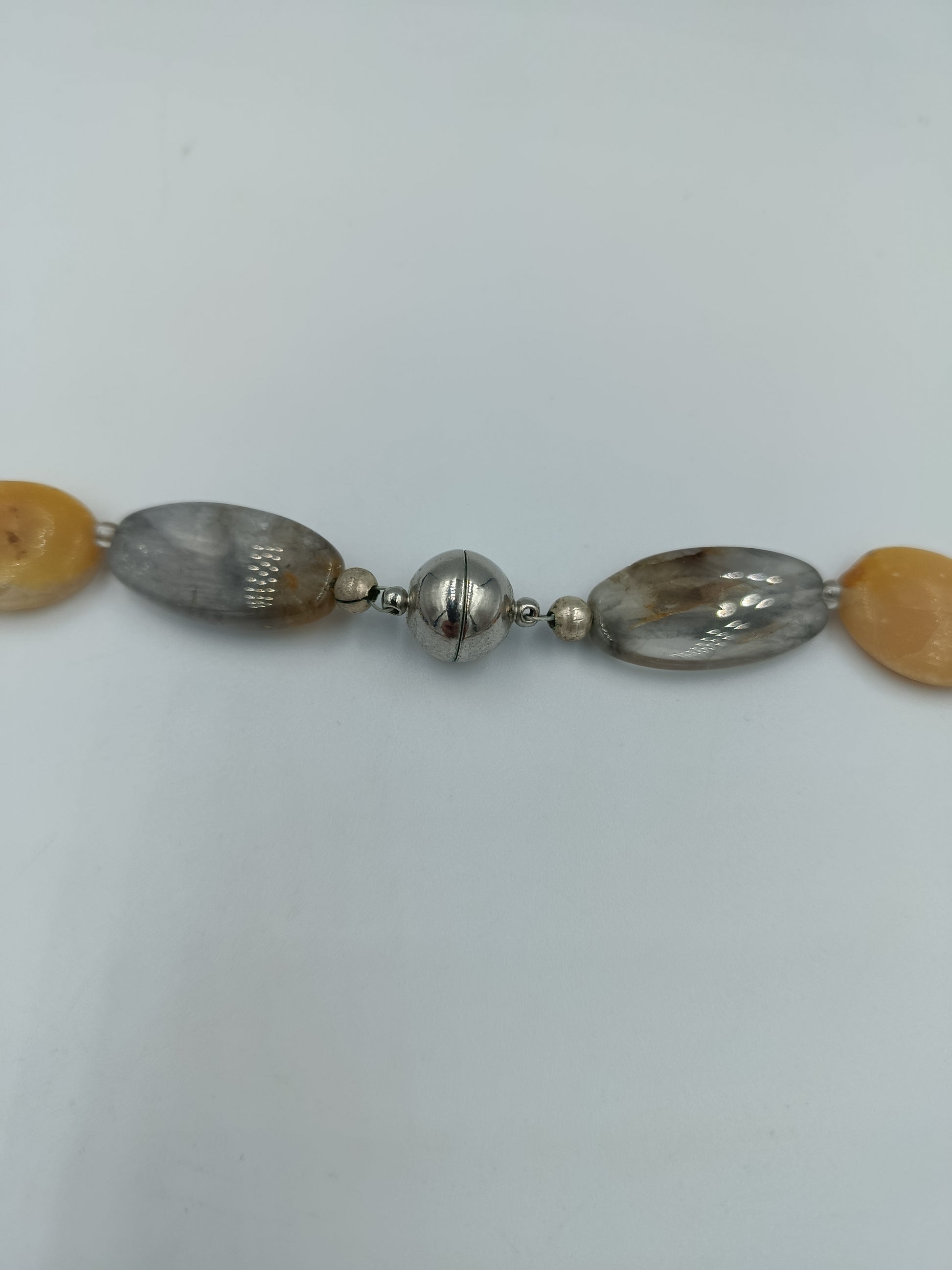 Eine edle Halskette mit ovalen Schmucksteinen in warmem Gelb und kühlem Grau. Die polierten Steine wechseln sich harmonisch ab und werden durch einen silberfarbenen Magnetverschluss zusammengehalten. Das Zusammenspiel von hellen und dunklen Tönen macht dieses Schmuckstück zu einem besonderen Blickfang – sowohl im Alltag als auch zu festlichen Anlässen.