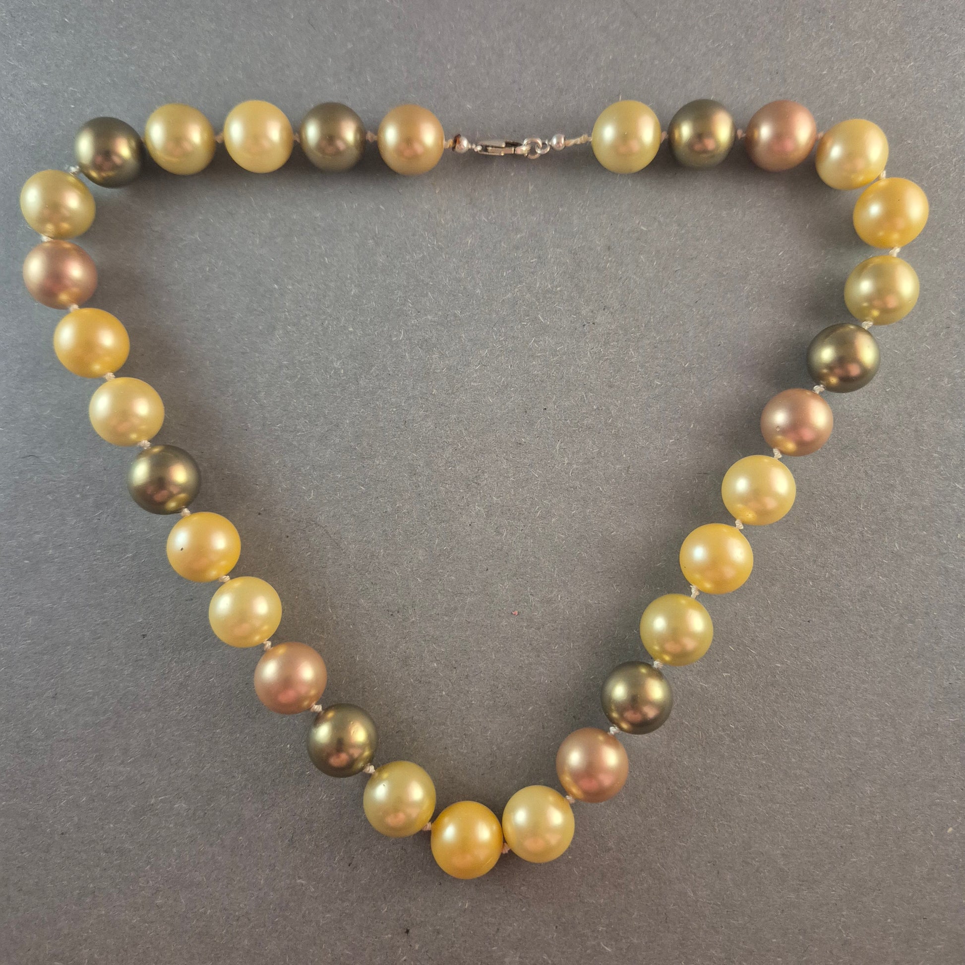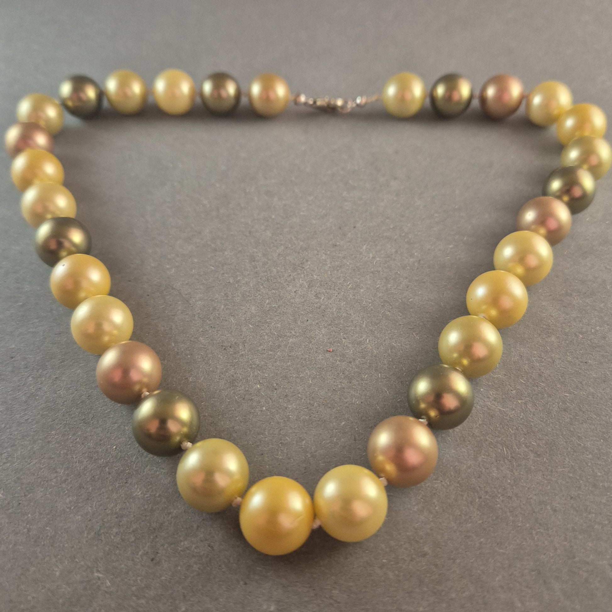 Diese stilvolle Perlenkette beeindruckt mit ihrem sanften Farbverlauf aus goldenen, bronzenen und olivgrünen Schattierungen. Die gleichmäßig runden Perlen verleihen dem Schmuckstück eine klassische Eleganz, die perfekt für festliche Anlässe oder stilvolle Alltagslooks ist. Ein zeitloses Accessoire für Liebhaber edler Perlenketten.