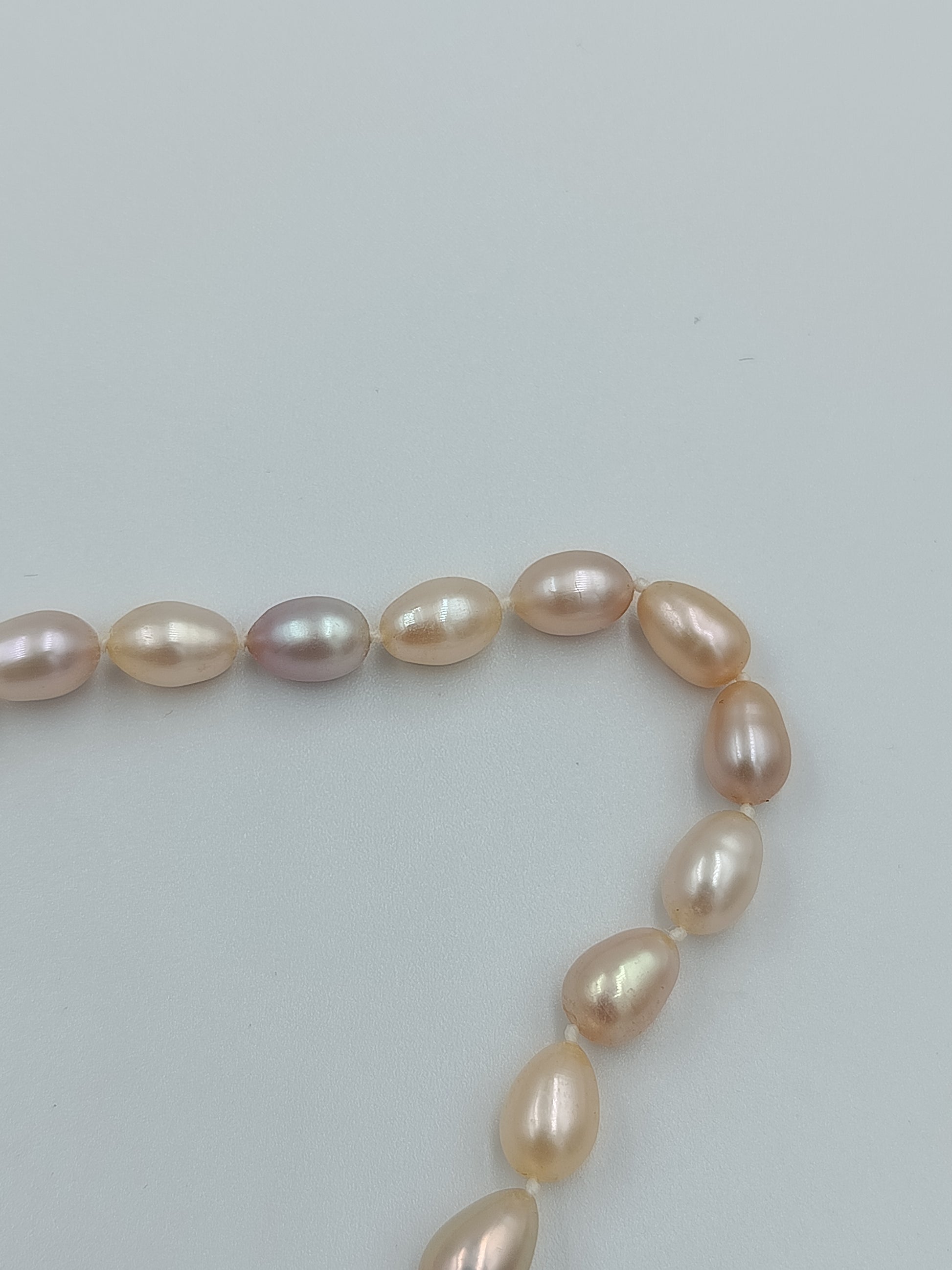 Klassische, zeitlose Perlenkette mit zarten, ovalen Süßwasserperlen in sanften Pastelltönen (weiß, creme, rosé). Die Perlen sind von Hand aufgezogen und werden durch einen praktischen Magnetverschluss sicher gehalten – einfaches An- und Ablegen ist garantiert. Diese Kette eignet sich hervorragend für elegante Anlässe oder als dezentes Highlight im Alltag.