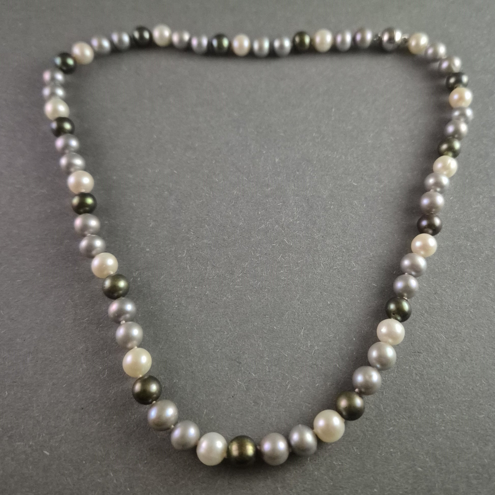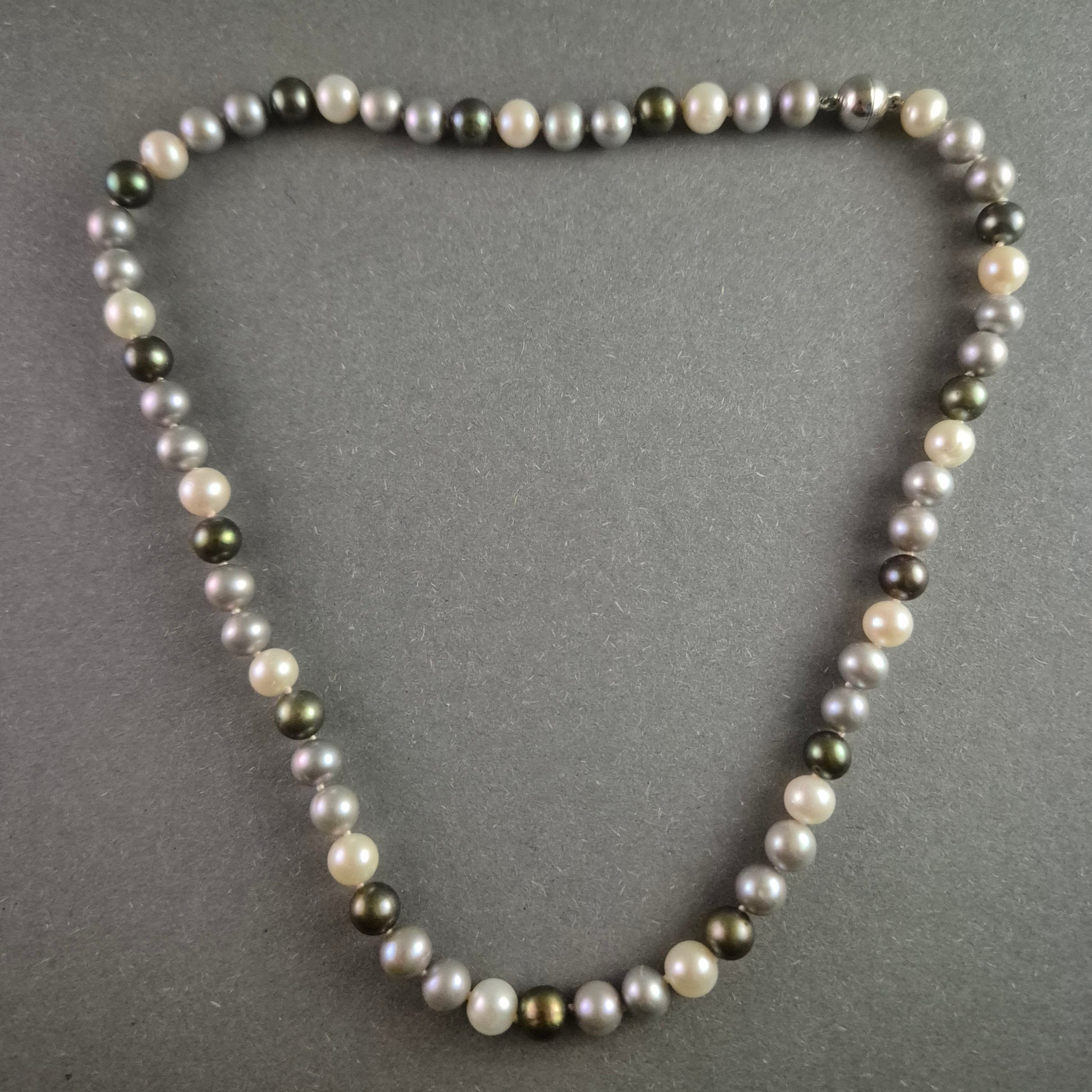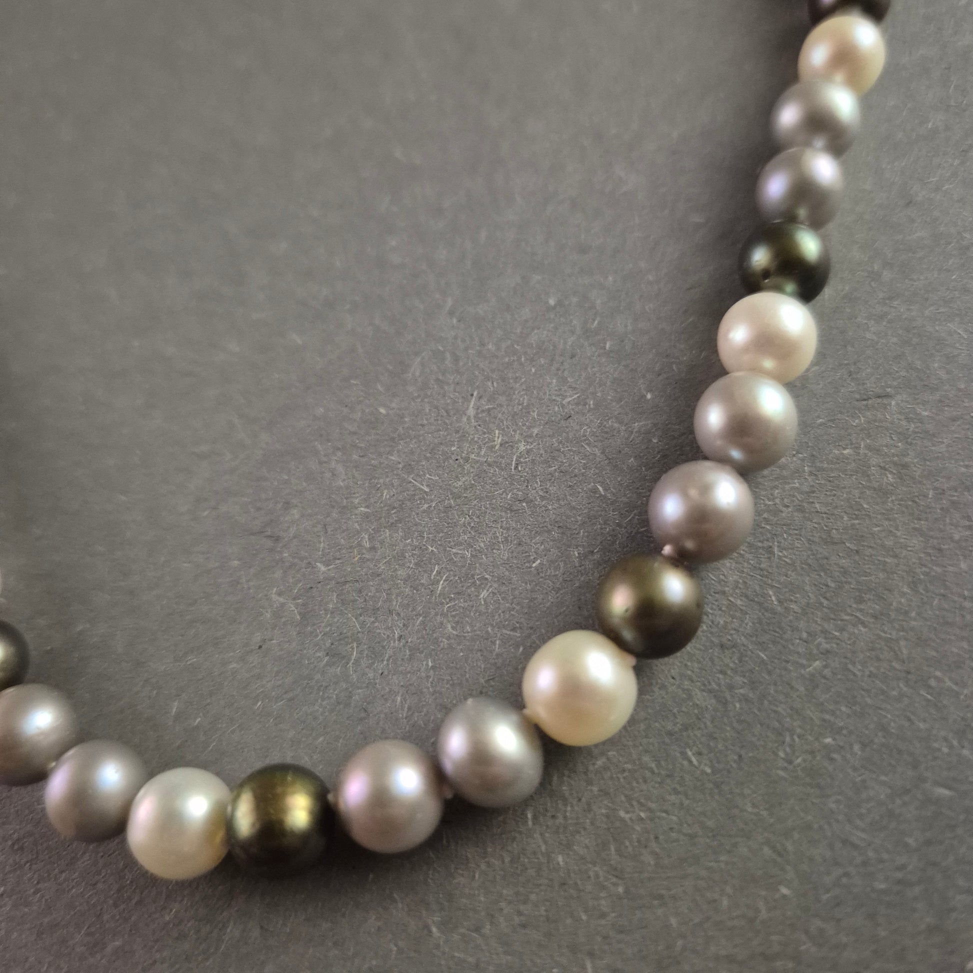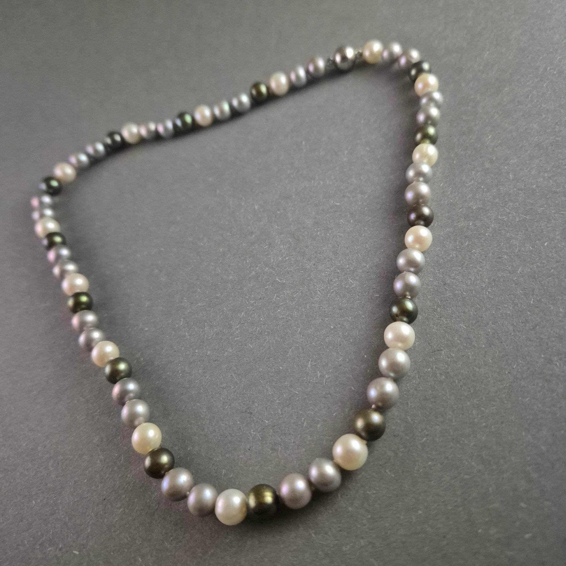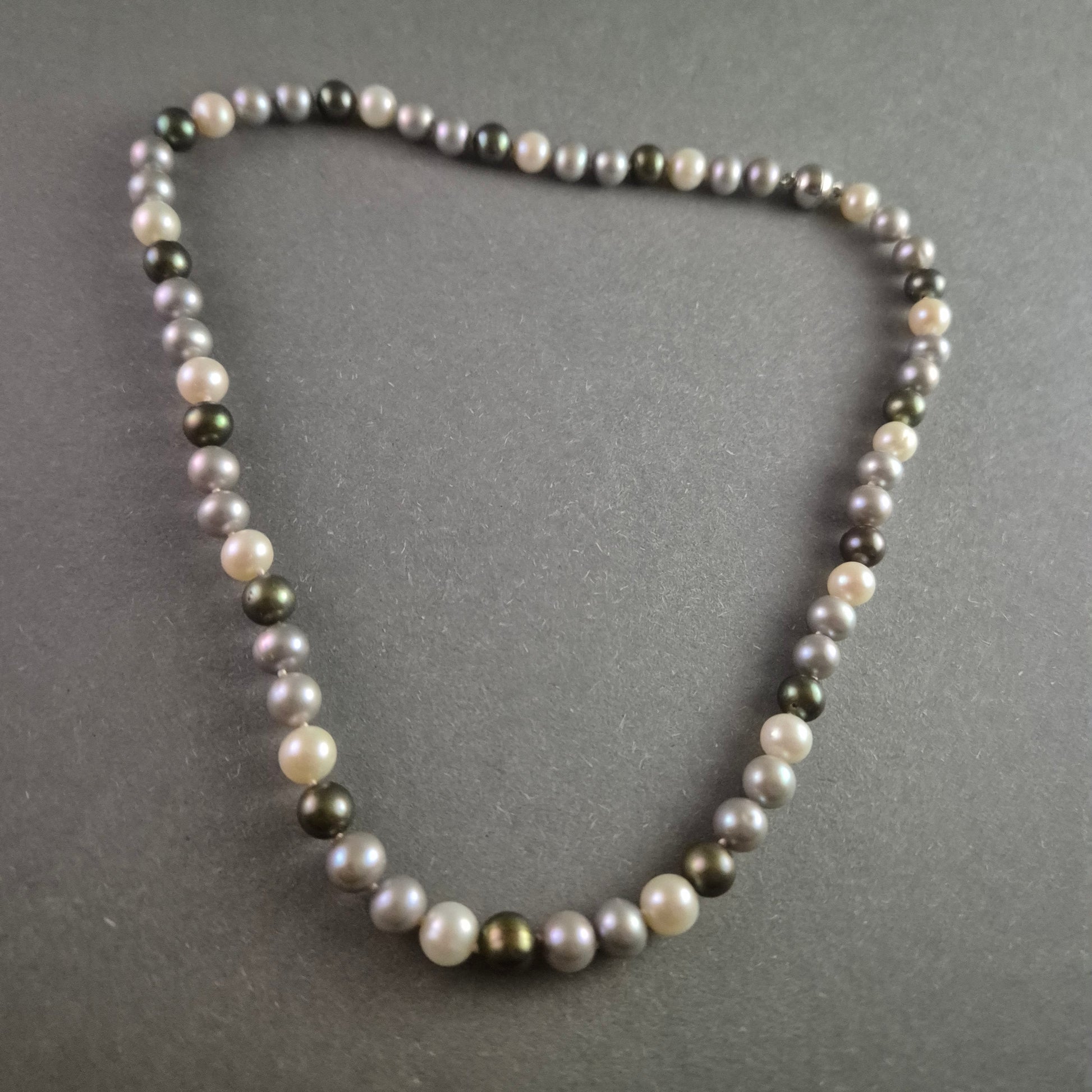 Diese wunderschöne Perlenkette besticht durch ihre einzigartigen, mehrfarbigen Süßwasserperlen in sanften Grau-, Schwarz- und Cremetönen. Die feine Verarbeitung und die natürlichen Farbvariationen verleihen dem Schmuckstück eine edle Ausstrahlung. Mit ihrem klassischen Design ist diese Kette sowohl für festliche Anlässe als auch für den Alltag eine stilvolle Wahl.