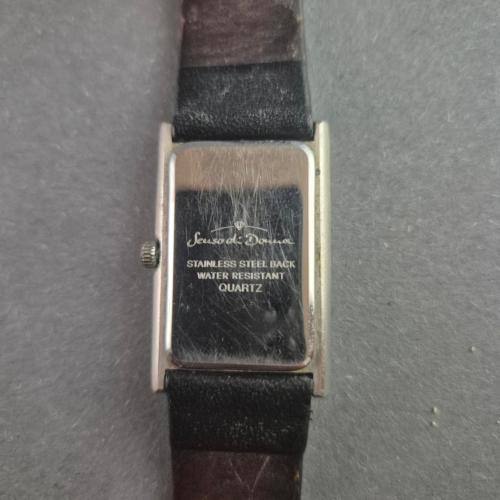 Diese Senso di Donna Damenarmbanduhr vereint zeitlose Eleganz mit minimalistischem Design. Das rechteckige Gehäuse und das silberne Zifferblatt ohne Ziffern verleihen der Uhr eine moderne und zugleich klassische Optik. Das schwarze Lederarmband ergänzt den Look perfekt und sorgt für ein angenehmes Tragegefühl. Ideal für stilbewusste Frauen, die auf schlichte Eleganz setzen.