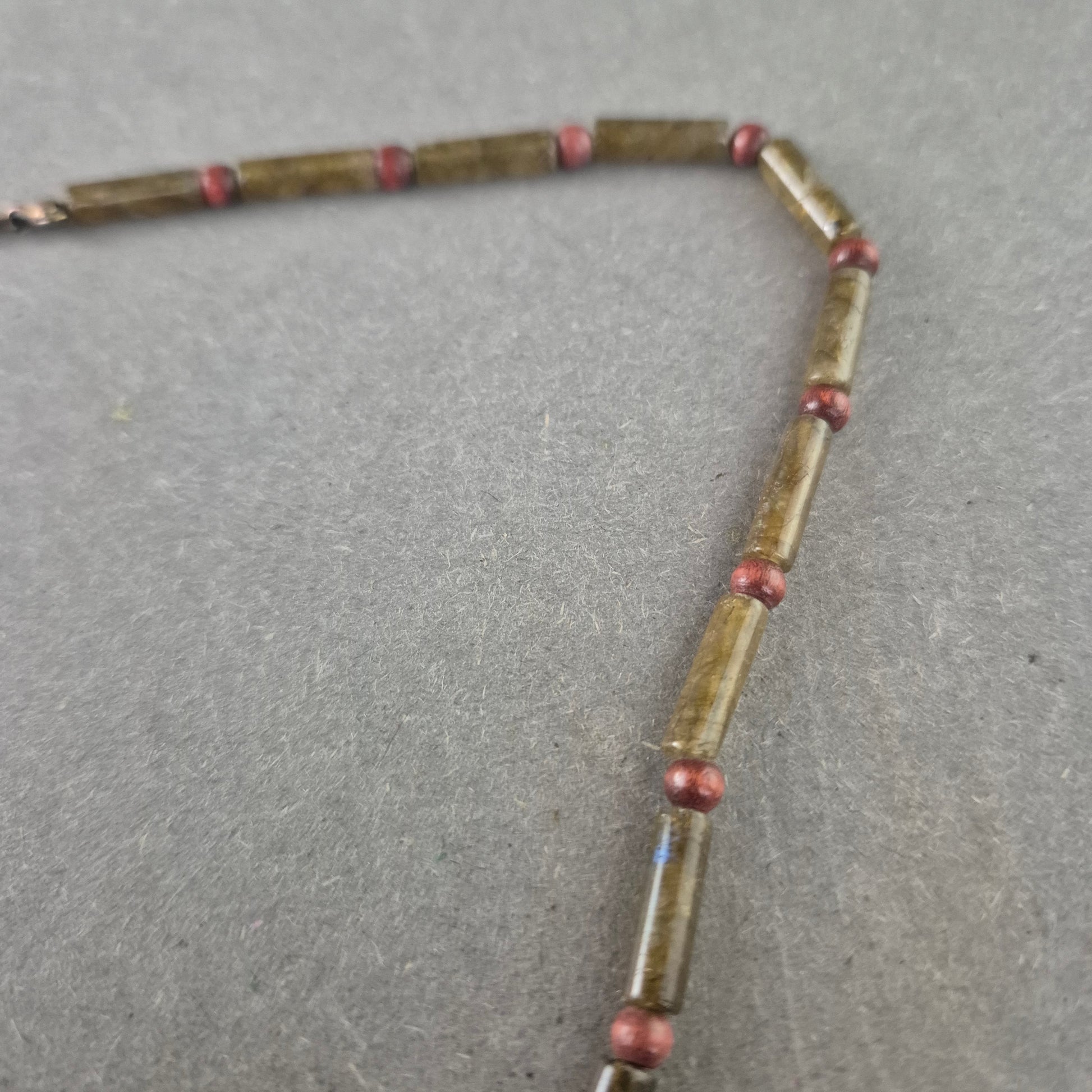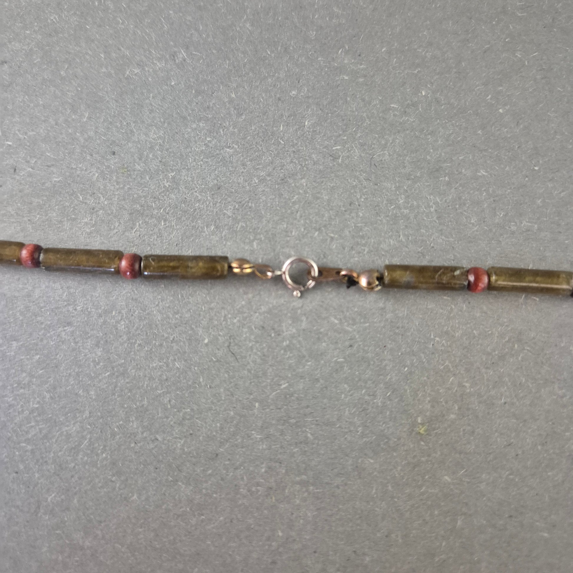 Diese stilvolle Halskette kombiniert längliche grüne Steinperlen mit runden, roten Akzentperlen und schafft so ein harmonisches und natürliches Gesamtbild. Die Farbgebung erinnert an erdige Eleganz und macht die Kette zu einem vielseitigen Begleiter – sowohl im Alltag als auch zu besonderen Anlässen. Der praktische Federringverschluss sorgt für ein sicheres Tragen.