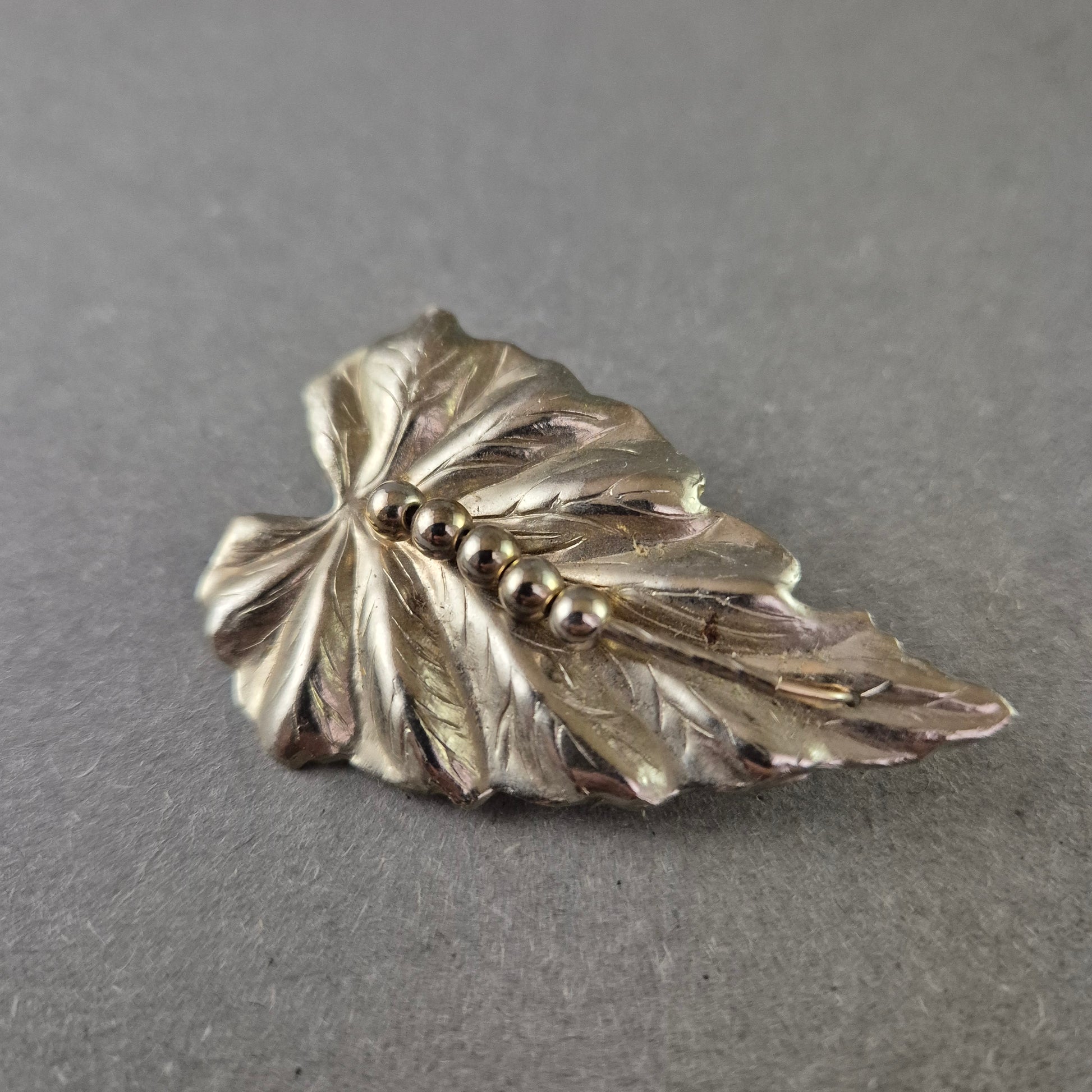 Diese zarte Vintage-Brosche in Form eines detaillierten Blattes besticht durch ihre gold-silbrig changierende Metalloberfläche. Das wellenförmige Design der Blattadern verleiht der Brosche eine natürliche Dynamik und hebt die handwerkliche Präzision hervor. Ein feines Accessoire, das jedes Outfit dezent aufwertet und als zeitloses Schmuckstück perfekt für Liebhaber klassischer Designs ist.