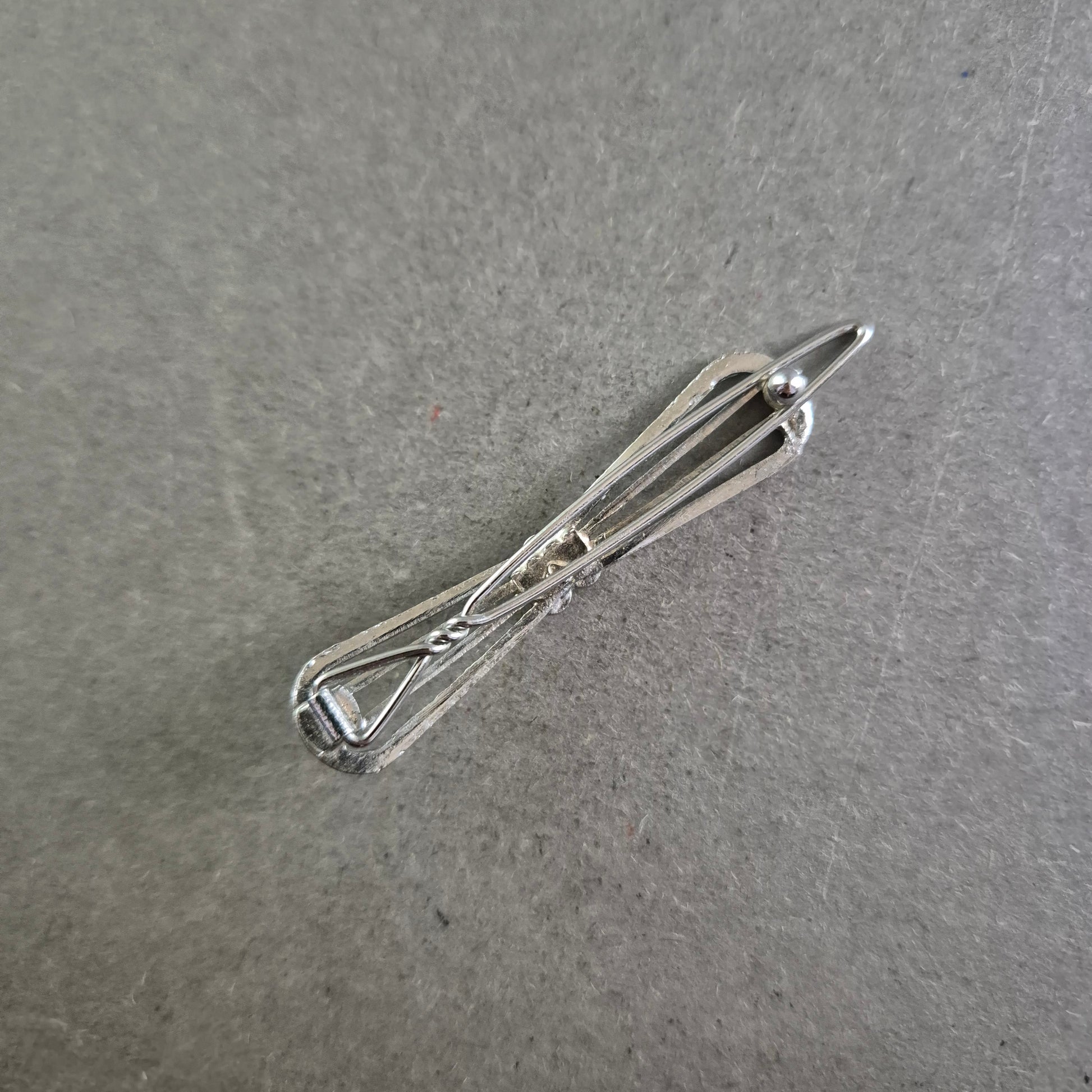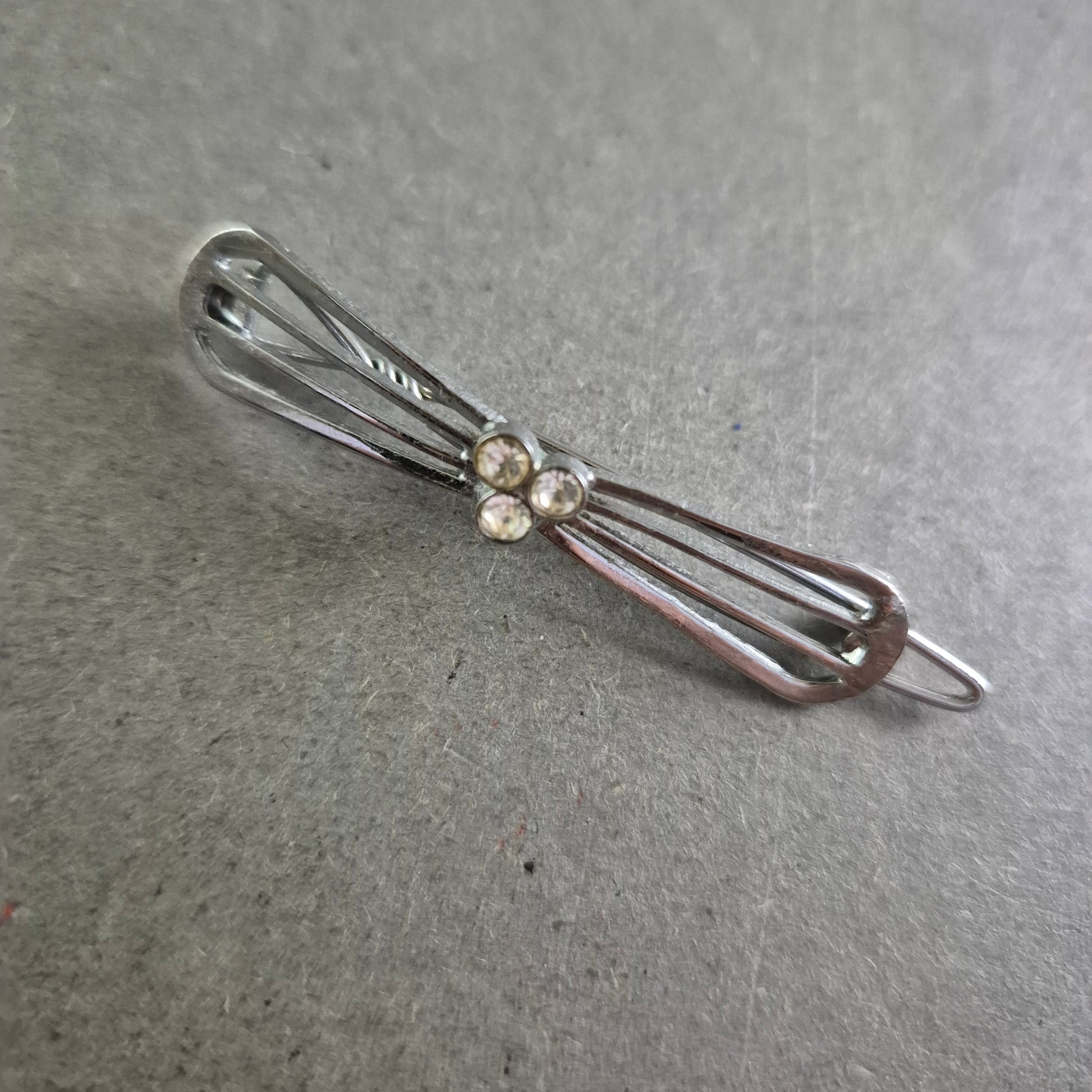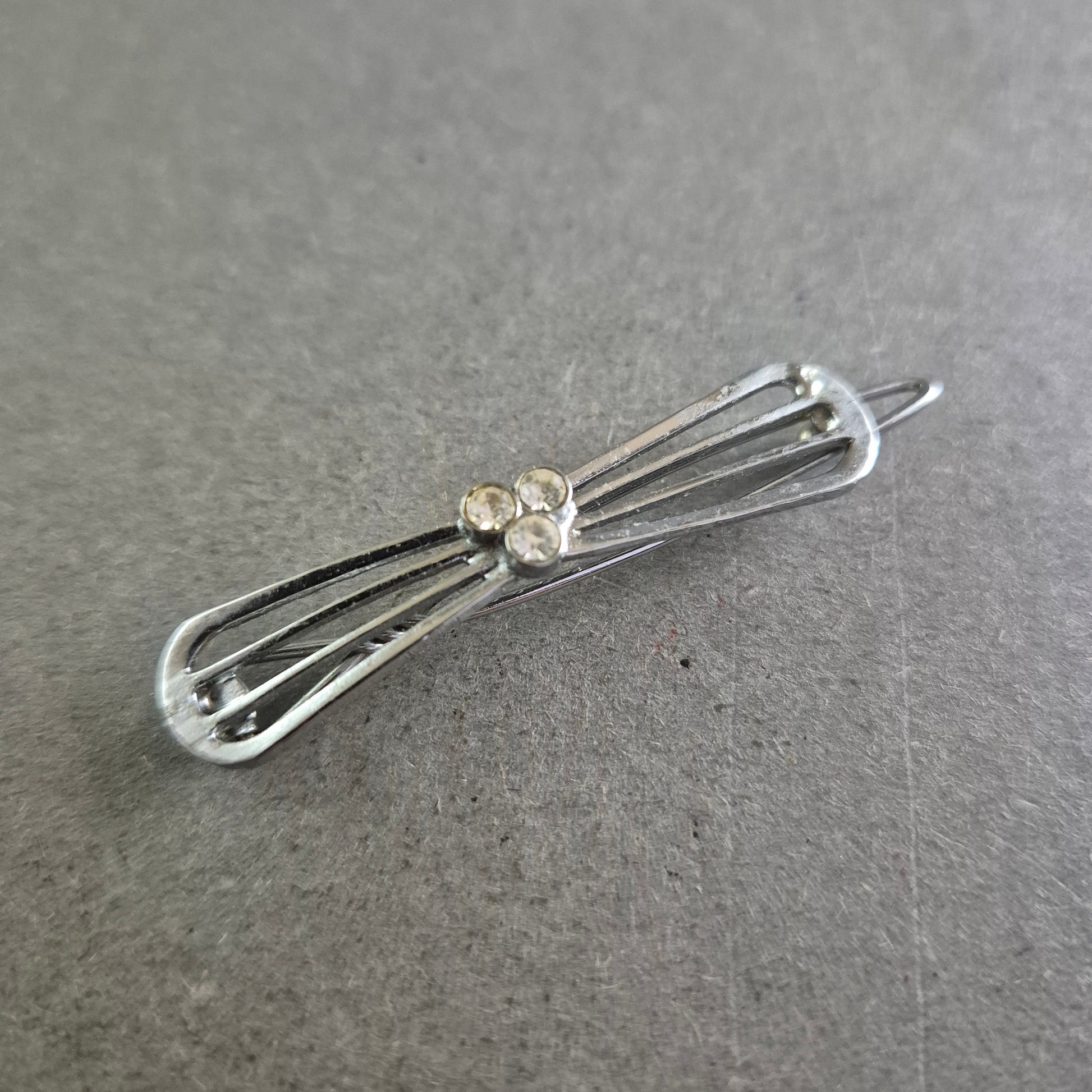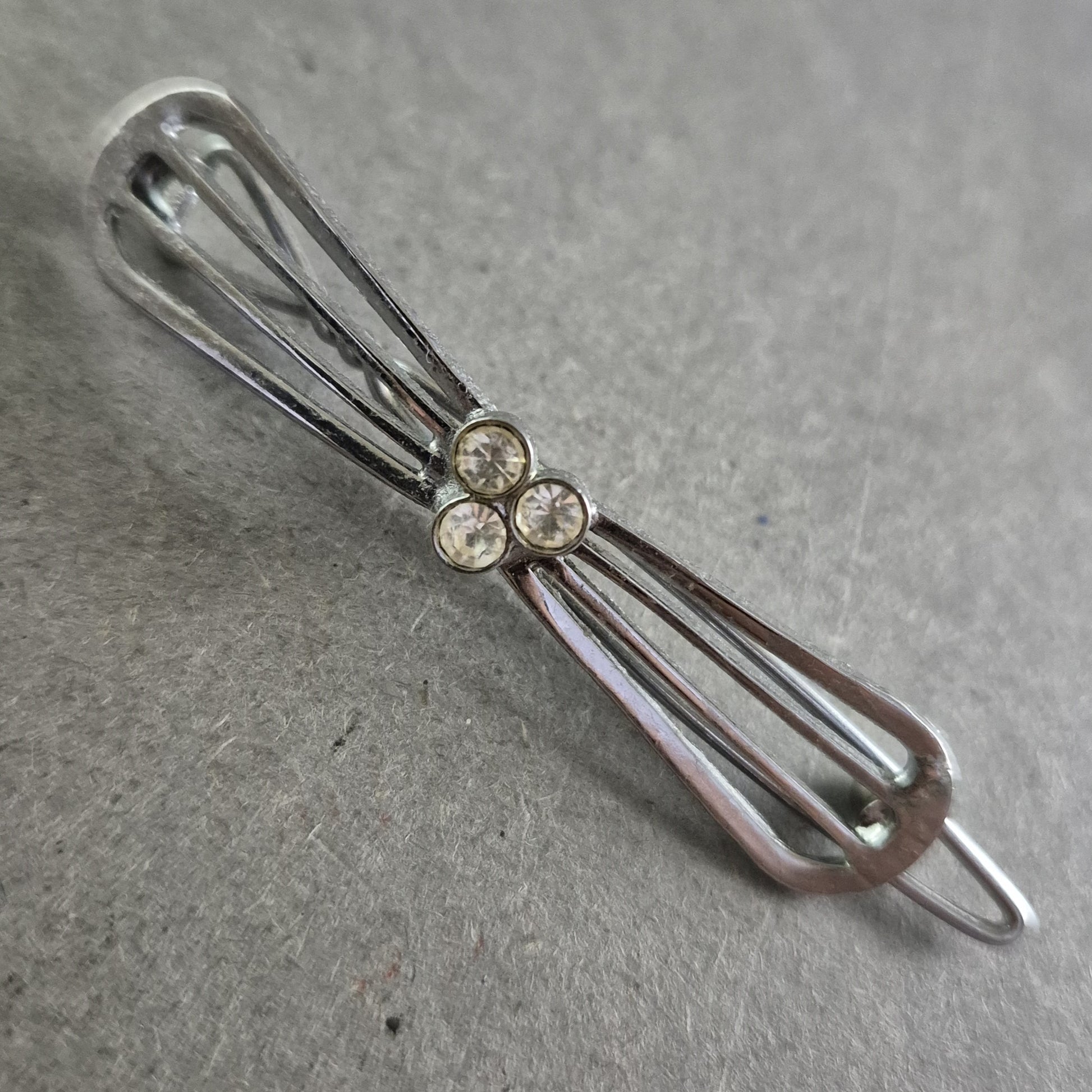Diese zarte Vintage-Brosche überzeugt durch ihr filigranes Design in Schleifenform und drei funkelnde Strasssteine in der Mitte. Die silberfarbene Metallfassung verleiht ihr eine zeitlose Eleganz und macht sie zu einem stilvollen Accessoire für verschiedenste Outfits – ob als Akzent am Blazer, Kleid oder Schal.