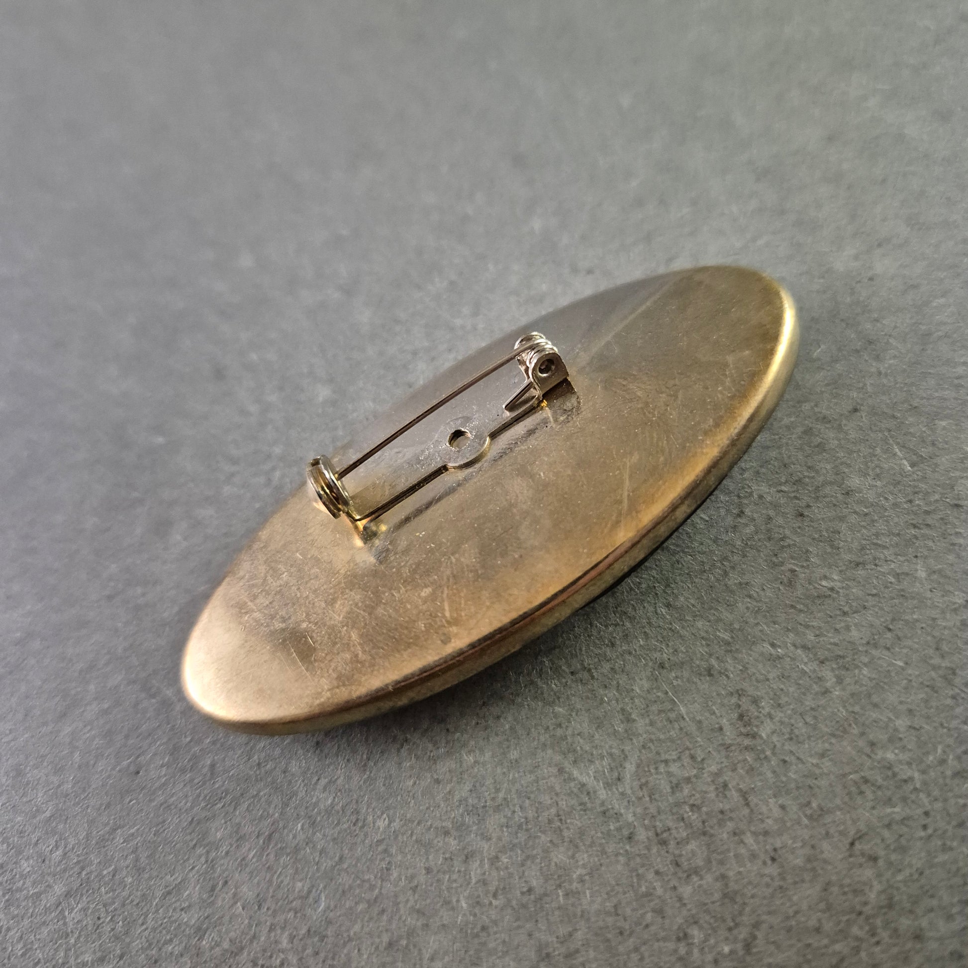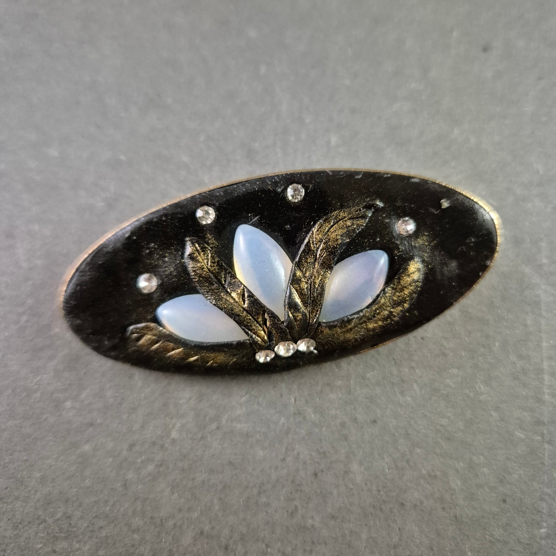 Diese ovale Vintage Brosche besticht durch ihr kunstvolles Blättermotiv, das von zarten, opalartig schimmernden Steinen und funkelnden Glaselementen verziert wird. Die Kombination aus dunklem Hintergrund und goldfarbenen Akzenten verleiht ihr eine edle und zeitlose Ausstrahlung. Ein stilvolles Accessoire, das sowohl an Jacken, Blusen als auch an Schals getragen werden kann.