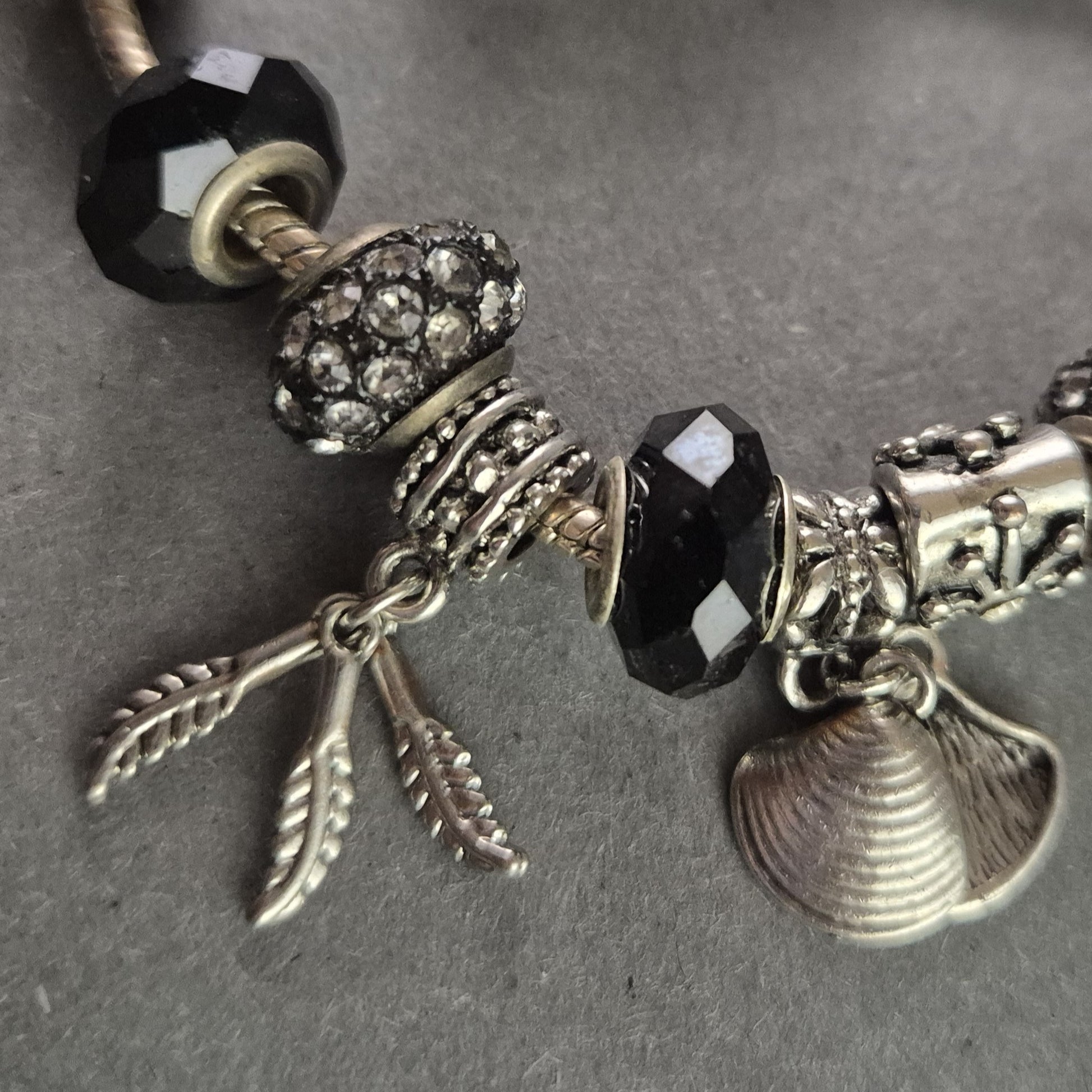 Dieses wunderschöne Vintage-Charm-Armband kombiniert stilvolle Elemente aus Silber mit funkelnden schwarzen Kristallen und filigranen Anhängern. Die hochwertigen Charms, darunter Muscheln, ein Mond und ein Pfeil, verleihen dem Armband einen individuellen, mystischen Look. Die facettierten schwarzen Glasperlen sorgen für zusätzlichen Glanz und Eleganz. Ein ideales Schmuckstück für Liebhaber einzigartiger Accessoires mit persönlicher Note.