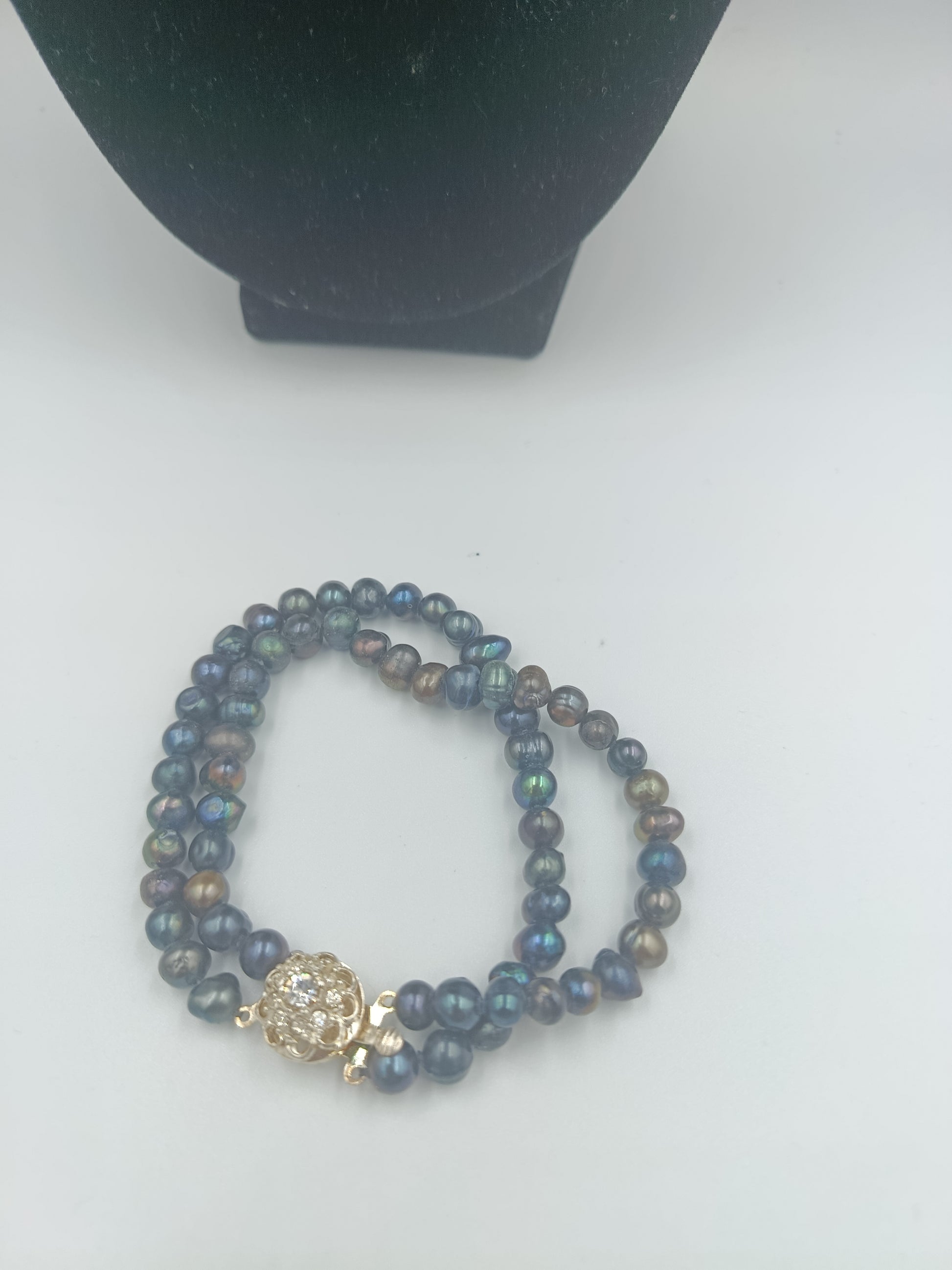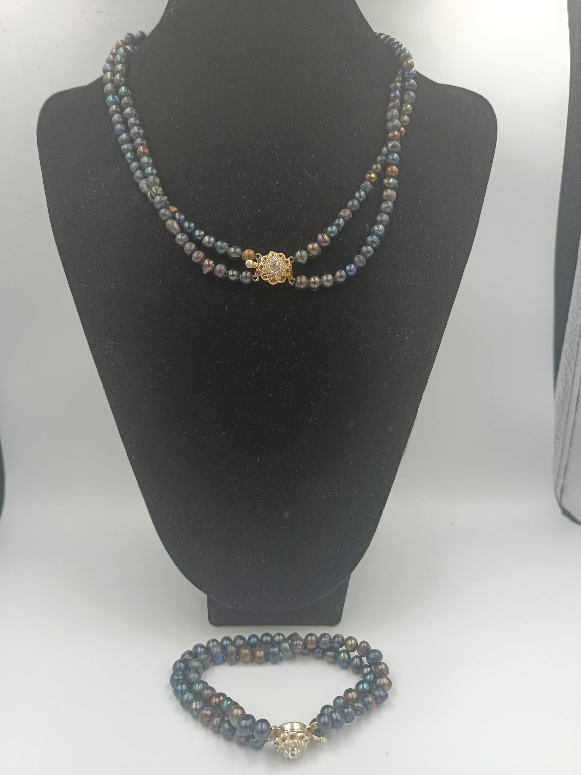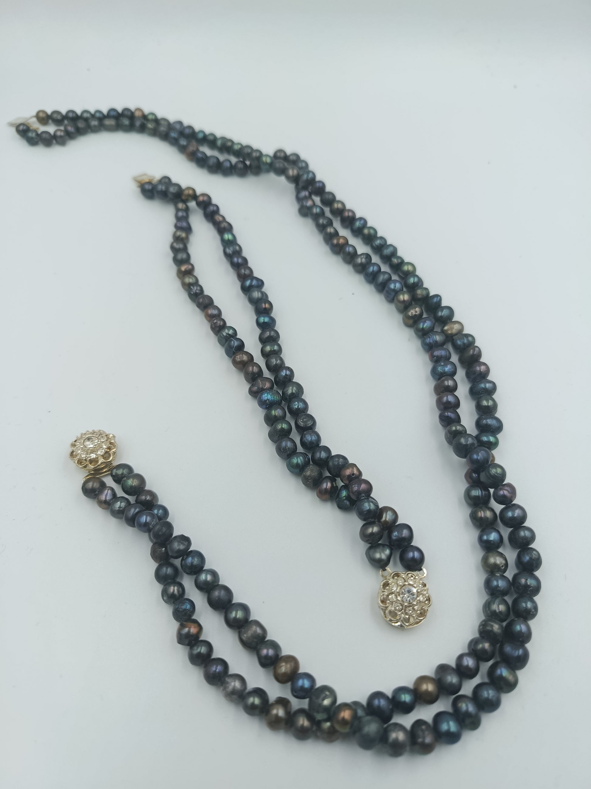 Dieses stilvolle Schmuck-Set besteht aus einer langen doppelreihigen Kette und einem passenden Armband, gefertigt aus schimmernden dunkel schokobraunen bis schwarzblauen Perlen. Beide Stücke sind mit dekorativen Strass-Schließen in floraler Optik versehen, die dem Set eine glamouröse Note verleihen. Ein zeitloser Klassiker, der sowohl festlich als auch elegant im Alltag getragen werden kann.