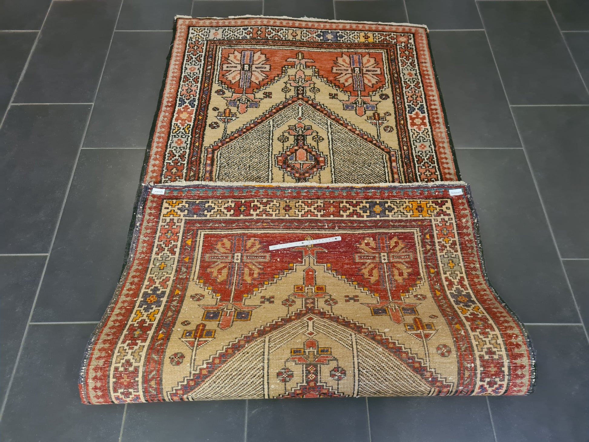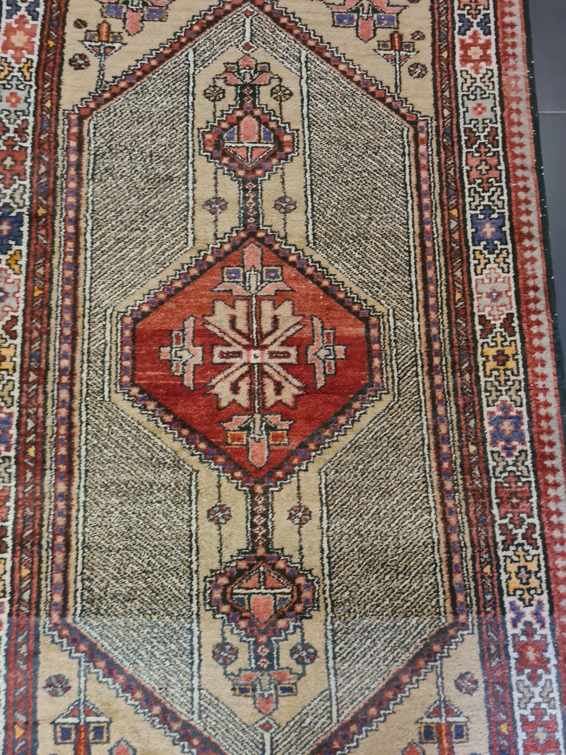 zum Verkauf steht ein antiker handgeknüpfter Perserteppich aus der Region Heris (Iran), gearbeitet als klassischer Läufer. Der Teppich besticht durch seine fein abgestimmte Musterung und die charakteristische Farbgebung, die typisch für Heris-Knüpfungen ist. Ein authentisches Stück traditioneller Handwerkskunst, das sich sowohl als Sammlerobjekt wie auch als stilvoller Bodenbelag eignet.
