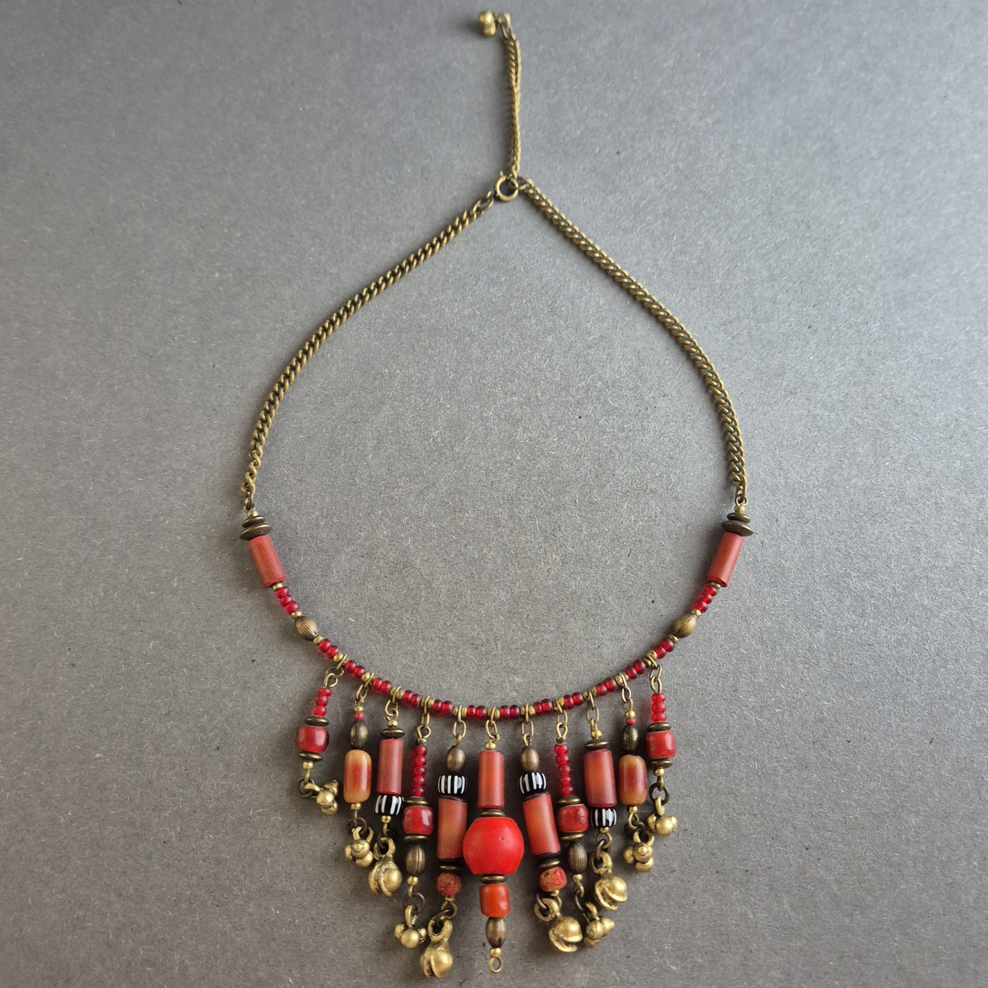 Diese handgefertigt wirkende Vintage-Kette verbindet kräftige Rottöne mit warmem Messing. Die verschiedenen Glasperlen und zierlichen Anhänger ergeben ein harmonisches und lebendiges Design im Ethno- oder Boho-Stil. Ideal für alle, die ausdrucksstarken, individuellen Schmuck lieben – ob zum Festival, Sommerkleid oder Alltagslook.