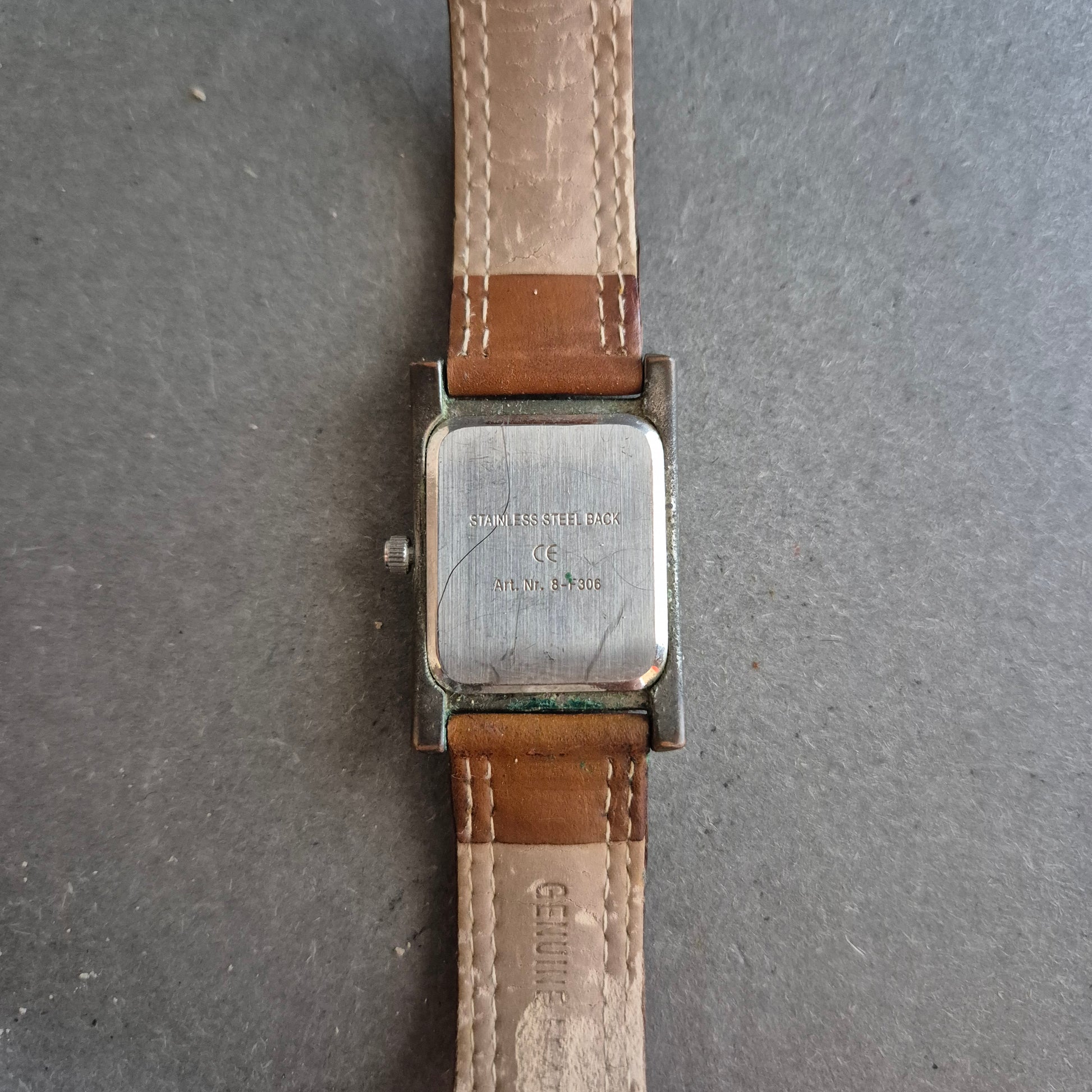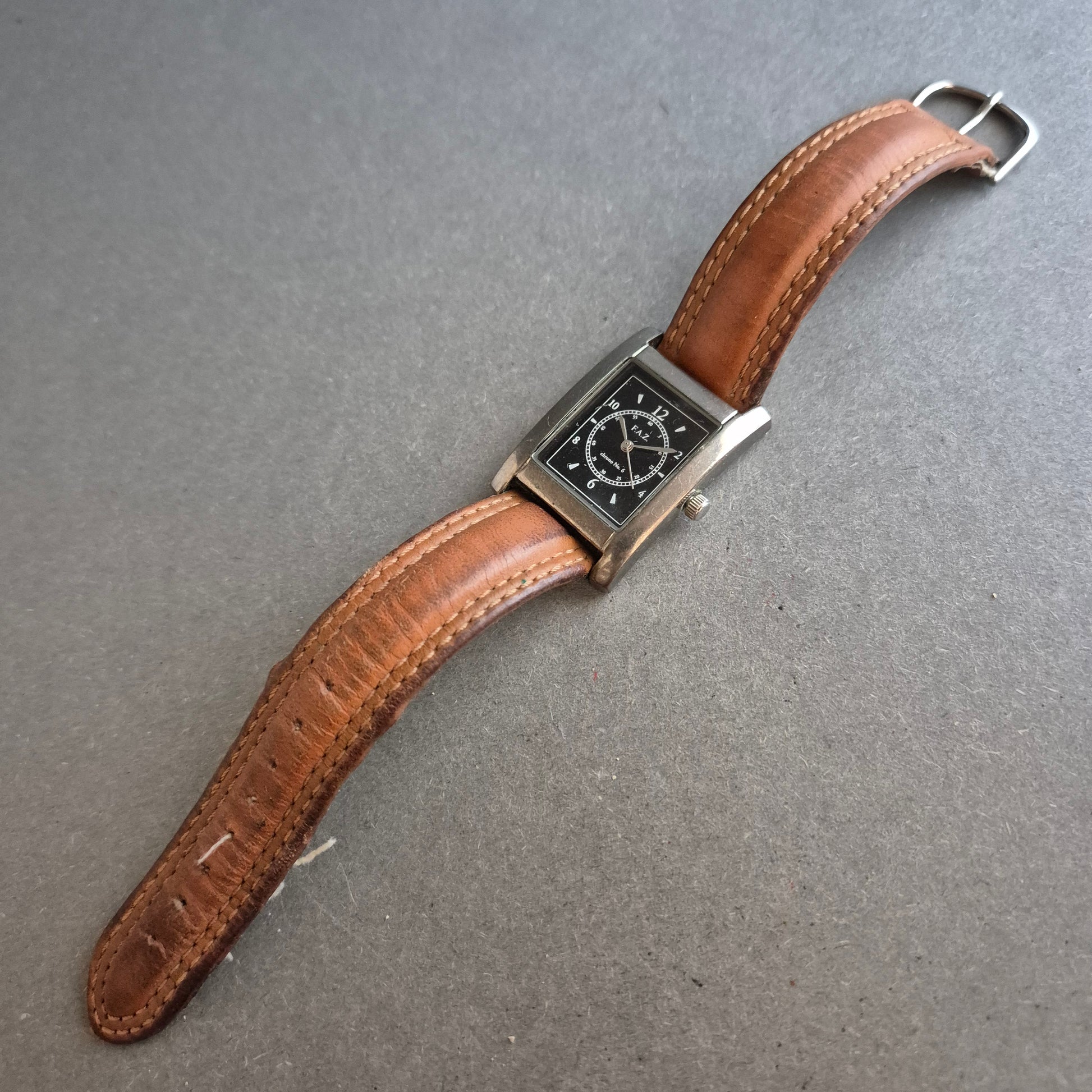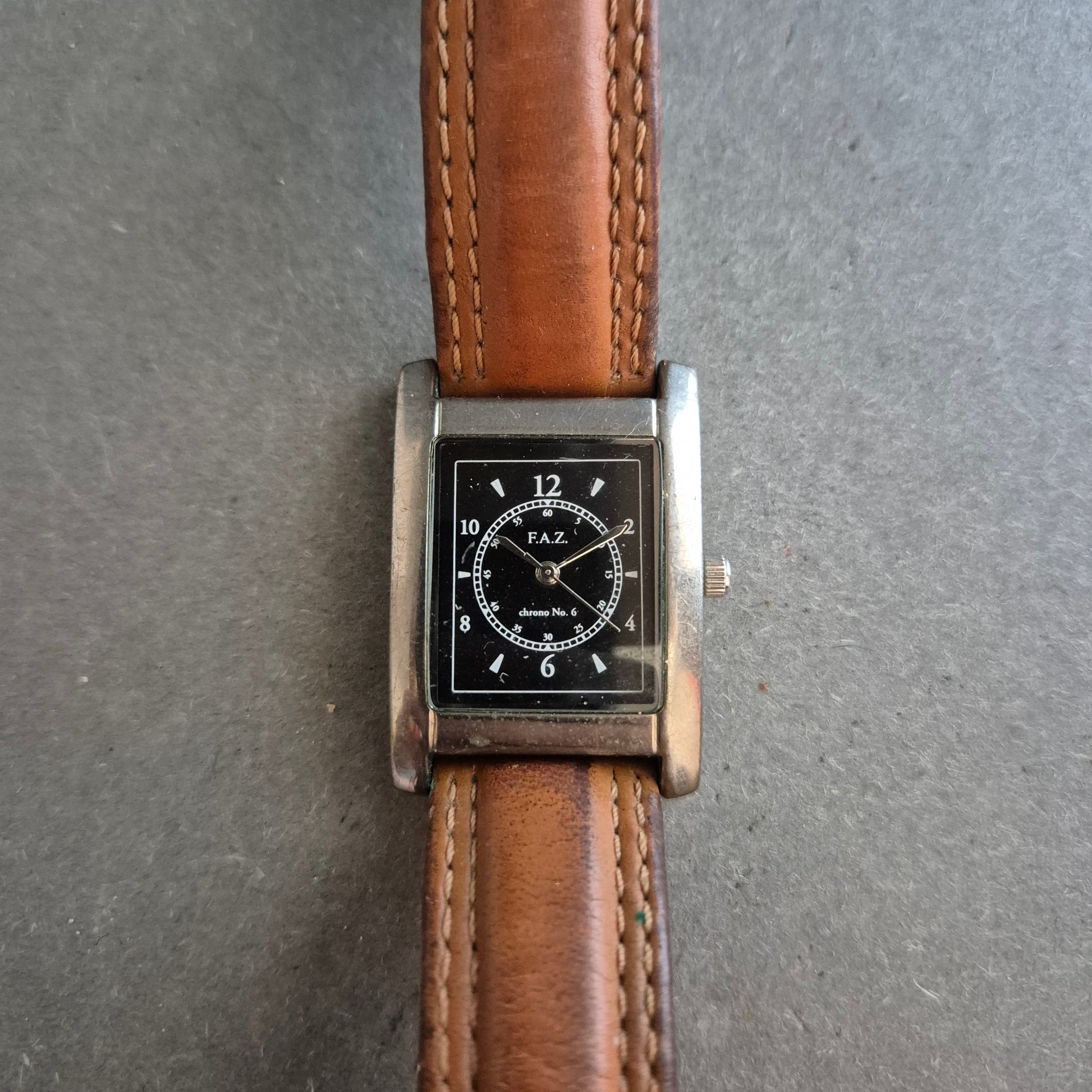 Die F.A.Z. Chrono No. 6 Herrenarmbanduhr besticht durch ihr klassisches Design und hochwertige Verarbeitung. Das rechteckige Gehäuse aus Edelstahl harmoniert perfekt mit dem schwarzen Zifferblatt, das durch weiße arabische Ziffern und silberfarbene Zeiger eine hervorragende Ablesbarkeit bietet. Das braune Lederarmband verleiht der Uhr einen zeitlosen Charme und sorgt für angenehmen Tragekomfort.