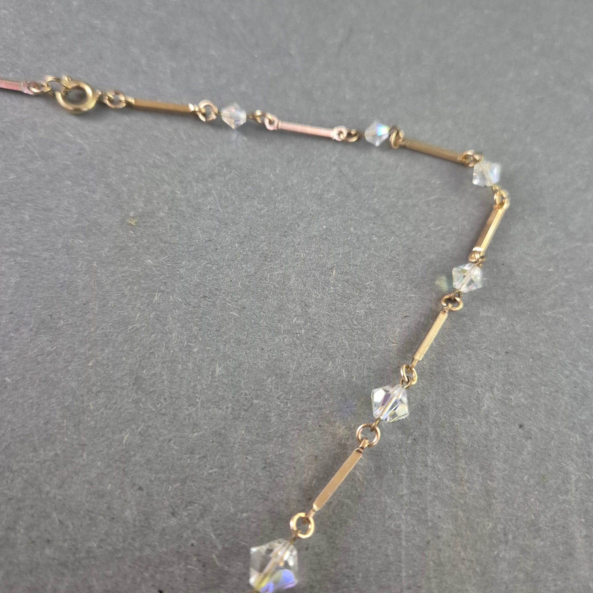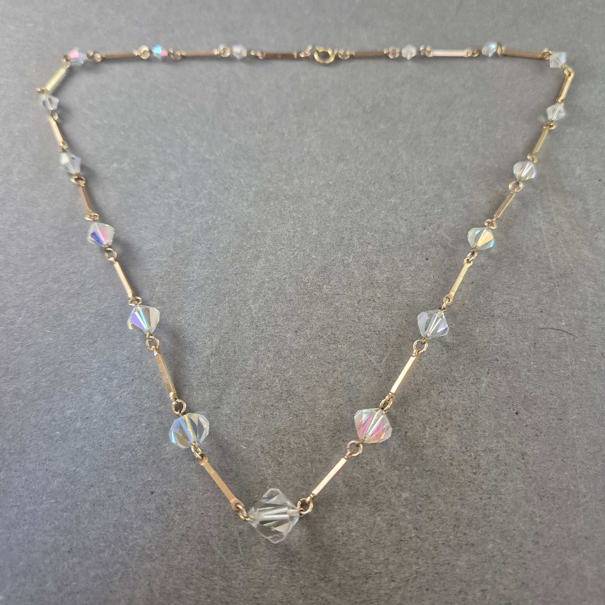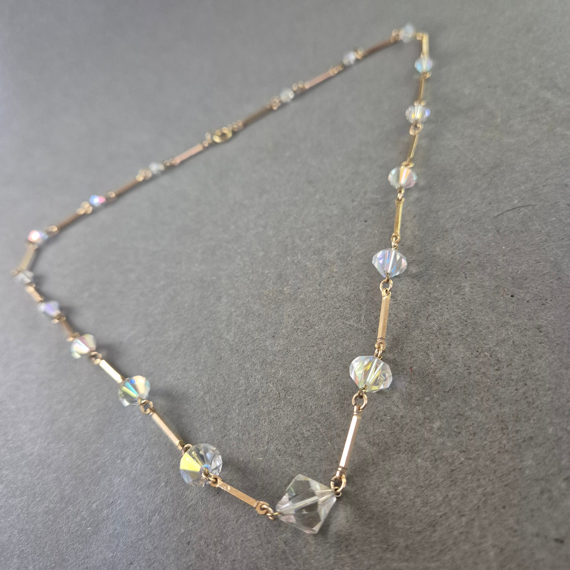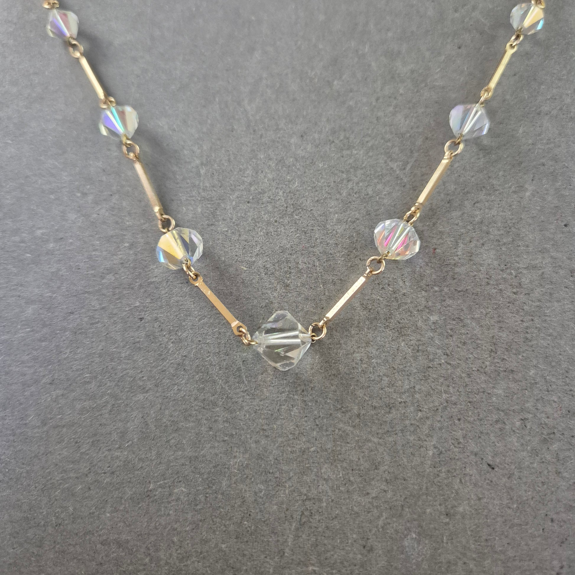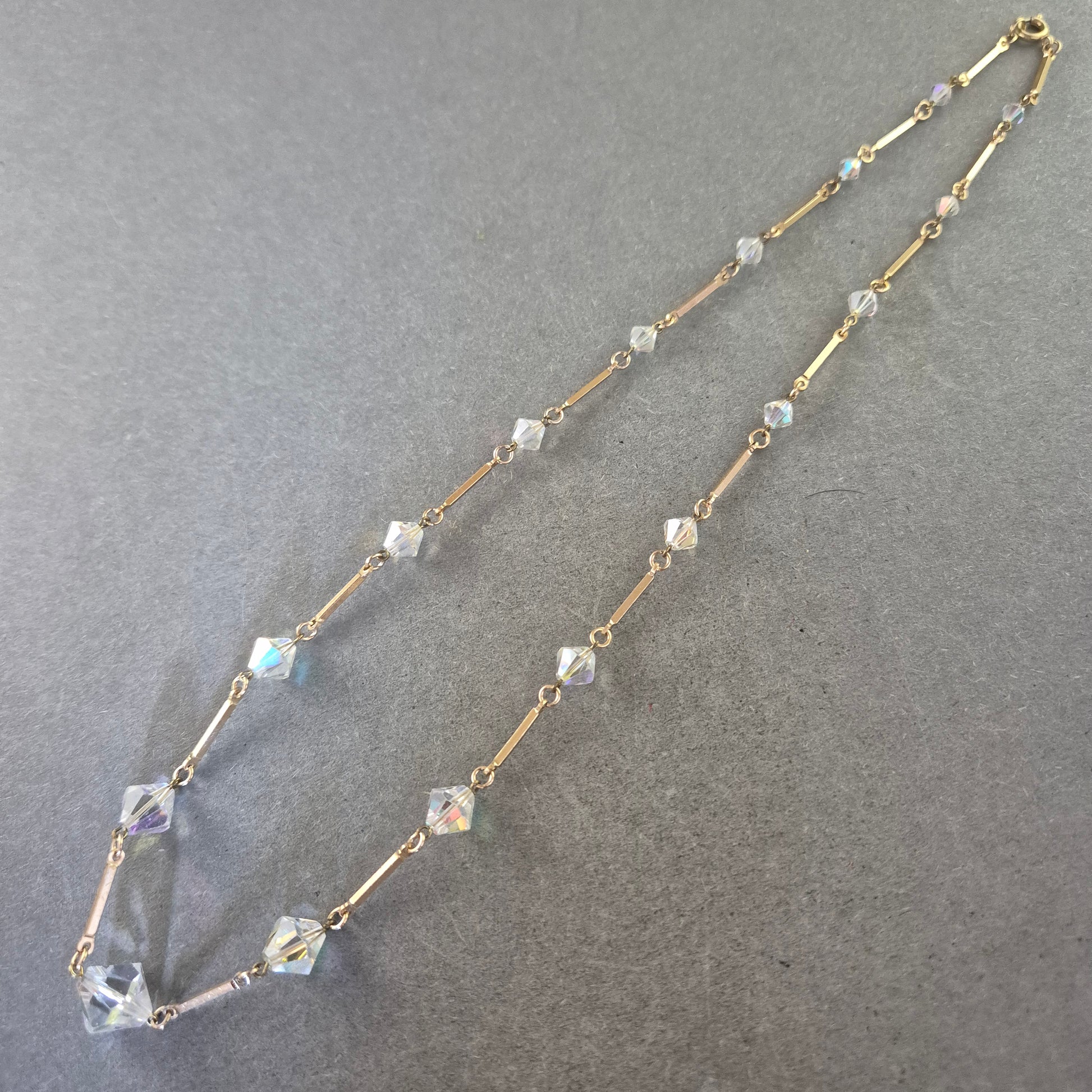Diese zarte Halskette vereint funkelnde, facettierte Kristallperlen mit schlanken goldfarbenen Zwischenelementen. Die Kristalle schimmern in irisierenden Farben, je nach Lichteinfall, und verleihen der Kette eine elegante und zugleich verspielte Ausstrahlung. Dank des leichten Designs eignet sich dieses Schmuckstück perfekt für den Alltag, aber auch als feines Accessoire zu festlichen Outfits.