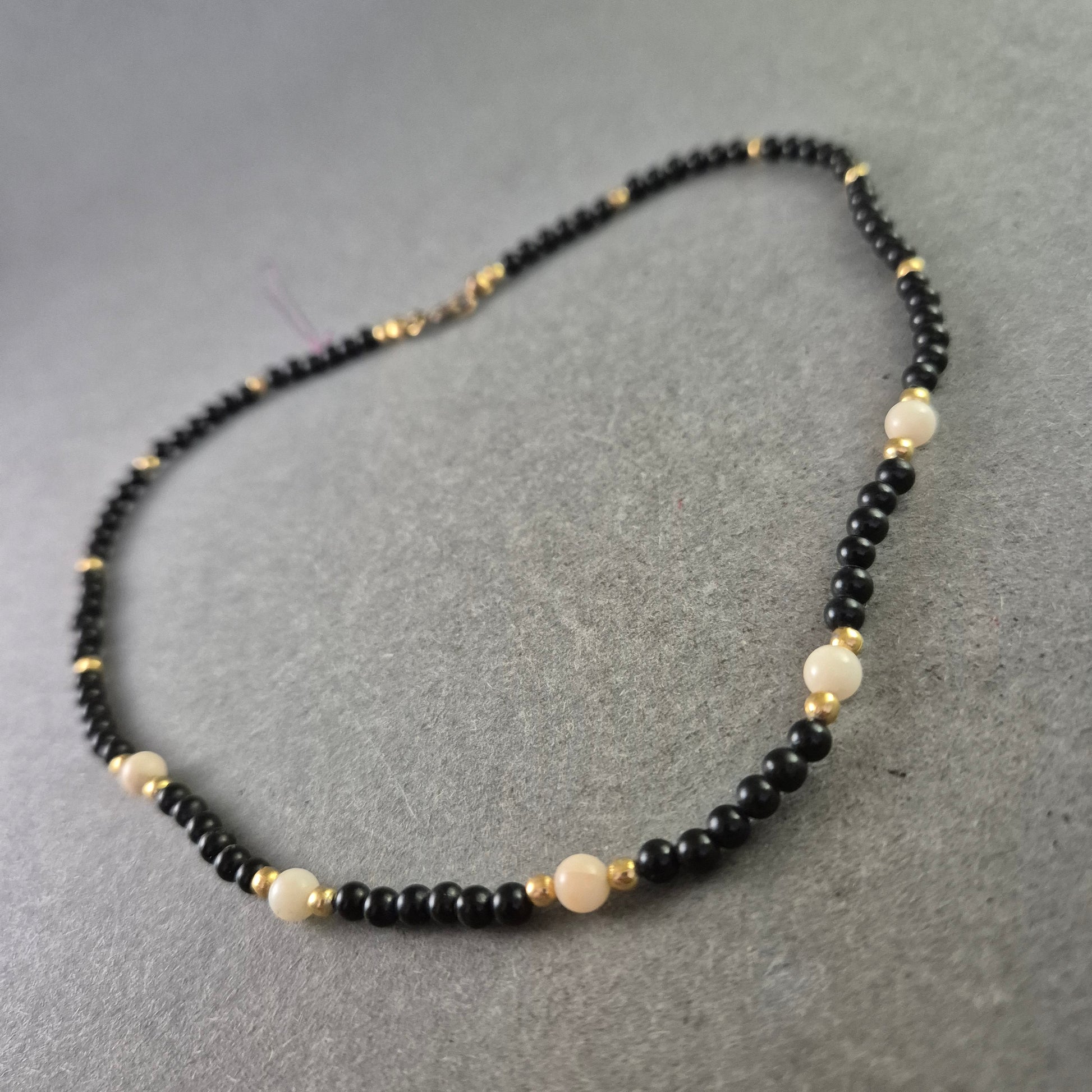 Diese elegante Halskette kombiniert glänzende schwarze Glasperlen mit zart schimmernden weißen Perlen und kleinen goldfarbenen Zwischenelementen. Die ausgewogene Anordnung der Farben verleiht der Kette eine edle und zugleich moderne Ausstrahlung – perfekt für dezente Akzente im Alltag oder als stilvoller Abschluss für besondere Outfits.