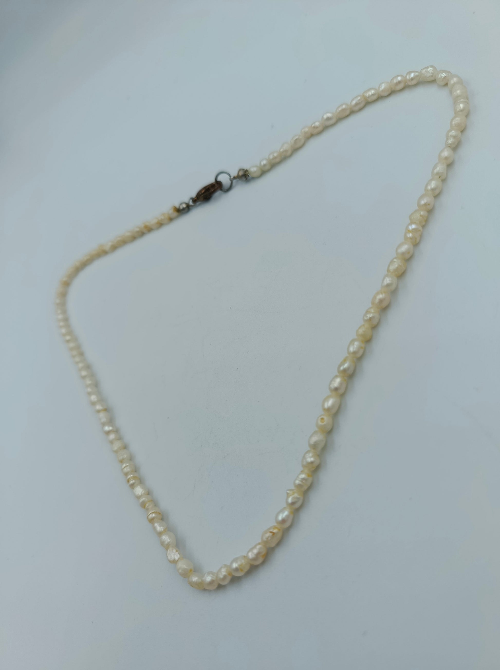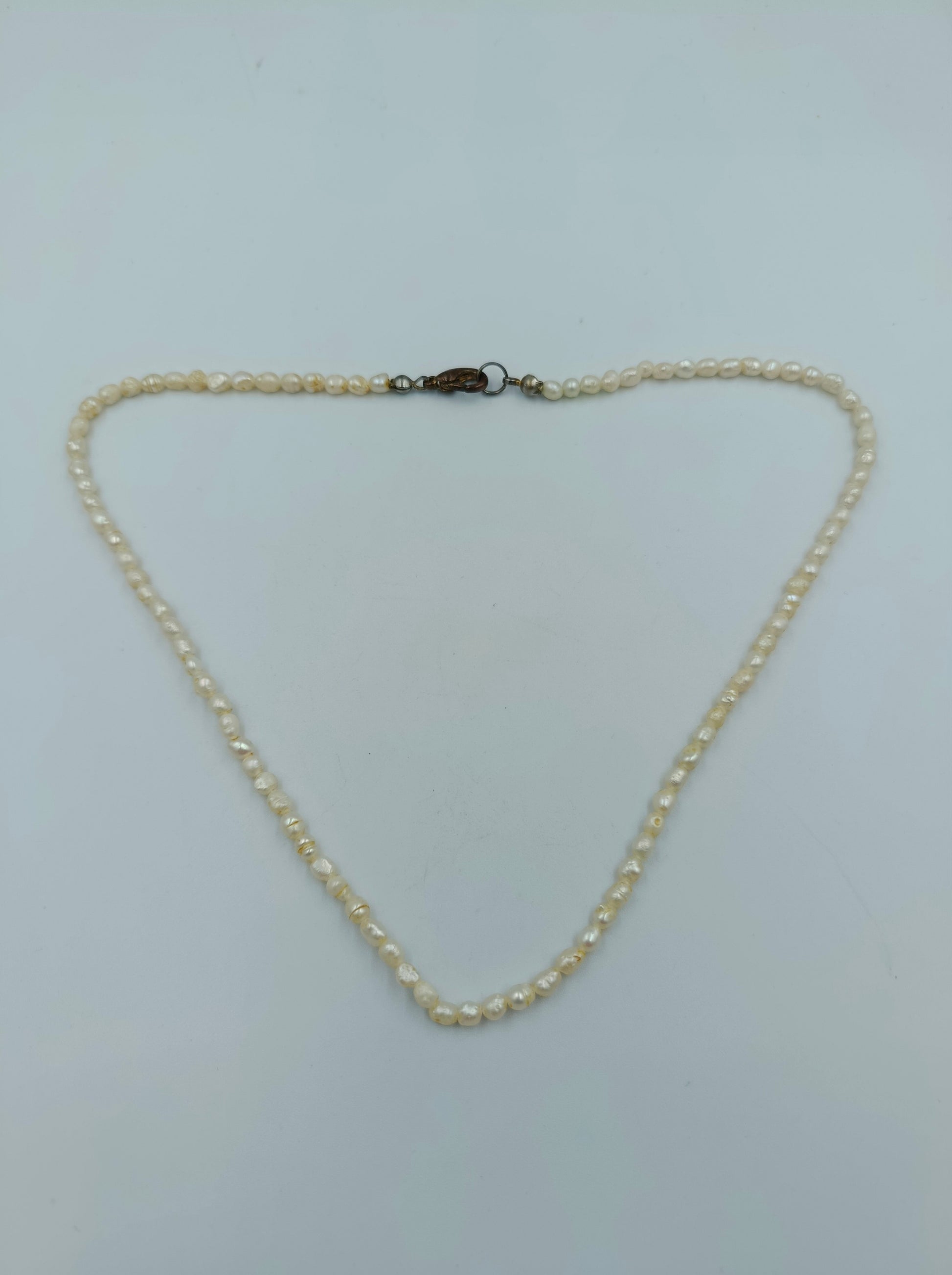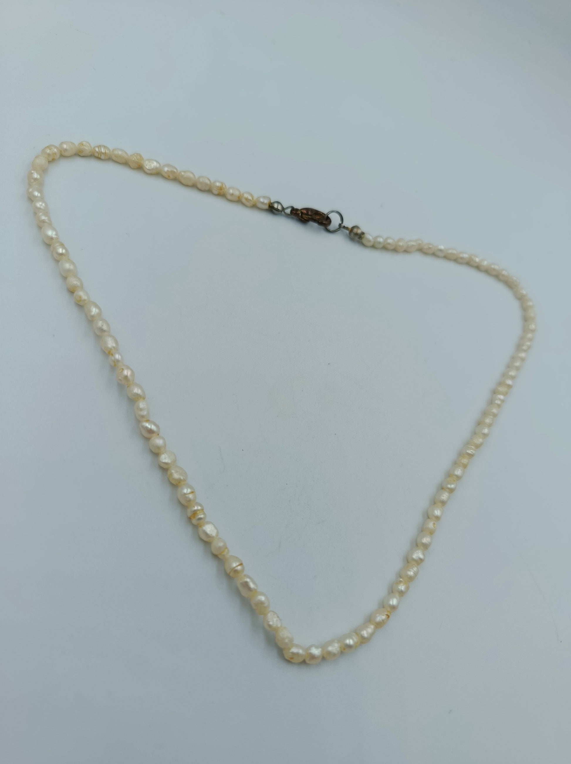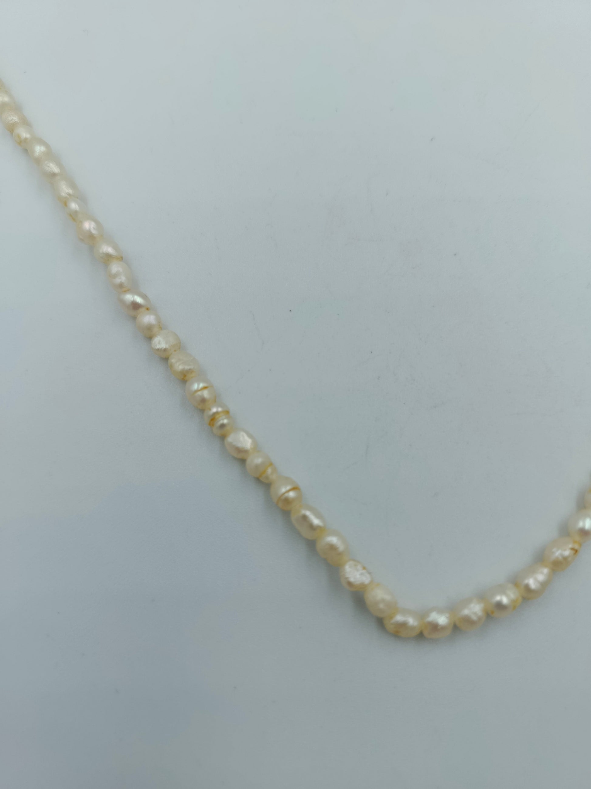 Diese elegante Kette besteht aus kleinen, unregelmäßig geformten Süßwasserperlen in zartem Weiß. Die Perlen verleihen der Kette ihren natürlichen, authentischen Charakter und machen sie zu einem zeitlosen Schmuckstück. Verschlossen wird die Kette mit einem klassischen, leicht antiken Verschluss. Ideal als dezentes Accessoire für den Alltag oder als eleganter Begleiter zu besonderen Anlässen.