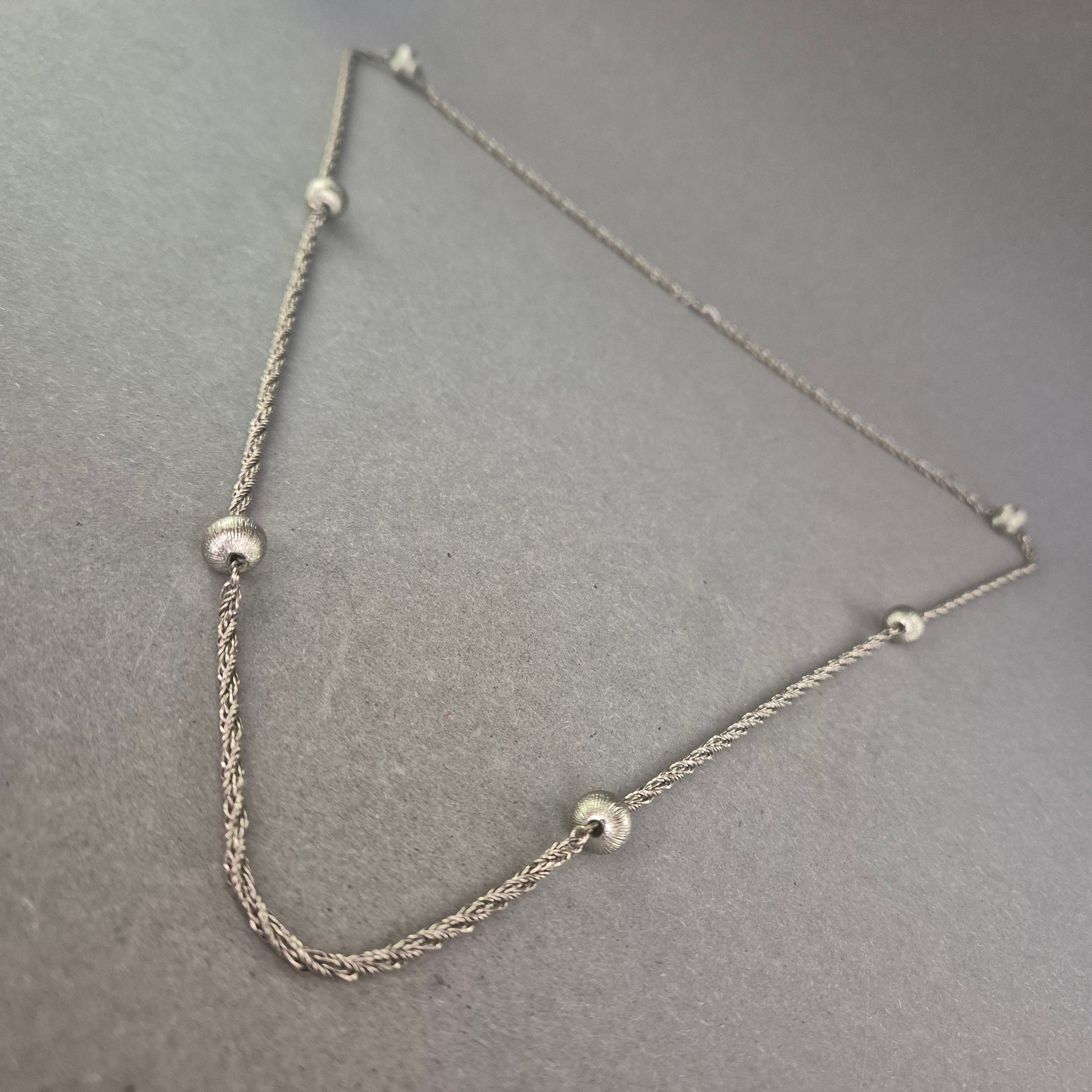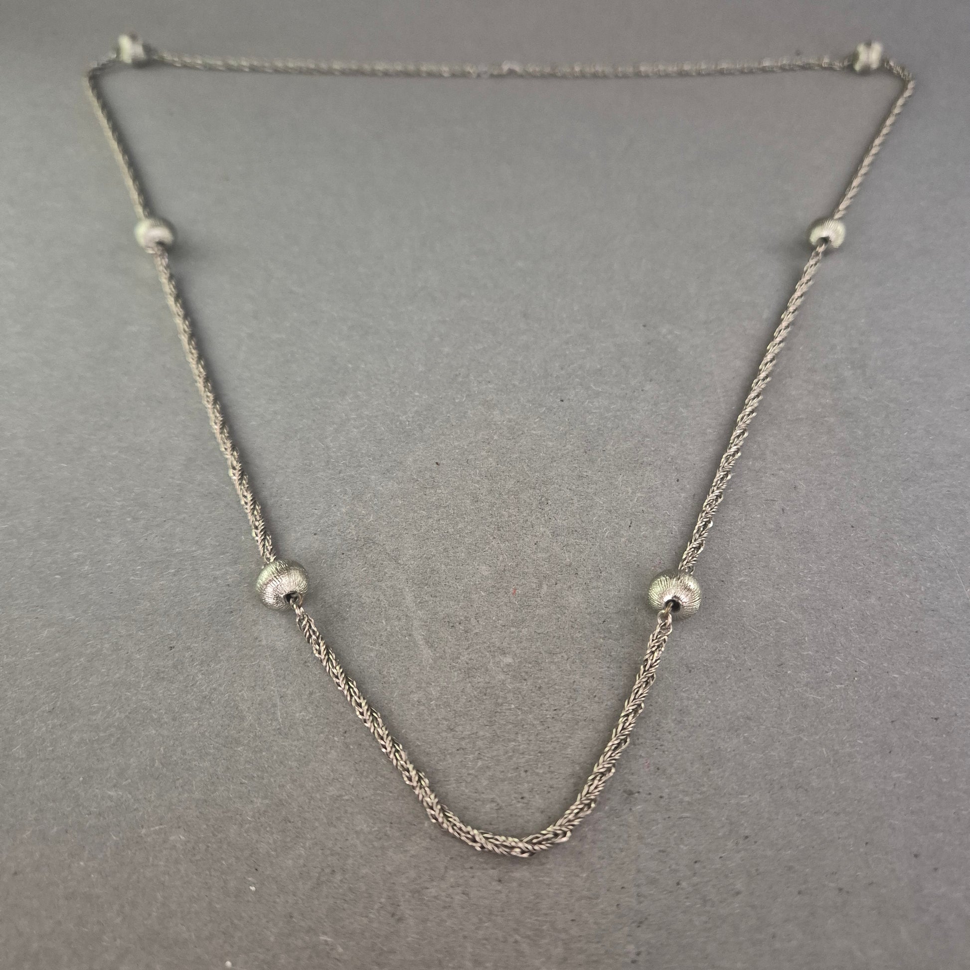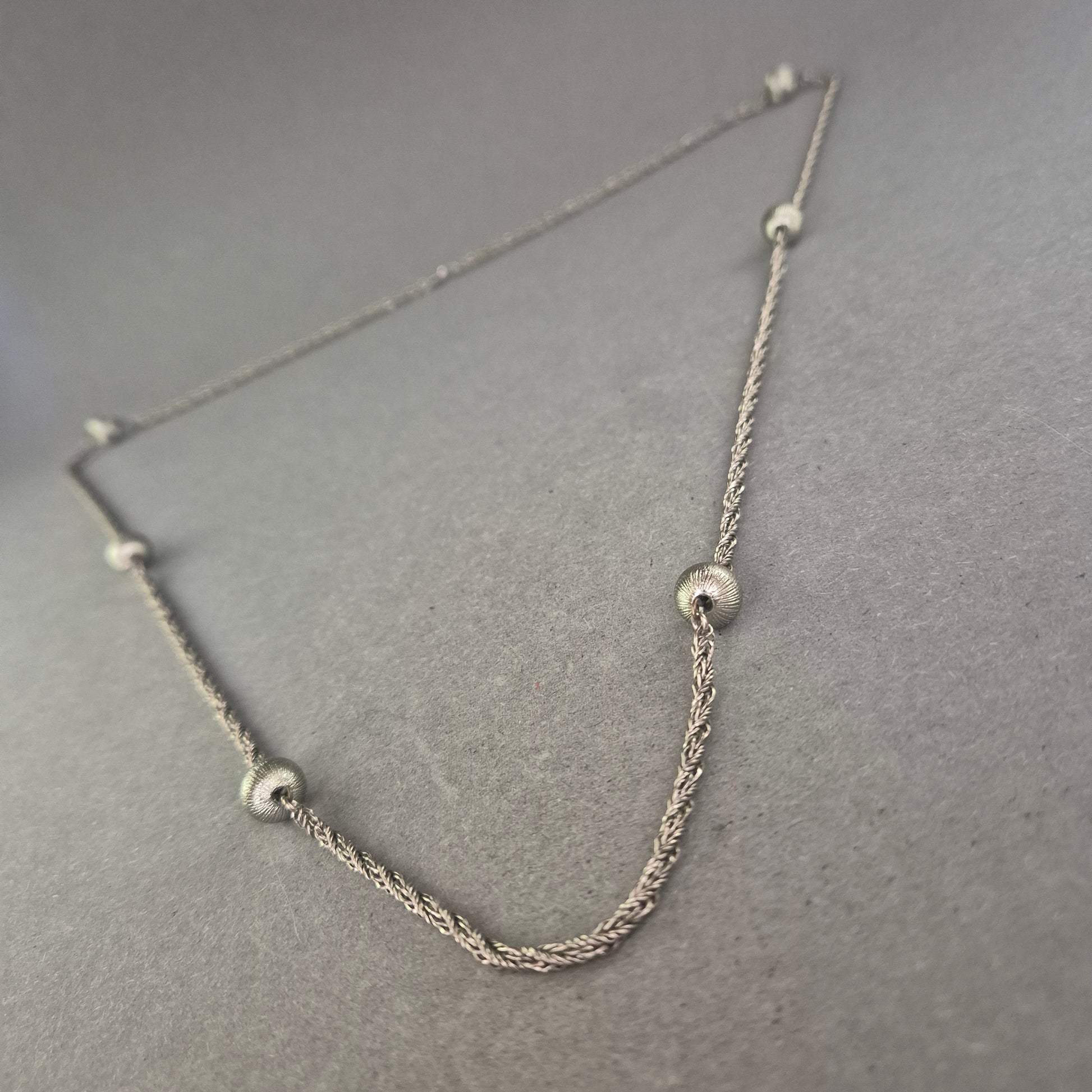 Diese elegante Vintage-Halskette überzeugt durch ihr zartes, geflochtenes Kettendesign in silberfarbener Optik und ist mit regelmäßig platzierten, strukturierten Kugeln verziert. Die Kombination aus Leichtigkeit und Struktur macht sie zum idealen Accessoire für Alltag und Abendgarderobe. Ein klassisches Schmuckstück mit dezentem Charme.