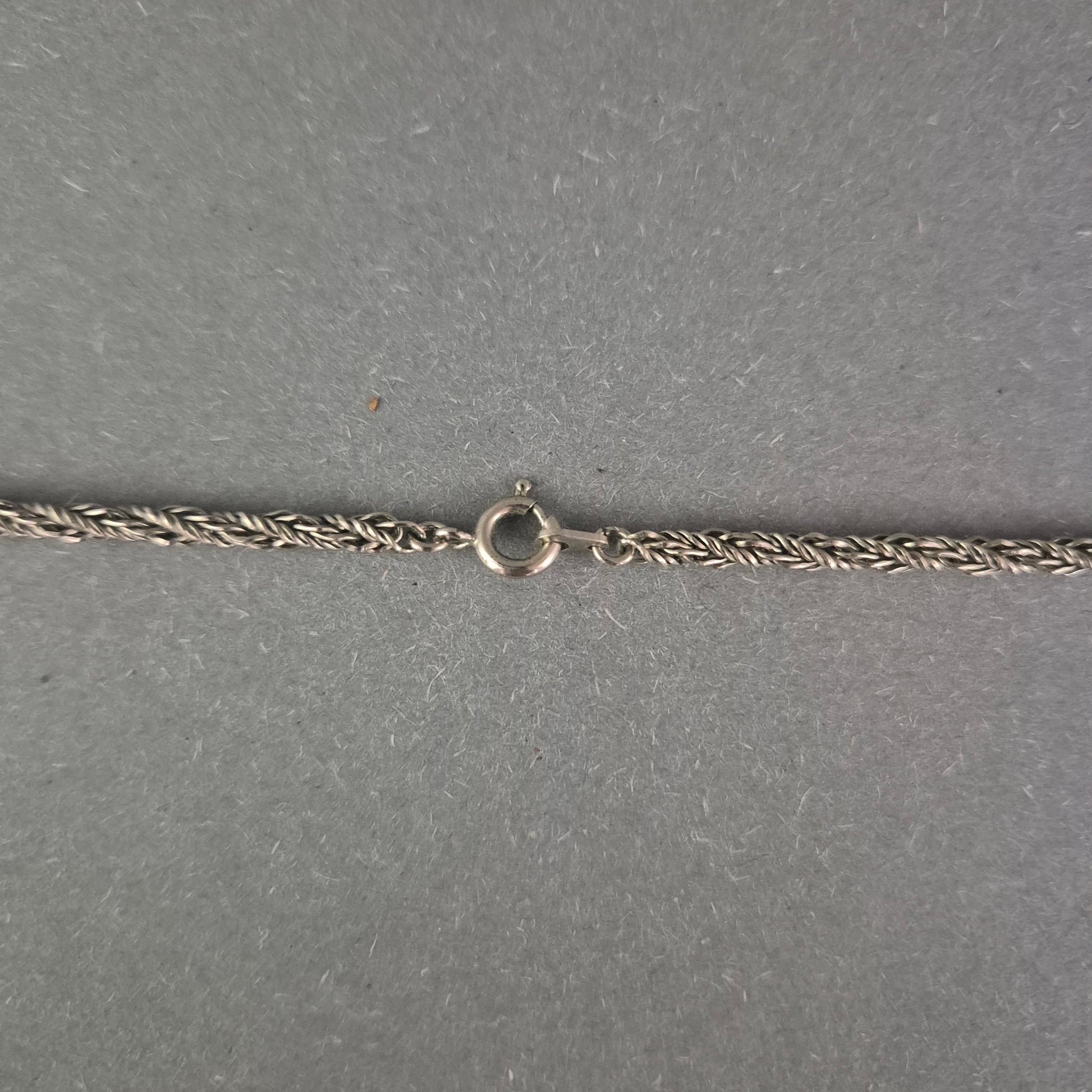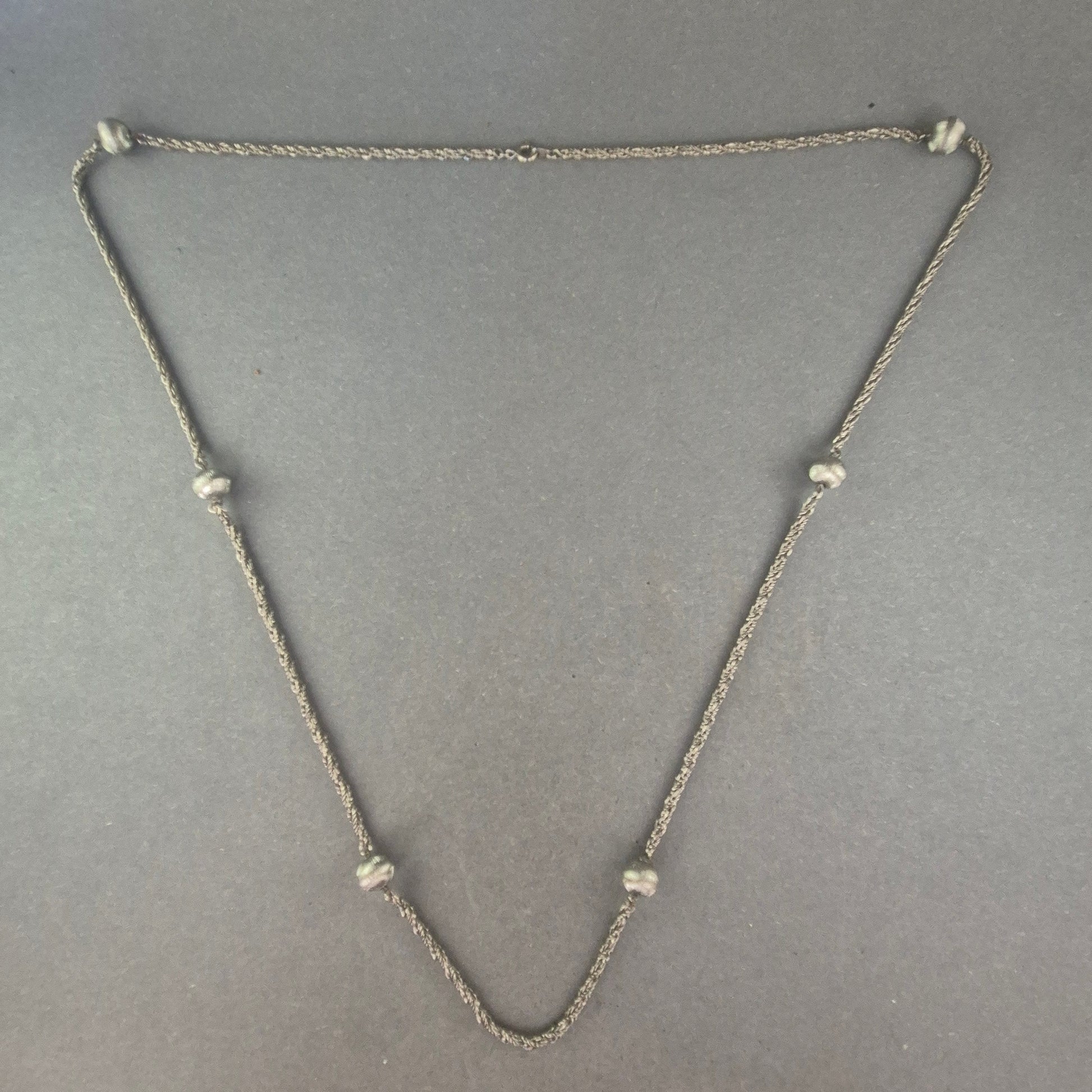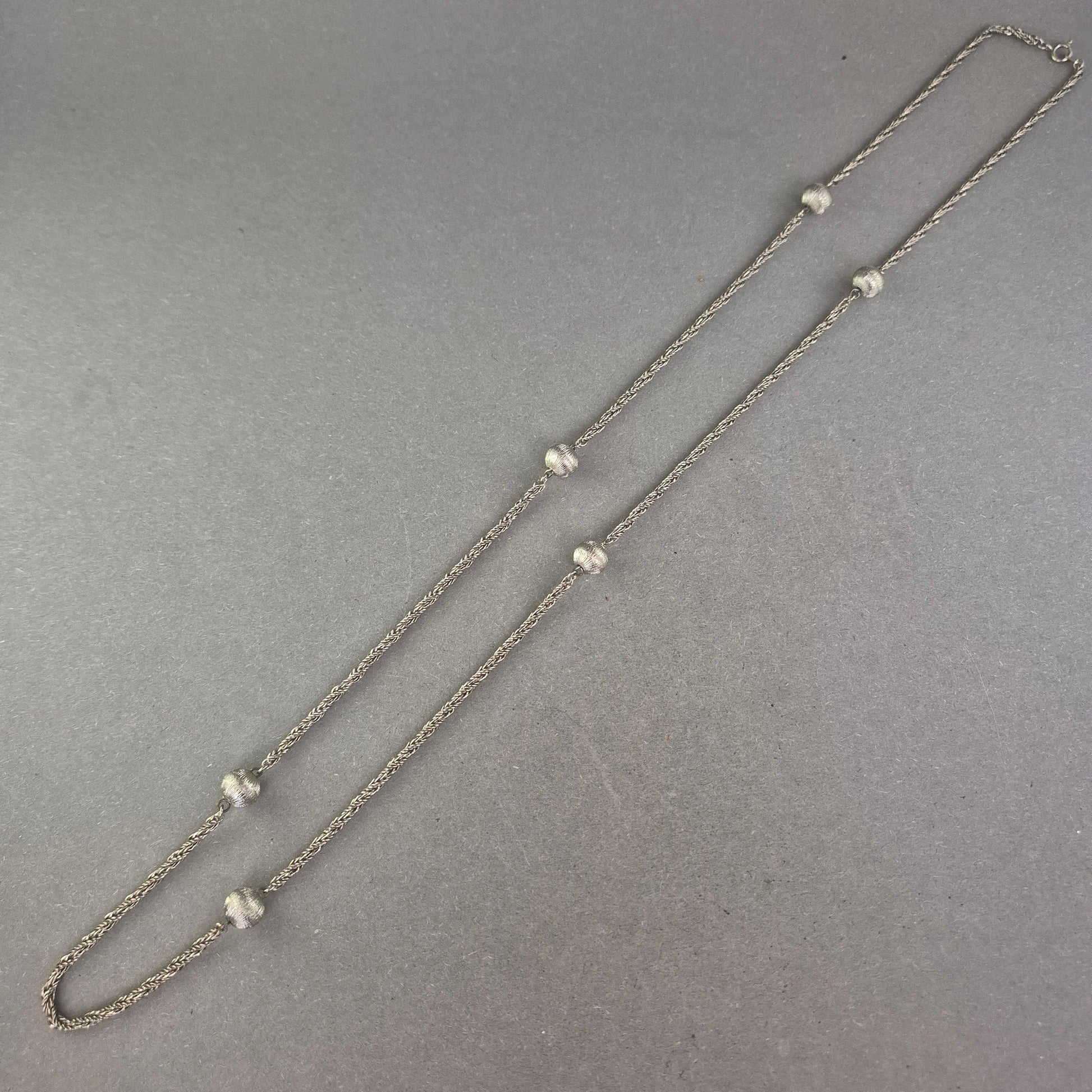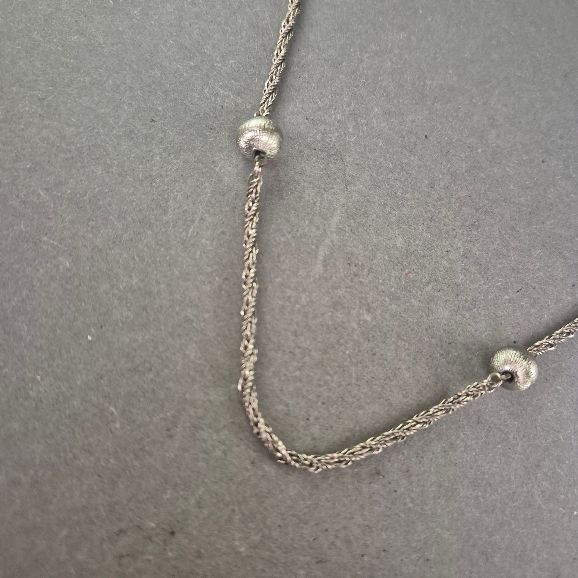 Diese elegante Vintage-Halskette überzeugt durch ihr zartes, geflochtenes Kettendesign in silberfarbener Optik und ist mit regelmäßig platzierten, strukturierten Kugeln verziert. Die Kombination aus Leichtigkeit und Struktur macht sie zum idealen Accessoire für Alltag und Abendgarderobe. Ein klassisches Schmuckstück mit dezentem Charme.