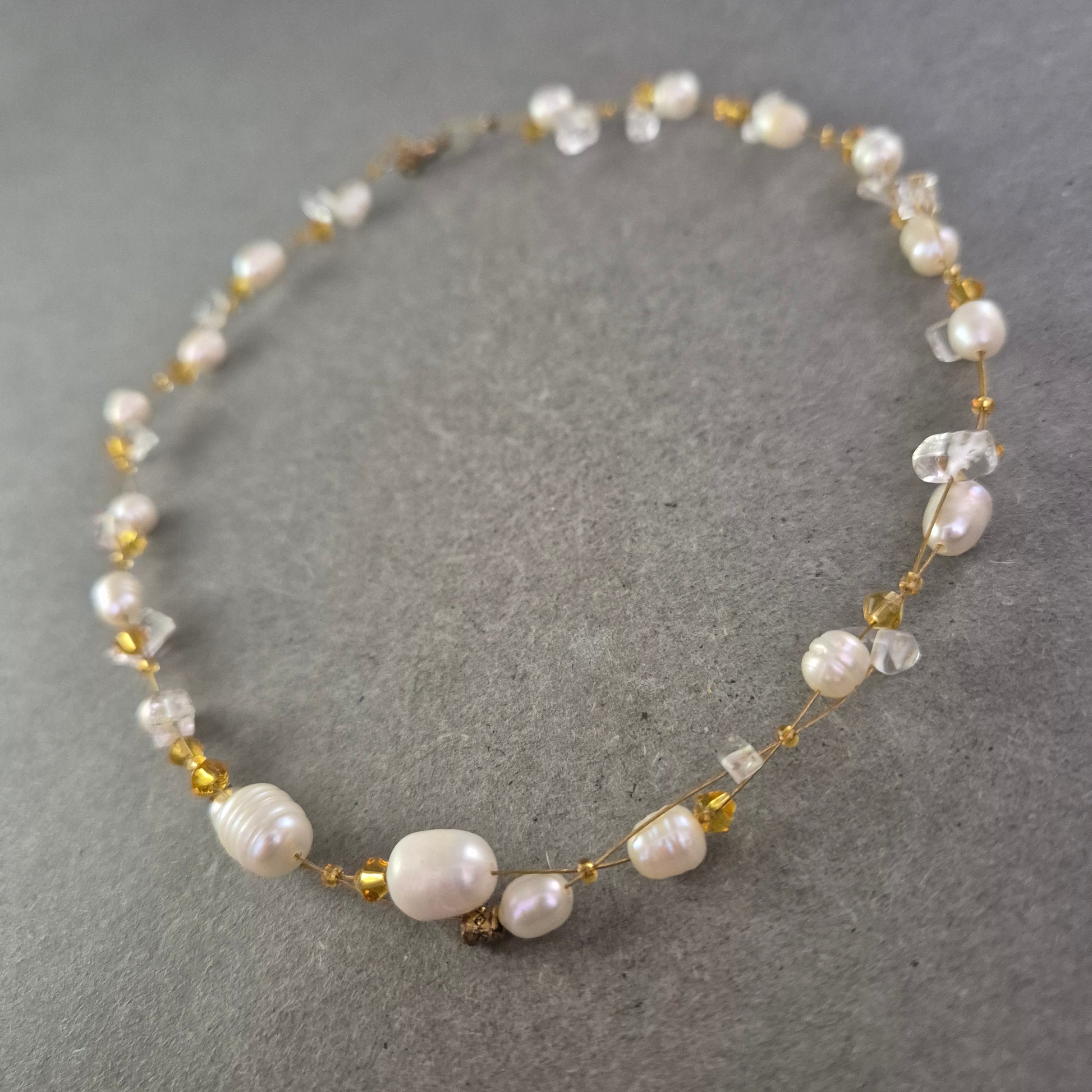 Diese zarte Halskette kombiniert unregelmäßig geformte Süßwasserperlen mit transparenten Glassteinen und goldfarbenen Perlen zu einem eleganten Ensemble. Der filigrane Faden verleiht der Kette eine schwebende Optik, während der dezente Karabinerverschluss für sicheren Halt sorgt. Perfekt für leichte Sommerlooks oder als stilvoller Akzent zu festlicher Kleidung.