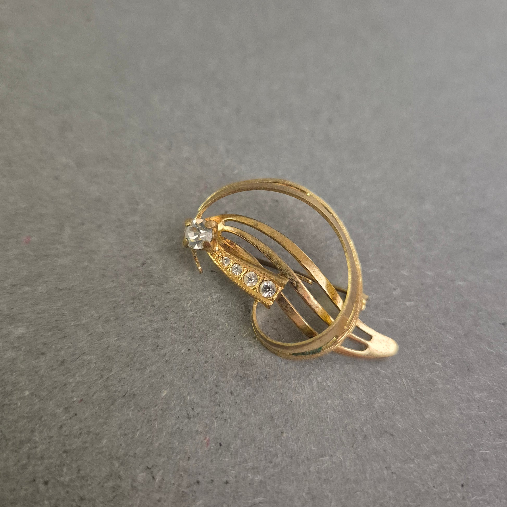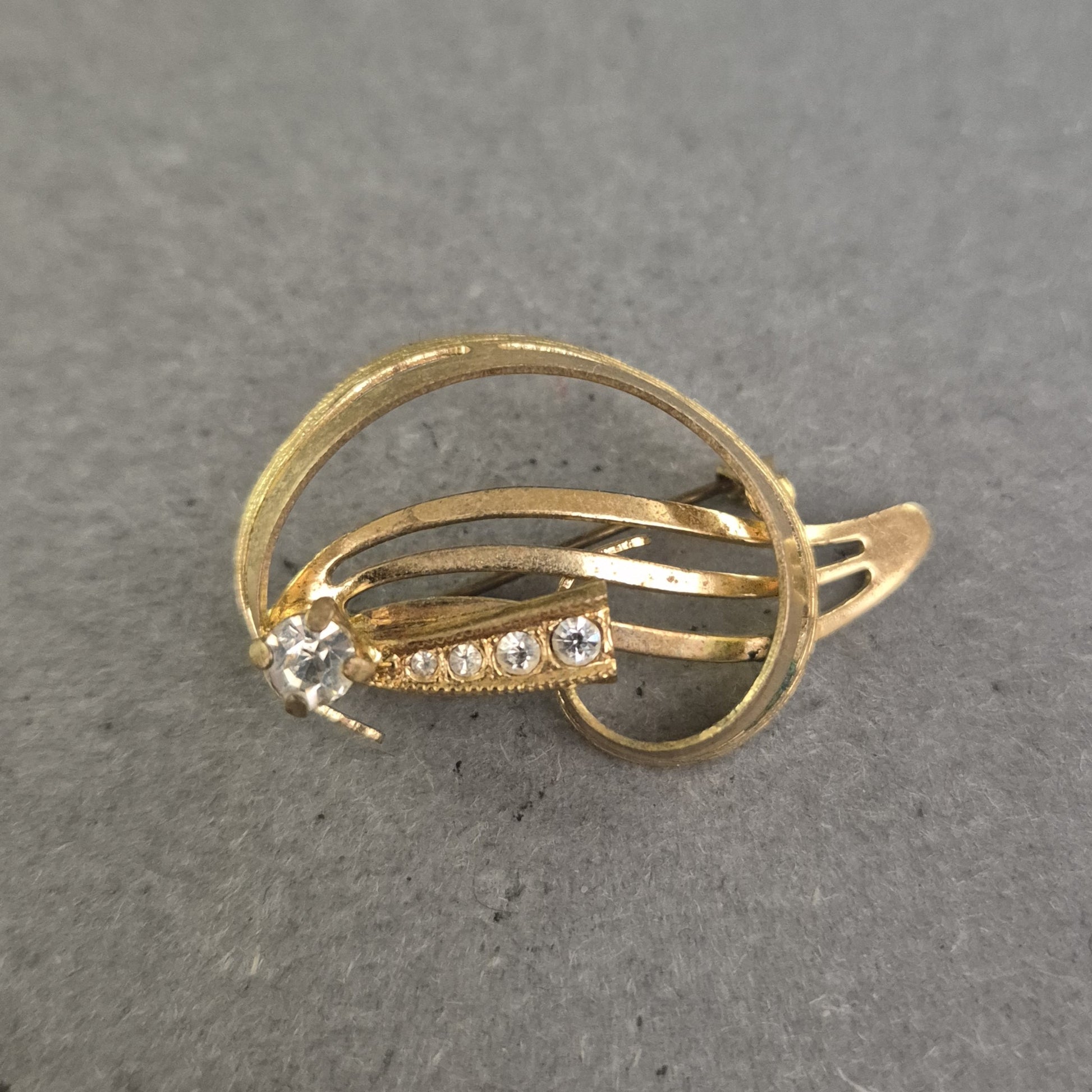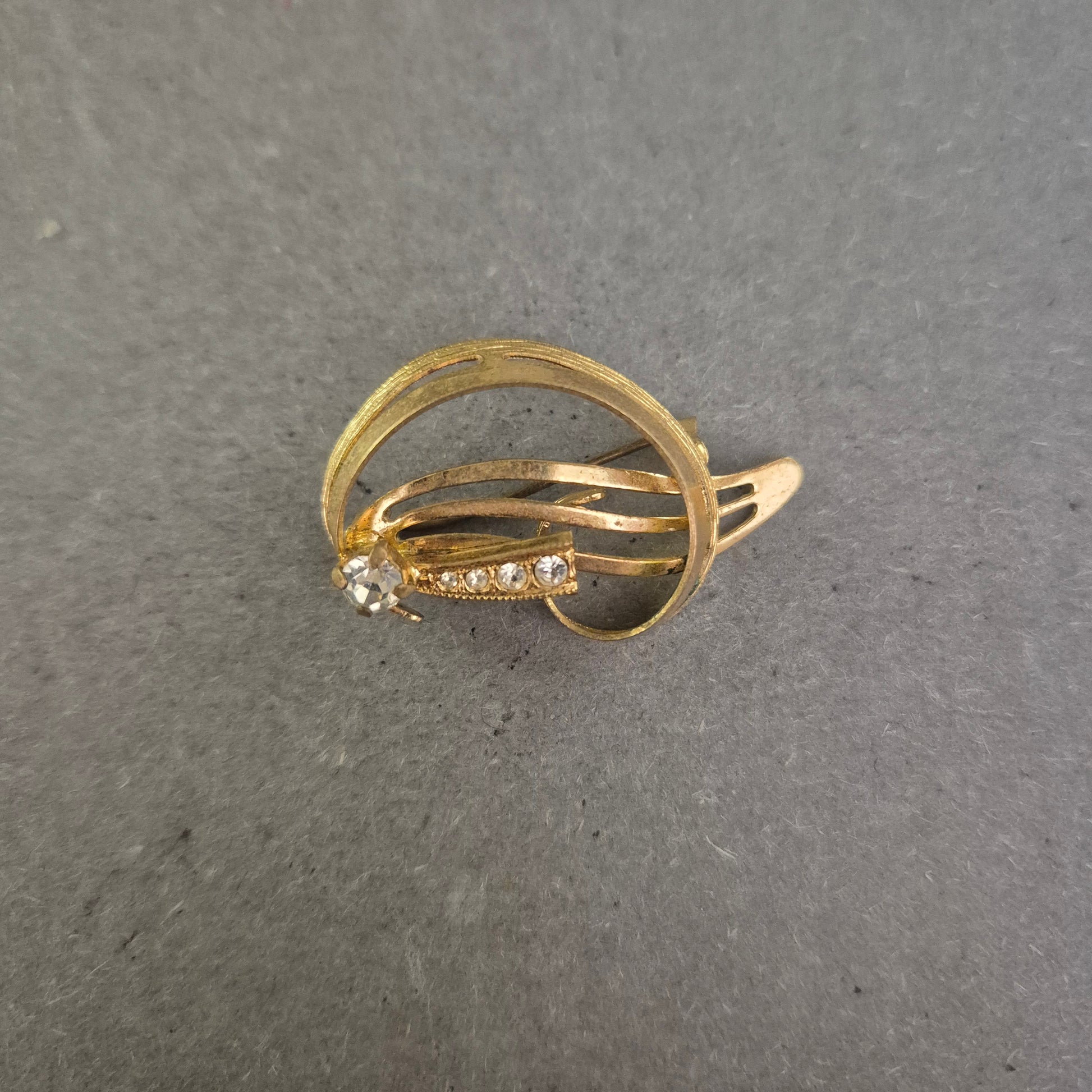 Diese elegante Vintage-Brosche bezaubert mit einem geschwungenen, offenen Design in glänzender Goldoptik. Die Kombination aus zarten Linien und funkelnden Strasssteinen sorgt für eine harmonische Balance aus Schlichtheit und Glamour. Ideal als stilvolles Accessoire für Blusen, Kleider oder Schals – ein echtes Highlight für Liebhaberinnen von zeitlos schönem Schmuck.