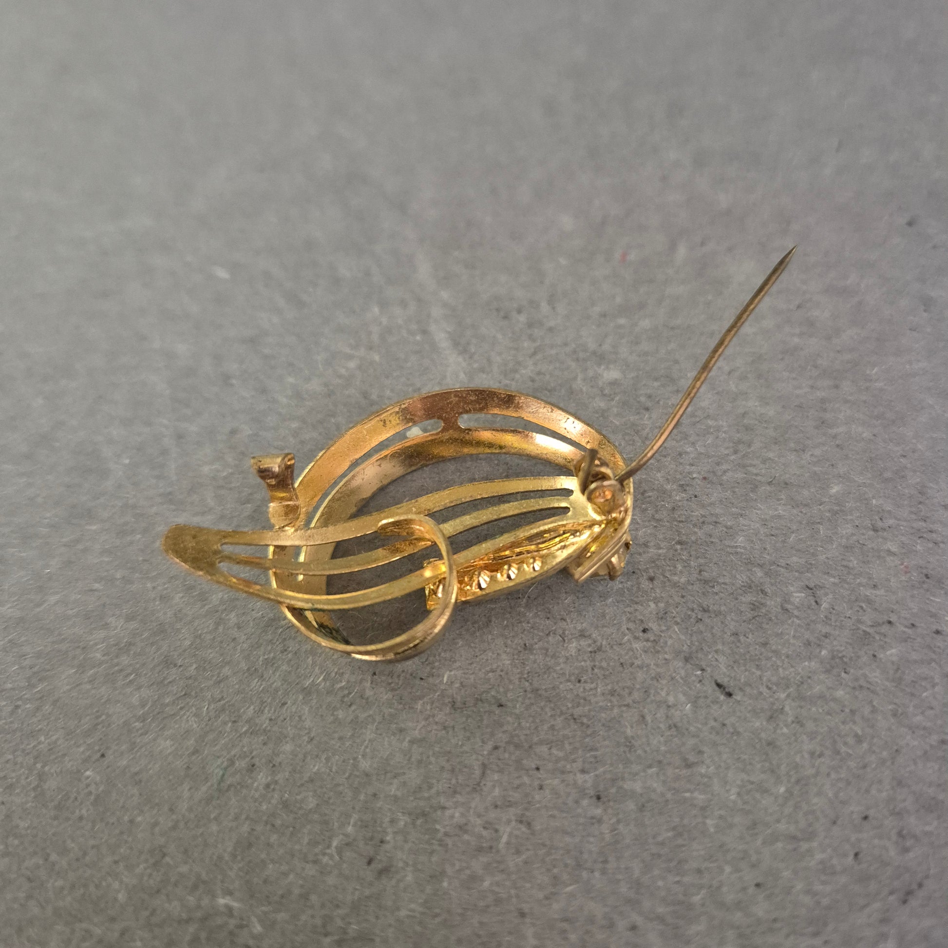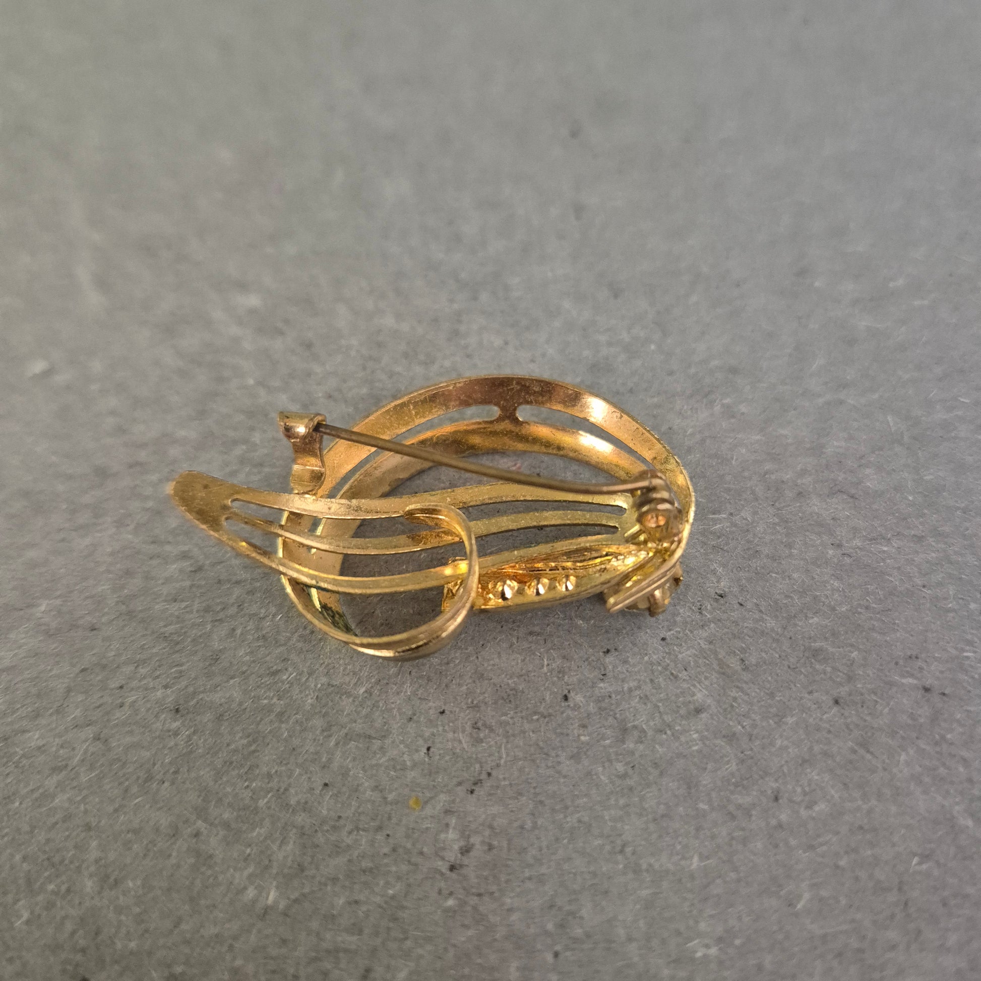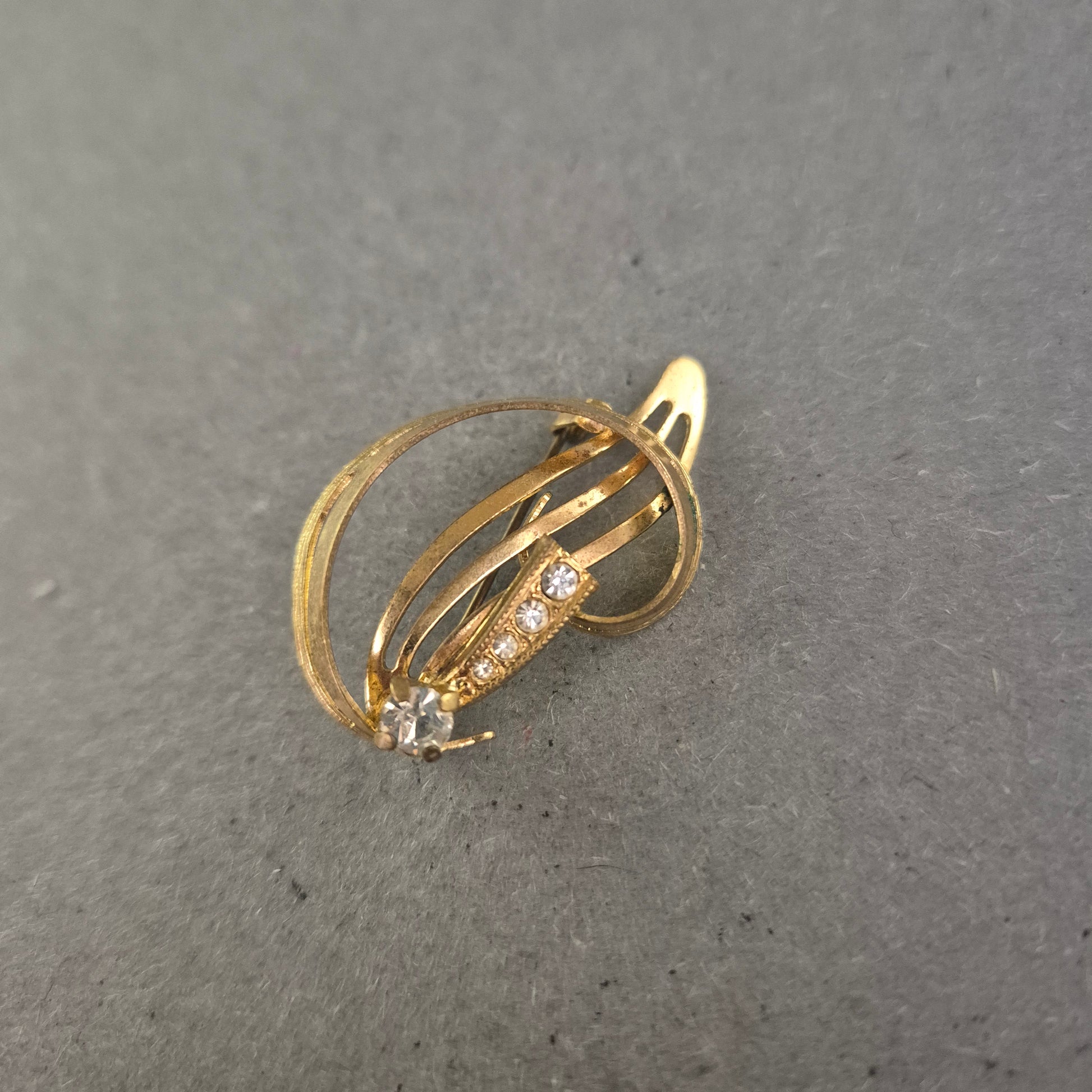 Diese elegante Vintage-Brosche bezaubert mit einem geschwungenen, offenen Design in glänzender Goldoptik. Die Kombination aus zarten Linien und funkelnden Strasssteinen sorgt für eine harmonische Balance aus Schlichtheit und Glamour. Ideal als stilvolles Accessoire für Blusen, Kleider oder Schals – ein echtes Highlight für Liebhaberinnen von zeitlos schönem Schmuck.