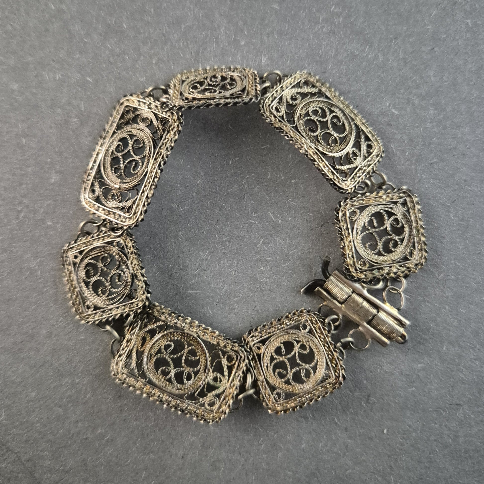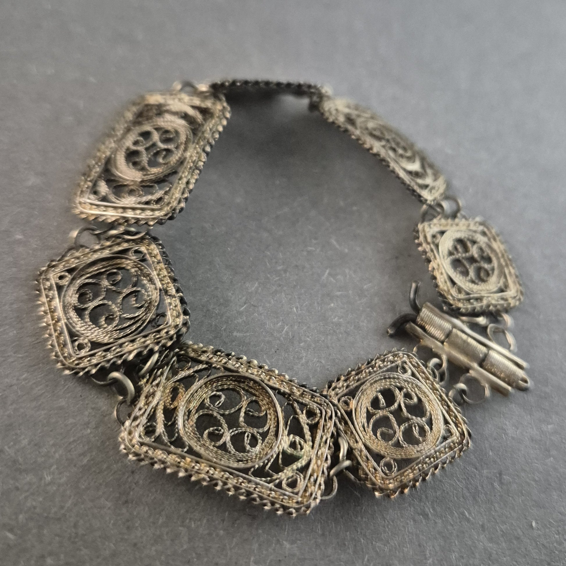 Dieses elegante Vintage-Armband besticht durch seine kunstvolle Filigranarbeit mit feinen, ineinander verschlungenen Mustern. Die rechteckigen Glieder sind detailreich gestaltet und durch kleine Ringe verbunden, wodurch das Armband flexibel und angenehm zu tragen ist. Der robuste Steckverschluss sorgt für sicheren Halt und unterstreicht den antiken Charme dieses besonderen Schmuckstücks.