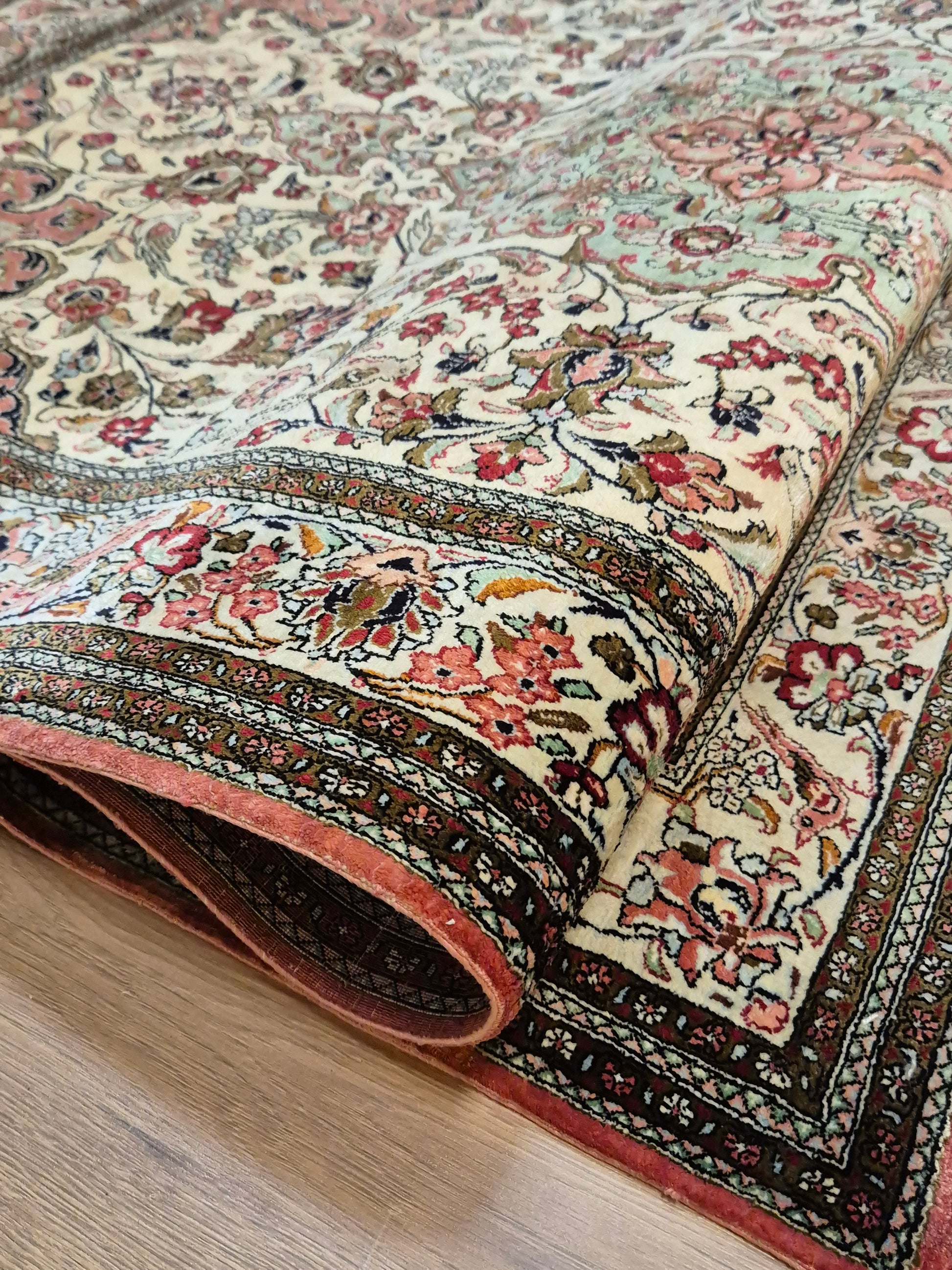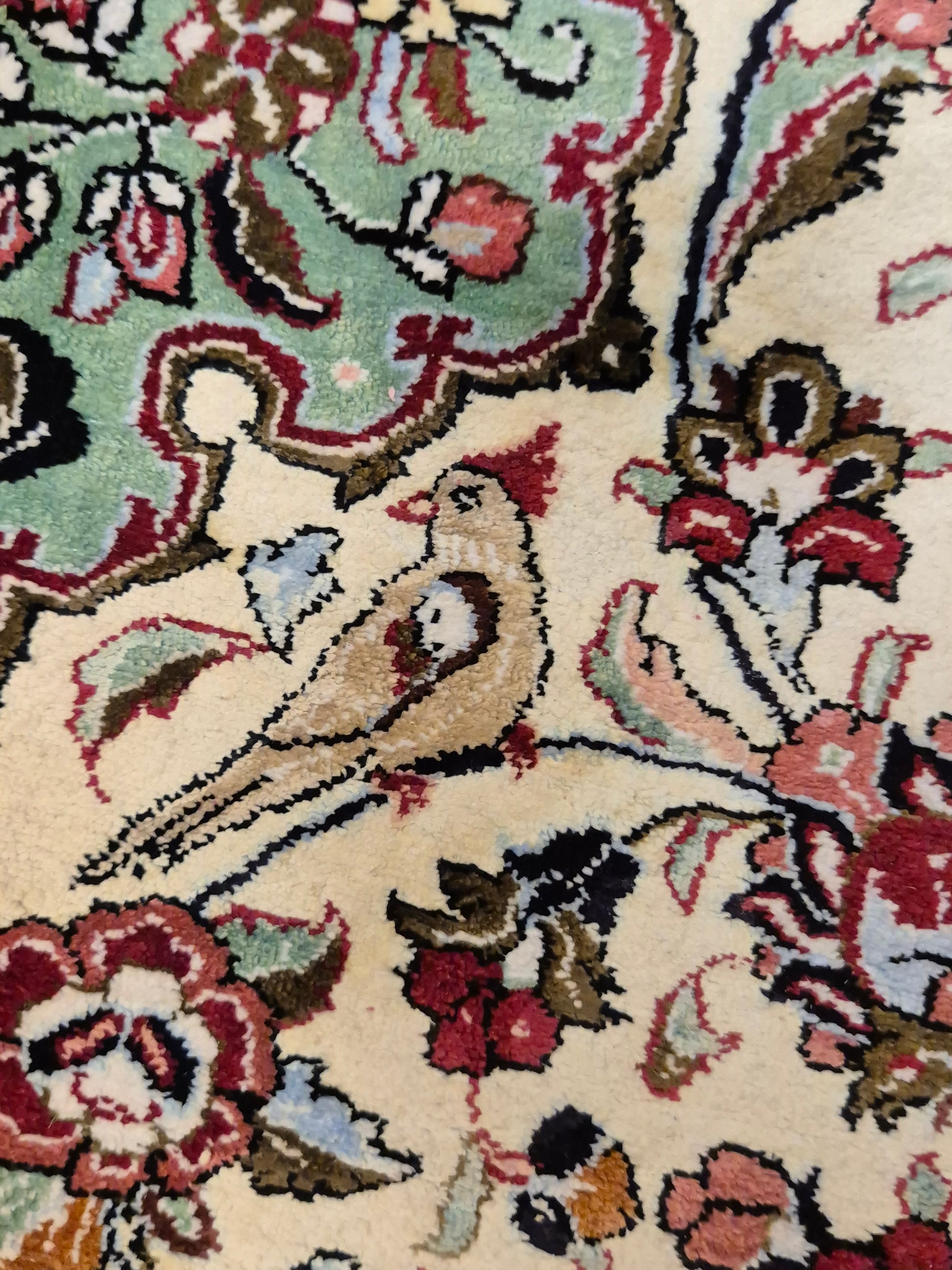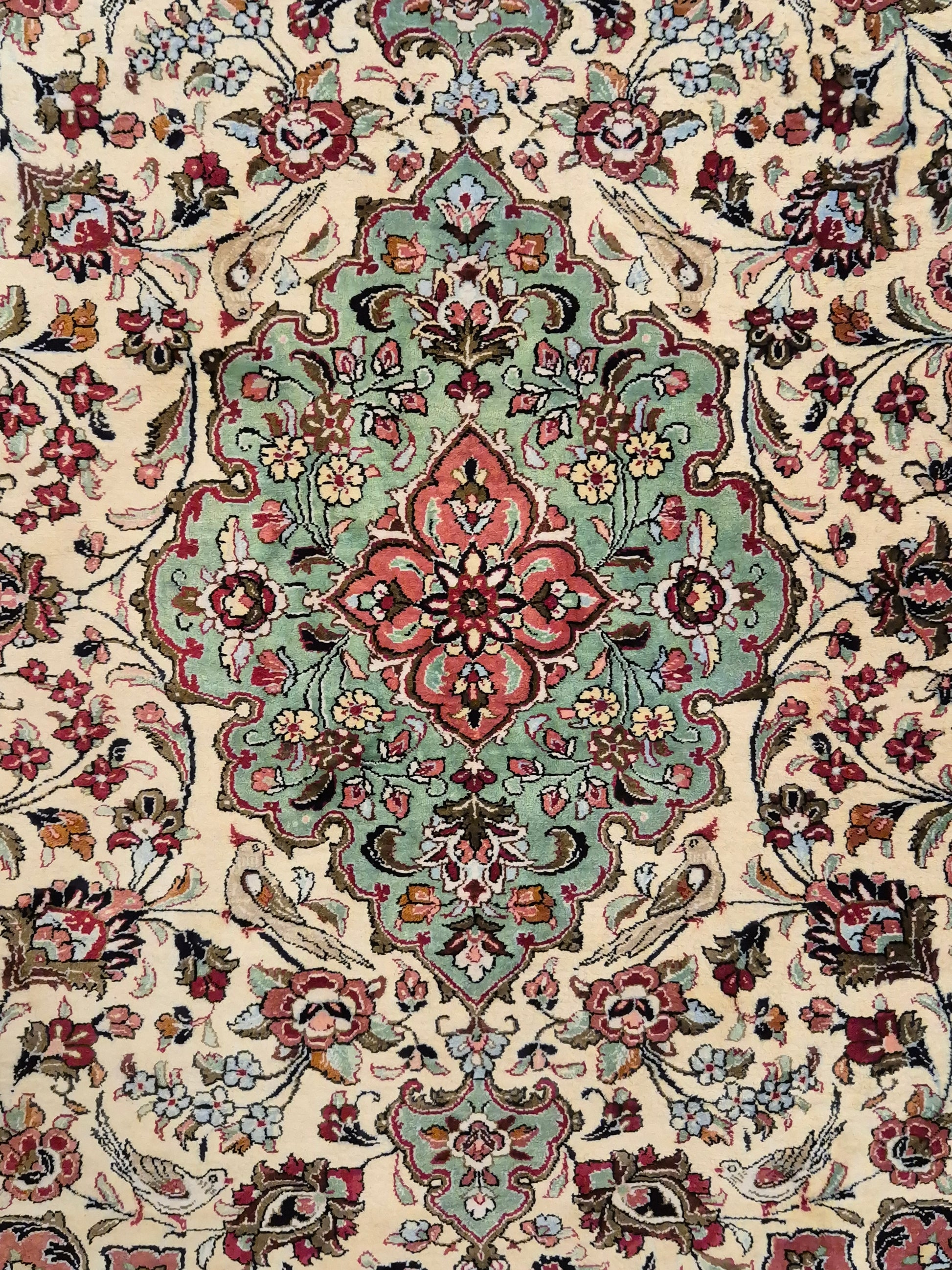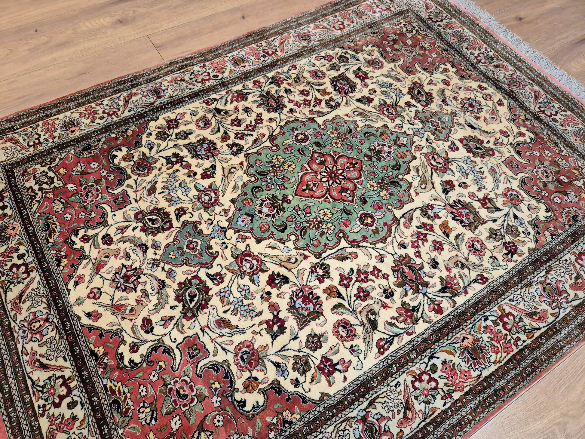 angeboten wird ein edler Ghom Seidenteppich, handgeknüpft auf feiner Seidenkette in meisterhafter Ausführung. Das Teppichzentrum zeigt ein ornamentales Medaillon in leuchtendem Grün und Rot, reich verziert mit filigranen Blüten. Das umliegende Feld ist in hellem Grundton gehalten und mit zarten Blumenranken, Vögeln und feinen floralen Arabesken geschmückt. Eine harmonisch gestaltete Bordüre mit dichtem Blütendekor rahmt das Motiv kunstvoll ein.
