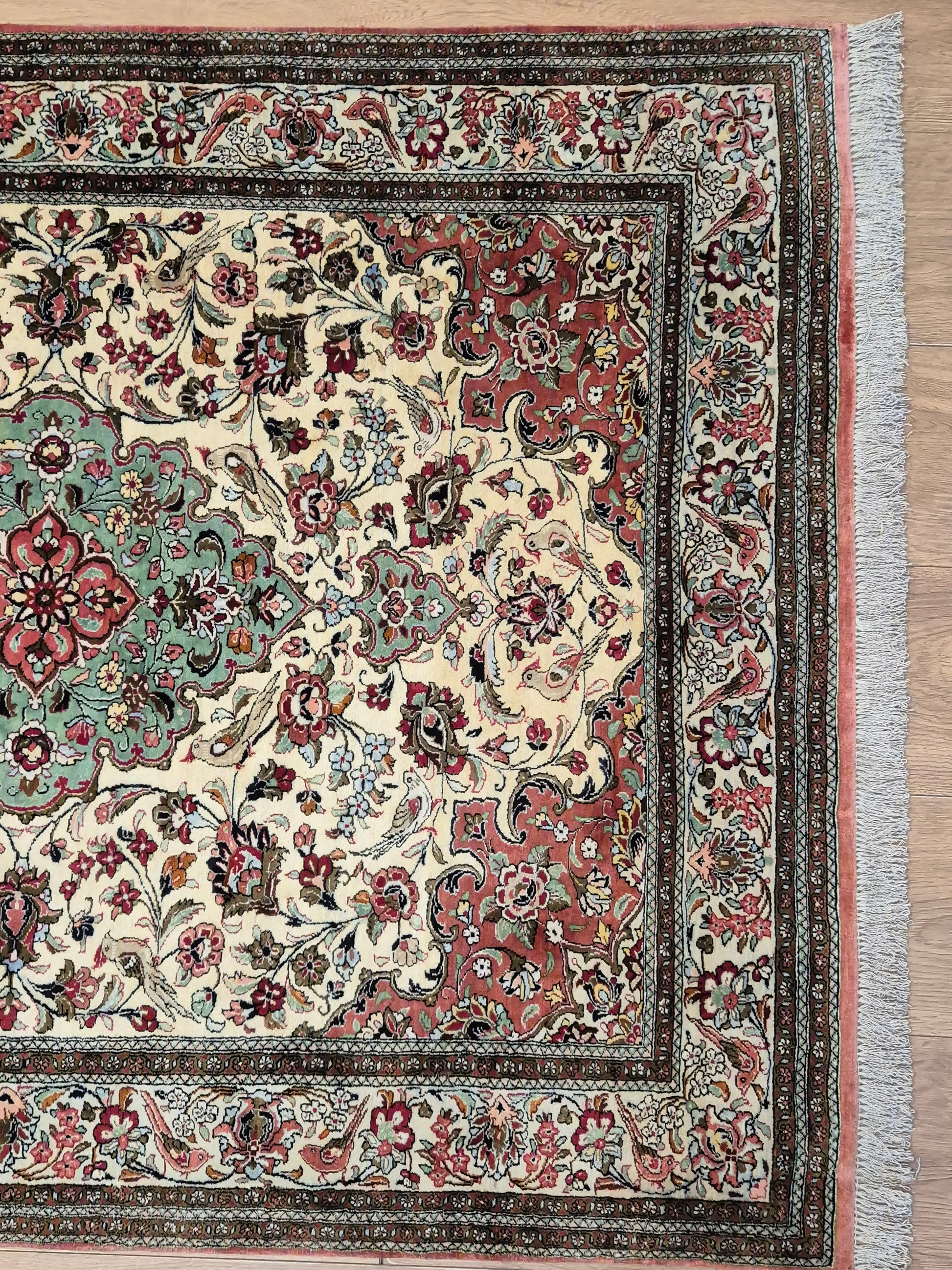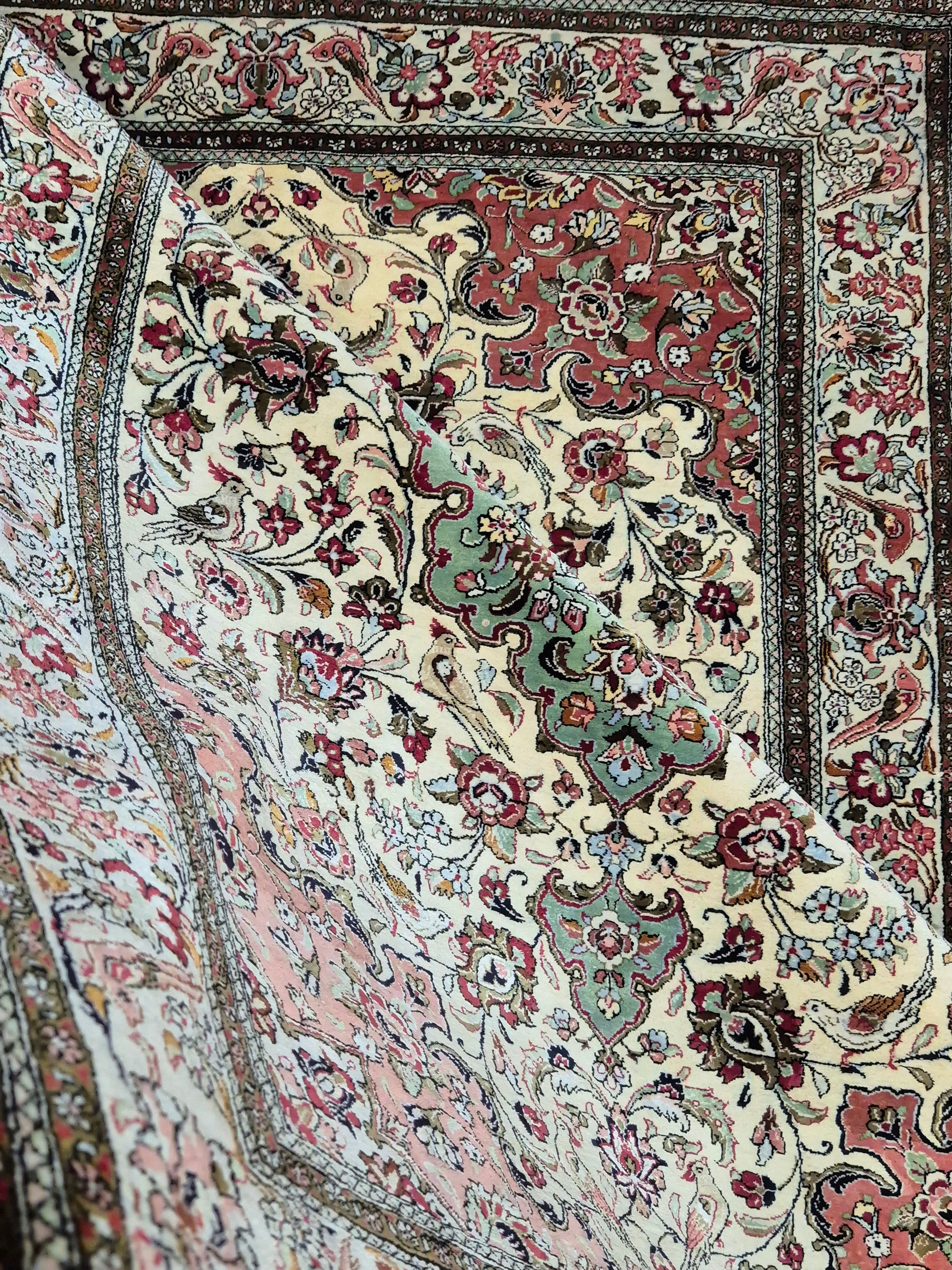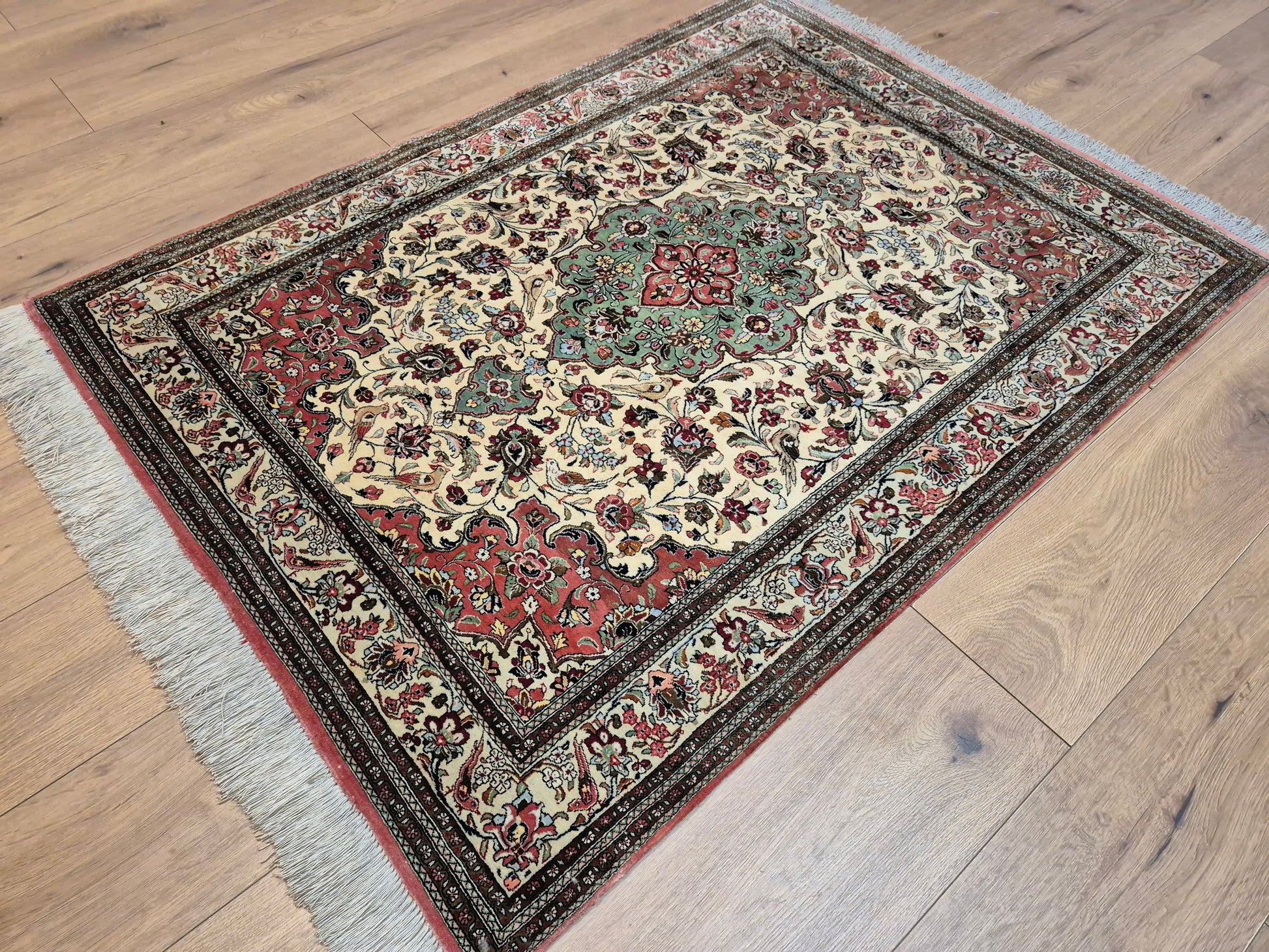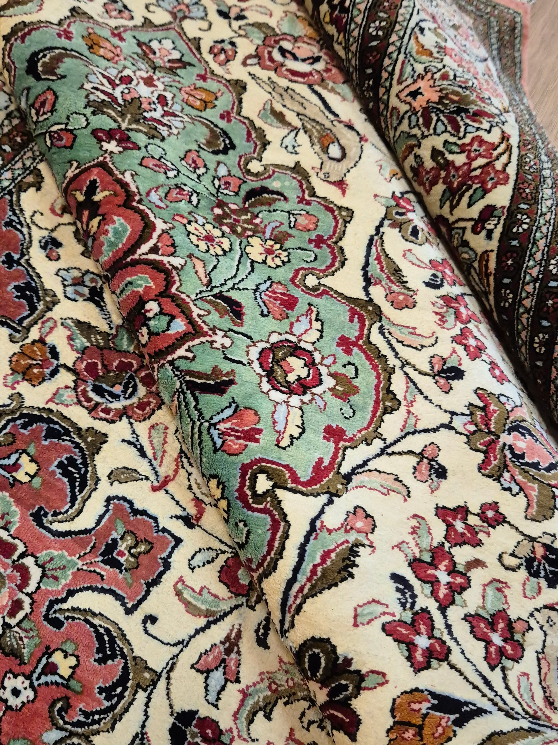angeboten wird ein edler Ghom Seidenteppich, handgeknüpft auf feiner Seidenkette in meisterhafter Ausführung. Das Teppichzentrum zeigt ein ornamentales Medaillon in leuchtendem Grün und Rot, reich verziert mit filigranen Blüten. Das umliegende Feld ist in hellem Grundton gehalten und mit zarten Blumenranken, Vögeln und feinen floralen Arabesken geschmückt. Eine harmonisch gestaltete Bordüre mit dichtem Blütendekor rahmt das Motiv kunstvoll ein.