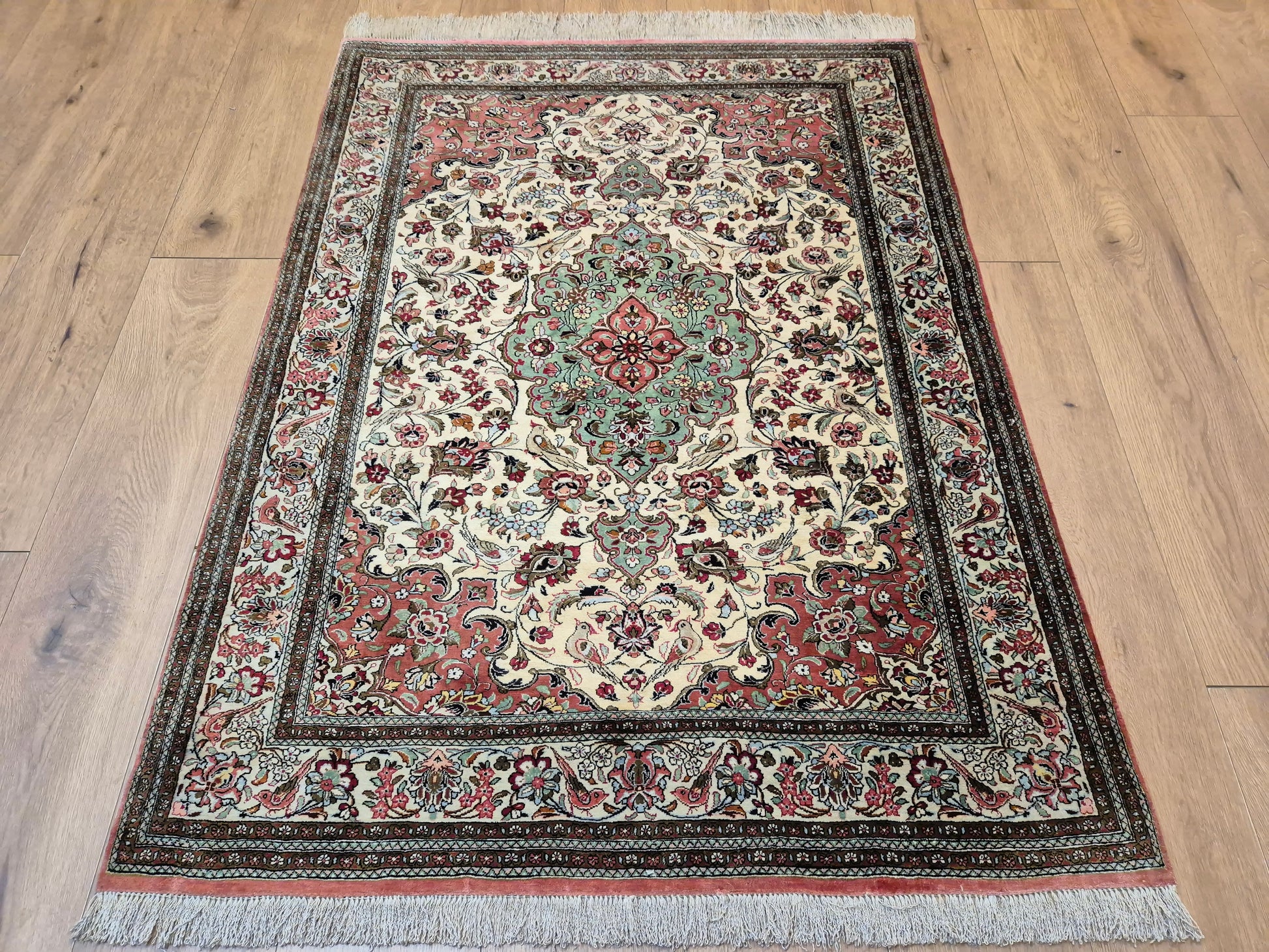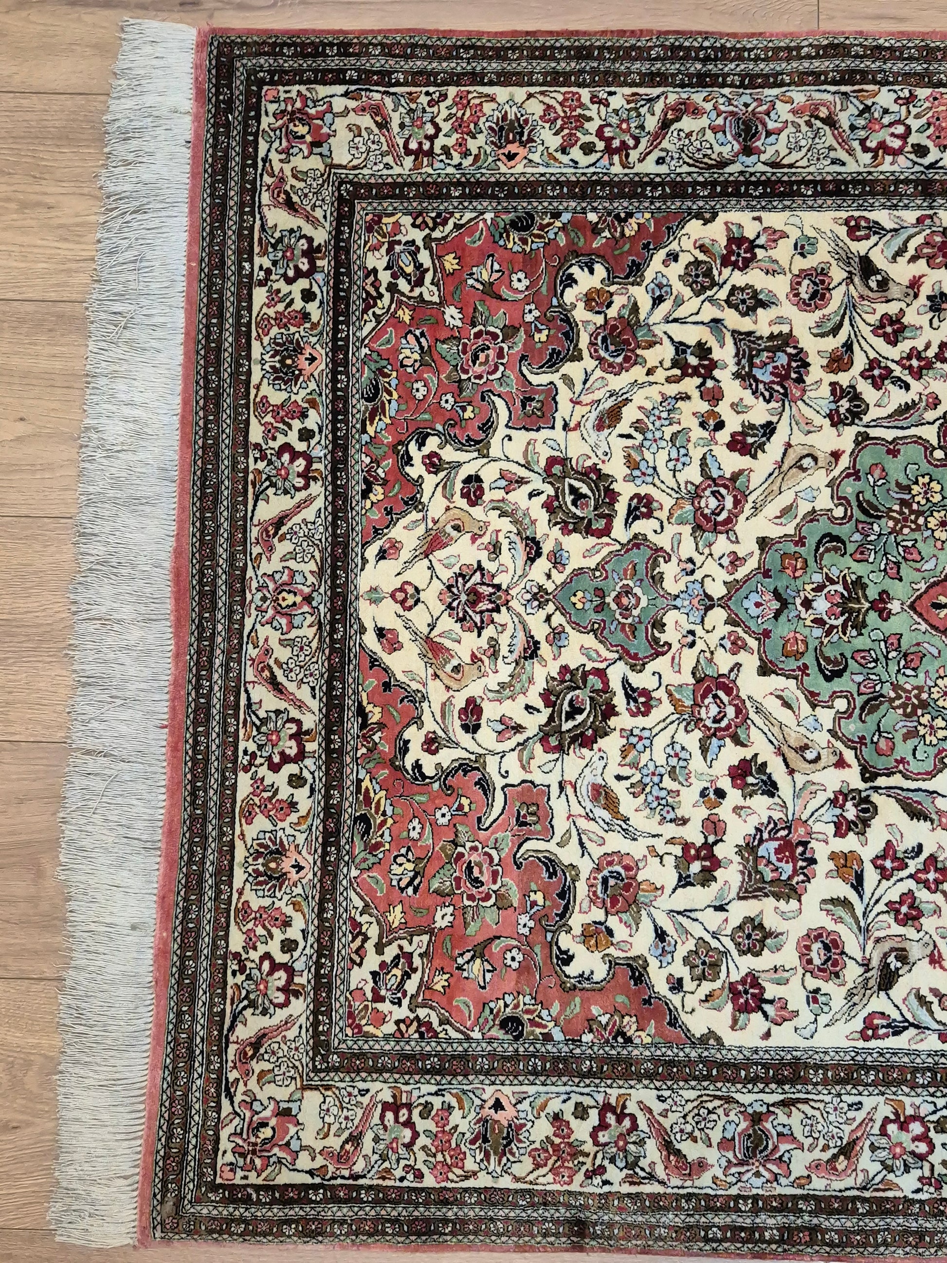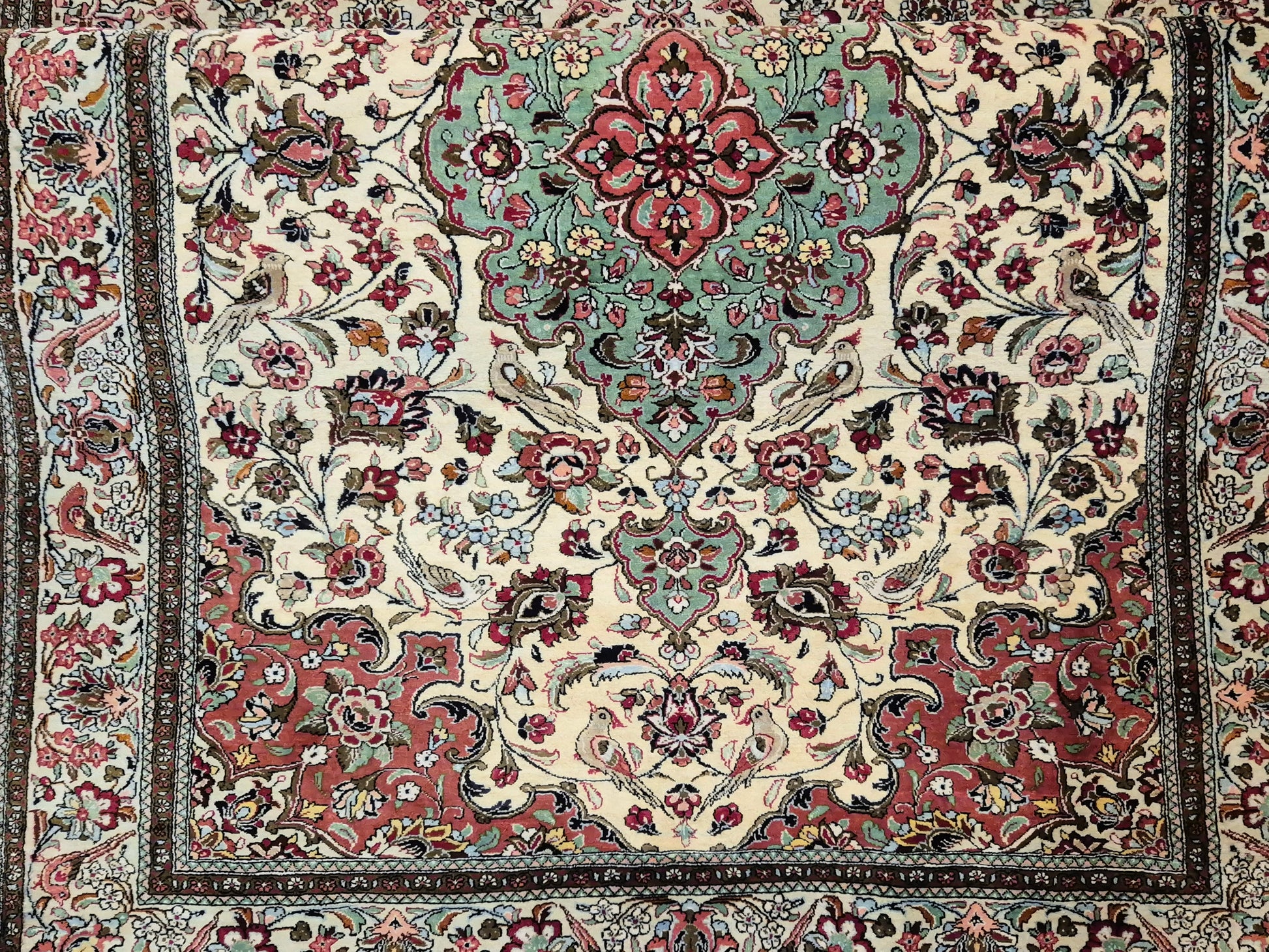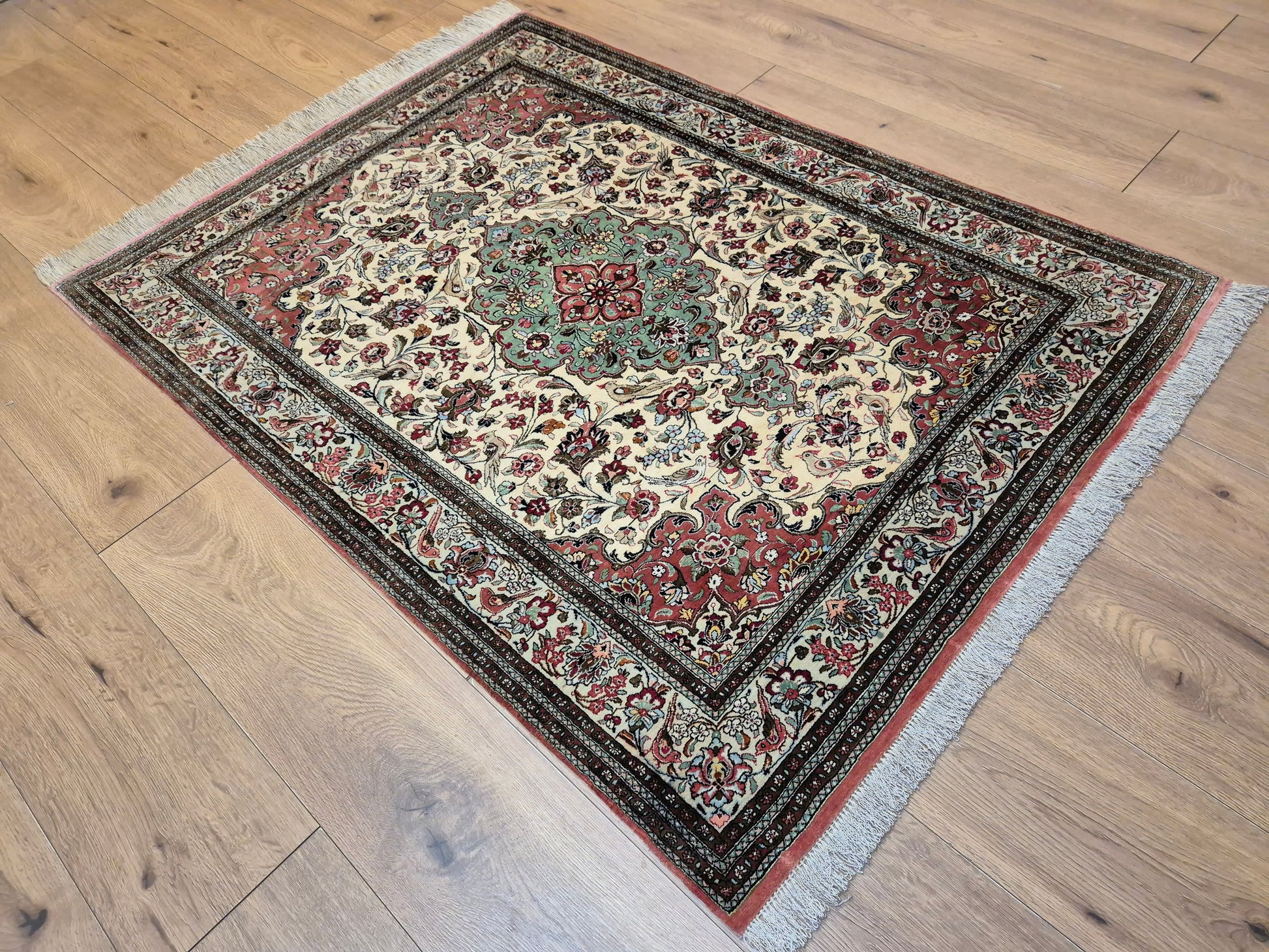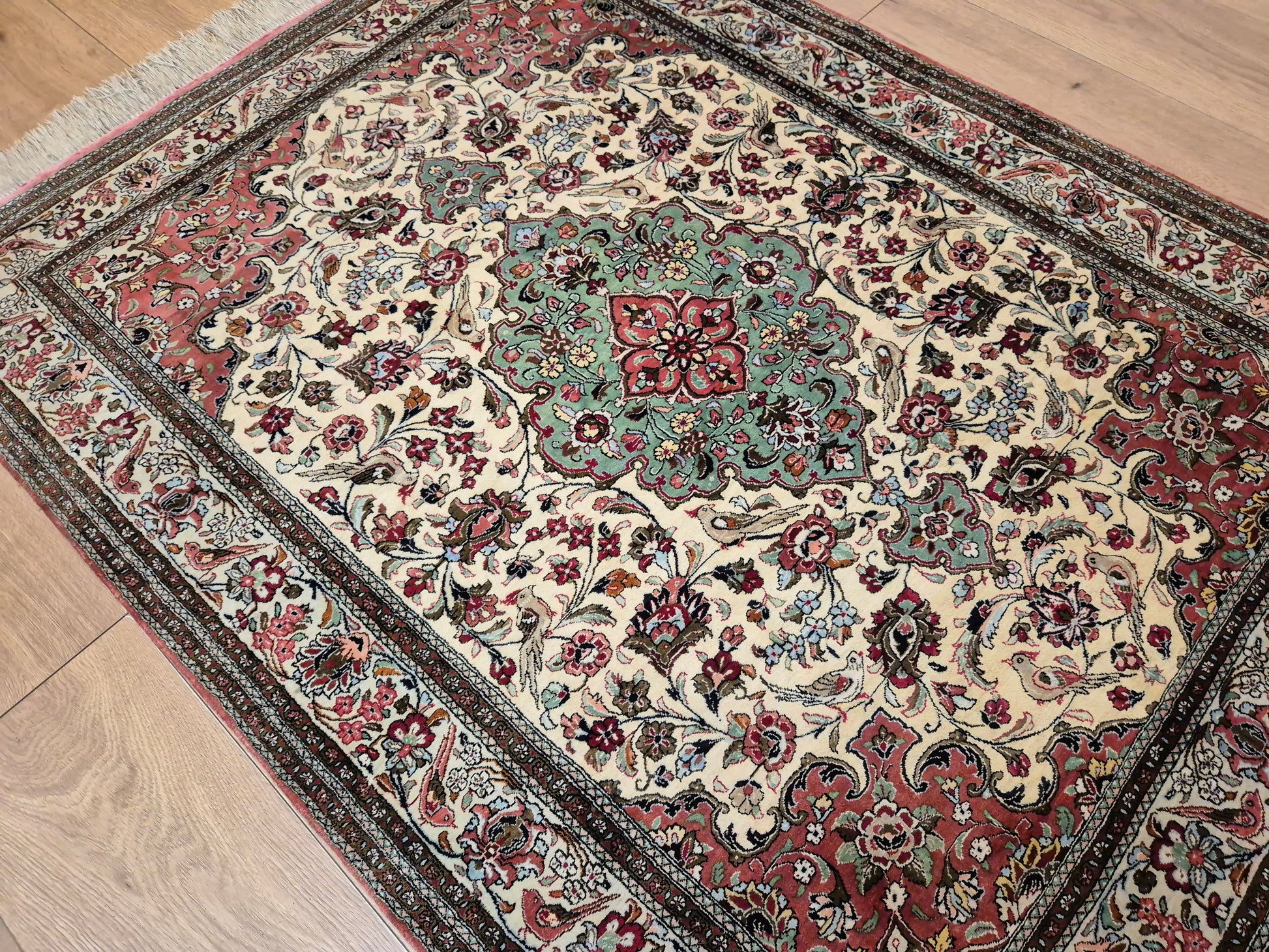 angeboten wird ein edler Ghom Seidenteppich, handgeknüpft auf feiner Seidenkette in meisterhafter Ausführung. Das Teppichzentrum zeigt ein ornamentales Medaillon in leuchtendem Grün und Rot, reich verziert mit filigranen Blüten. Das umliegende Feld ist in hellem Grundton gehalten und mit zarten Blumenranken, Vögeln und feinen floralen Arabesken geschmückt. Eine harmonisch gestaltete Bordüre mit dichtem Blütendekor rahmt das Motiv kunstvoll ein.