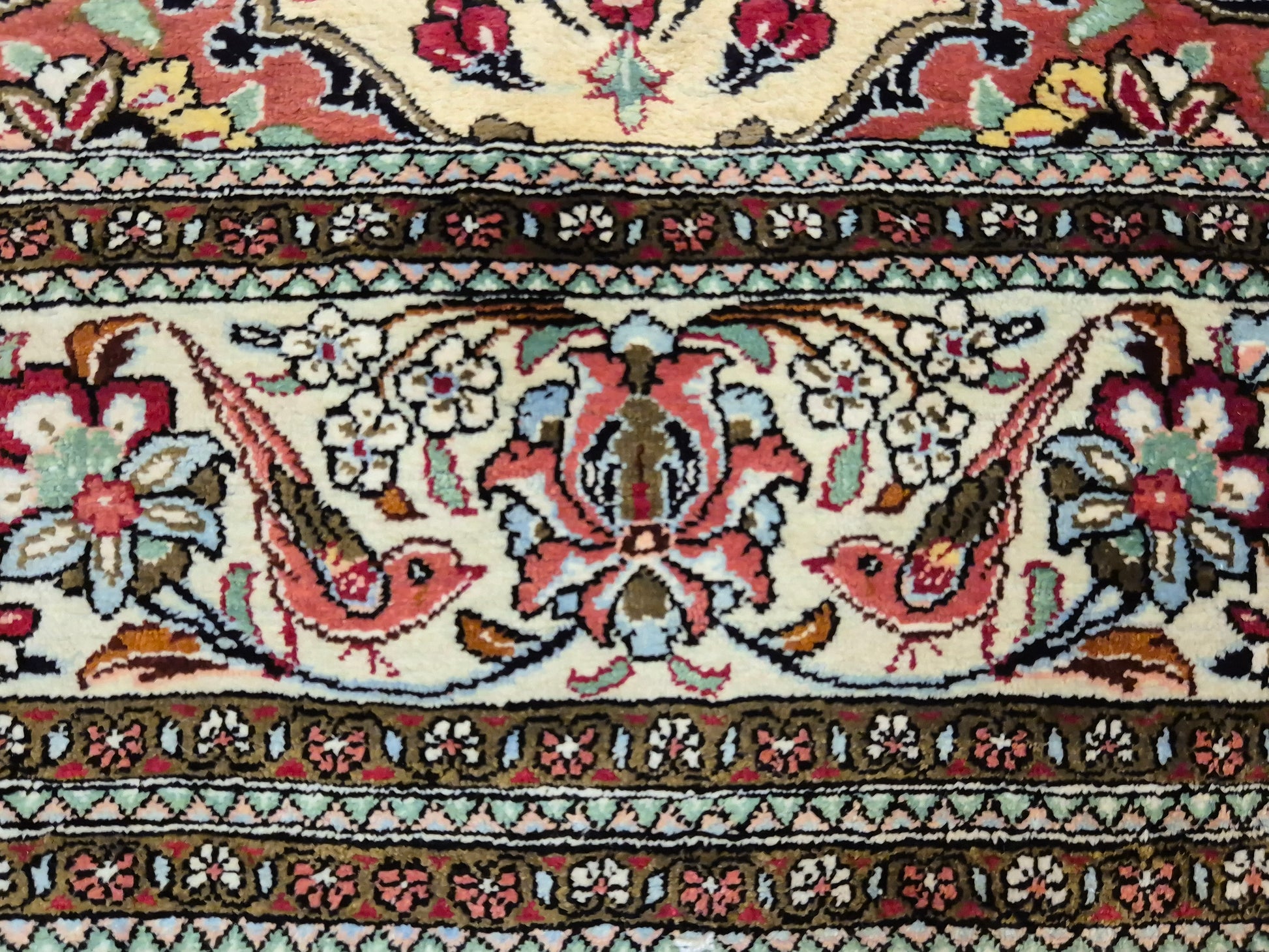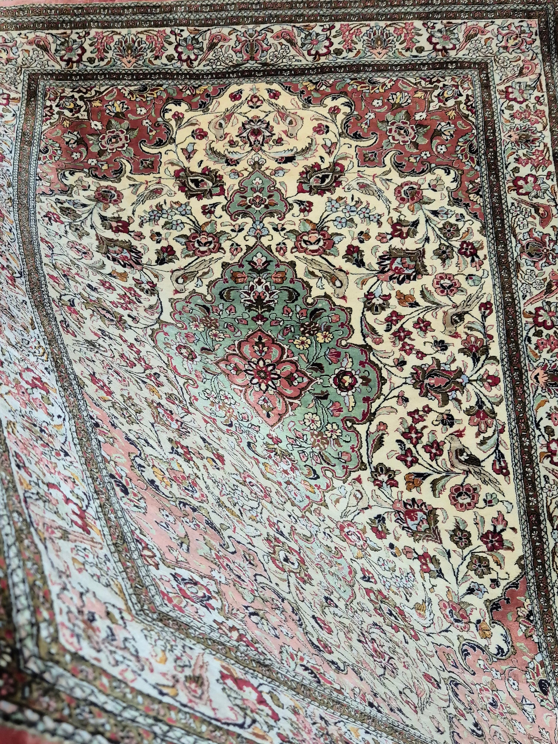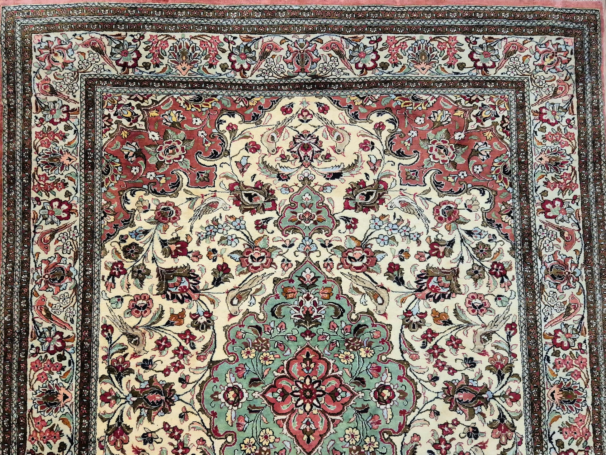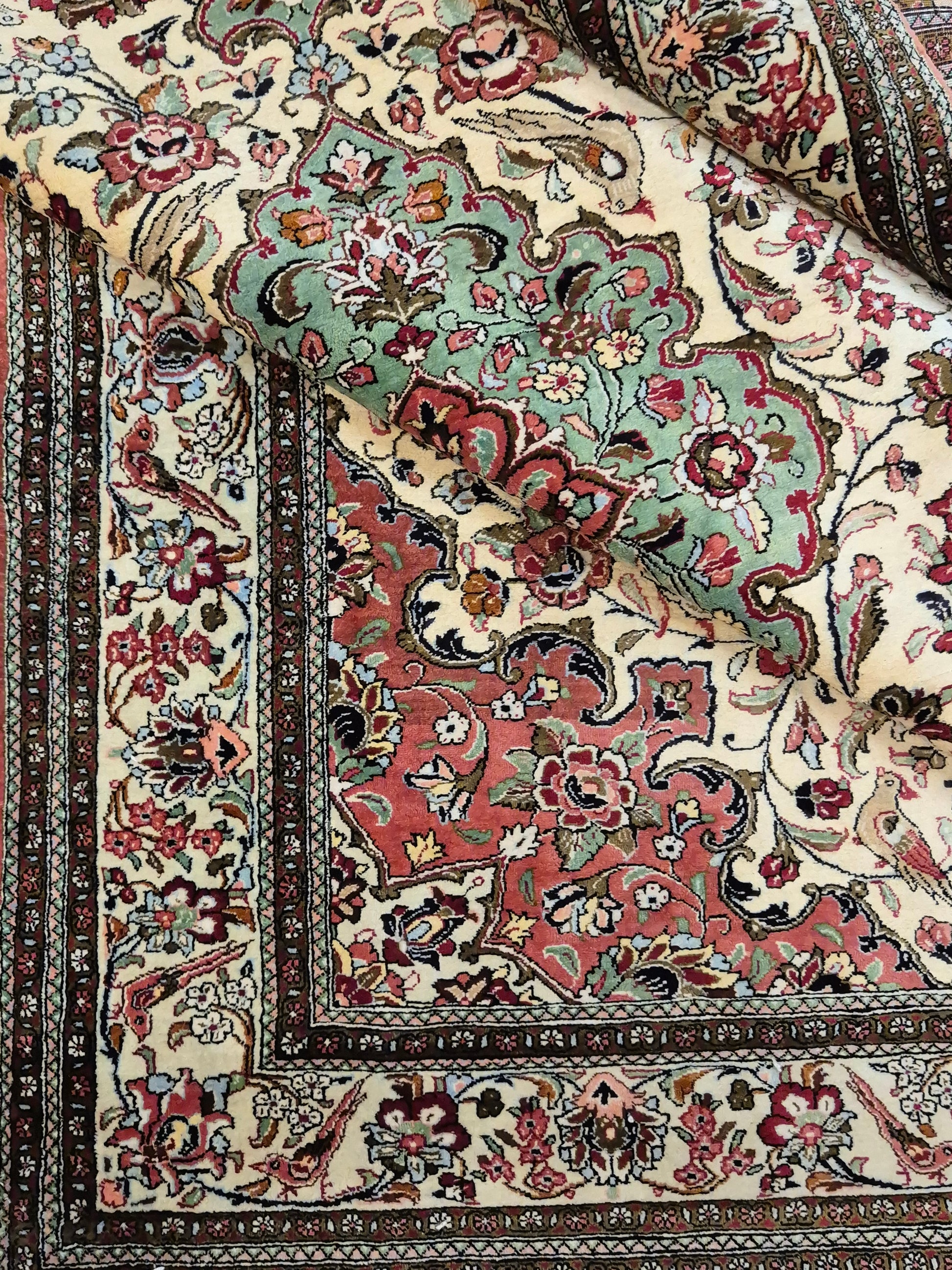 angeboten wird ein edler Ghom Seidenteppich, handgeknüpft auf feiner Seidenkette in meisterhafter Ausführung. Das Teppichzentrum zeigt ein ornamentales Medaillon in leuchtendem Grün und Rot, reich verziert mit filigranen Blüten. Das umliegende Feld ist in hellem Grundton gehalten und mit zarten Blumenranken, Vögeln und feinen floralen Arabesken geschmückt. Eine harmonisch gestaltete Bordüre mit dichtem Blütendekor rahmt das Motiv kunstvoll ein.