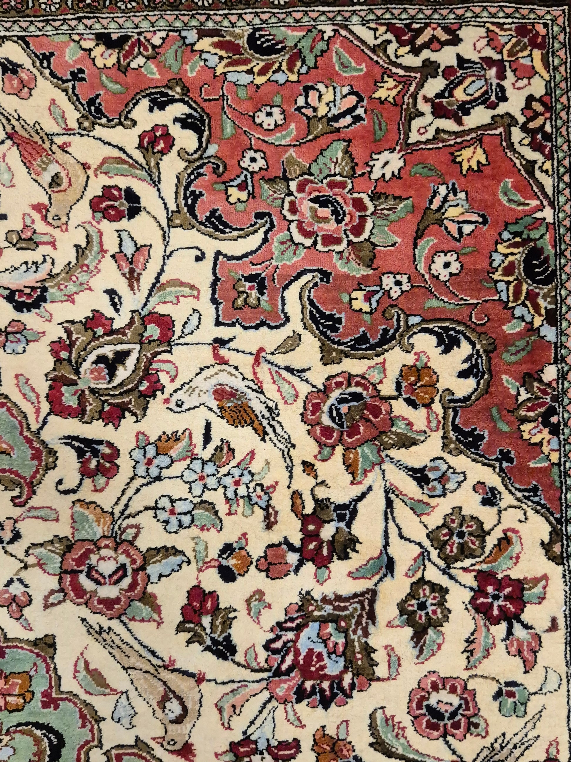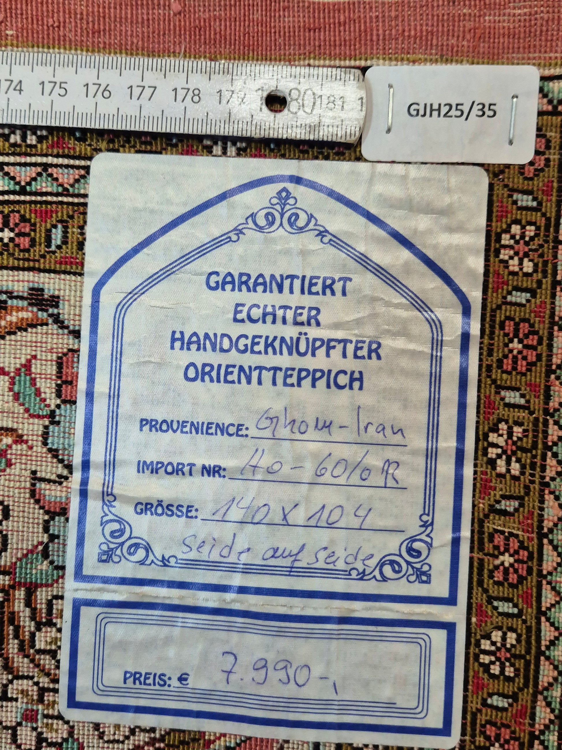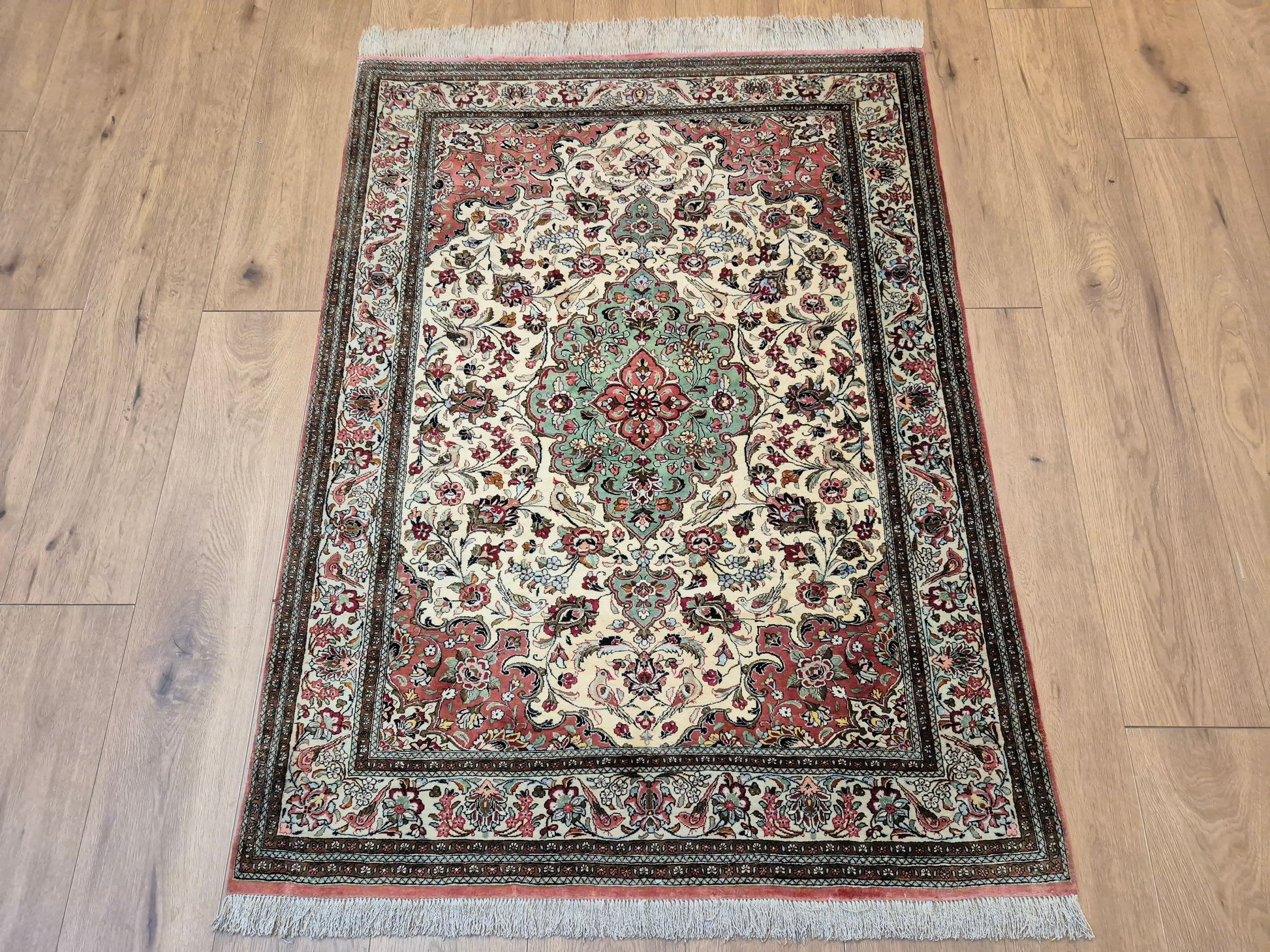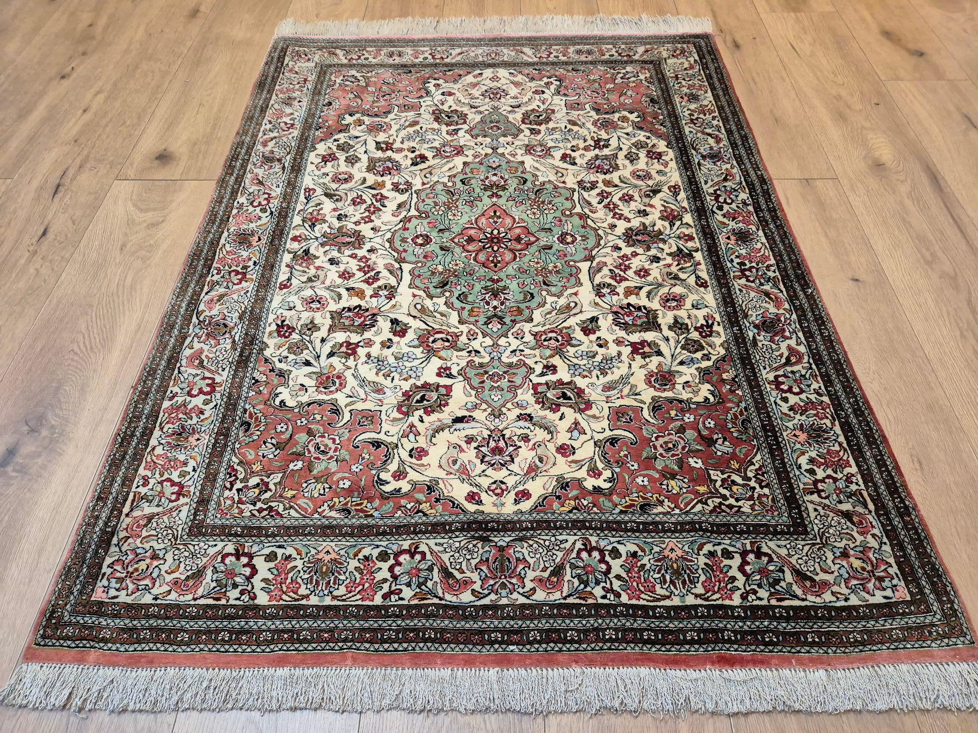 angeboten wird ein edler Ghom Seidenteppich, handgeknüpft auf feiner Seidenkette in meisterhafter Ausführung. Das Teppichzentrum zeigt ein ornamentales Medaillon in leuchtendem Grün und Rot, reich verziert mit filigranen Blüten. Das umliegende Feld ist in hellem Grundton gehalten und mit zarten Blumenranken, Vögeln und feinen floralen Arabesken geschmückt. Eine harmonisch gestaltete Bordüre mit dichtem Blütendekor rahmt das Motiv kunstvoll ein.