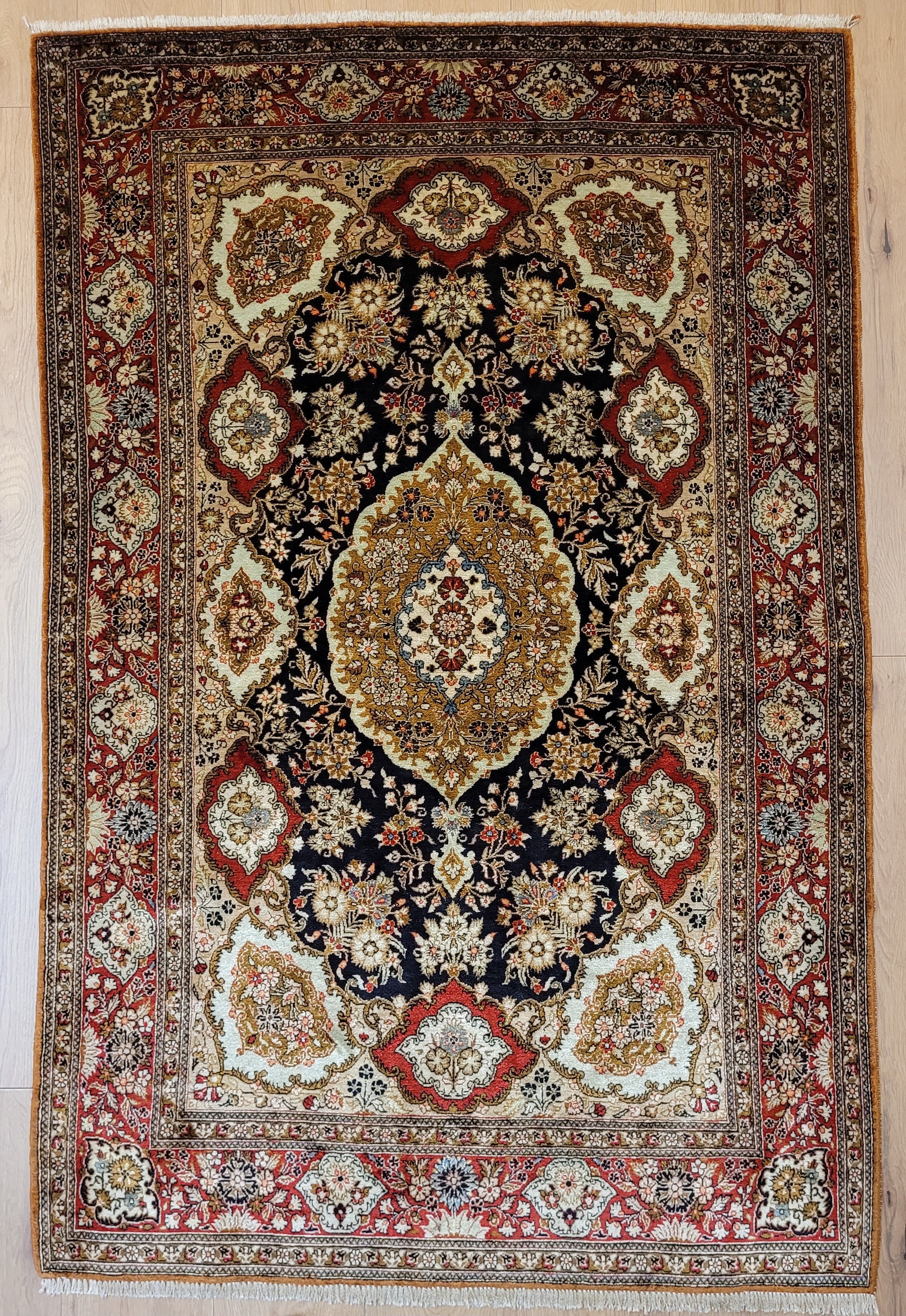 angeboten wird ein edler Ghom Teppich aus reiner Seide, handgeknüpft in besonders feiner Ausführung. Im Zentrum steht ein kunstvoll gestaltetes Medaillon, das von üppigen floralen Ornamenten auf tiefdunklem Fond eingerahmt wird. Die leuchtenden Seidenfarben verleihen dem Teppich eine edle Ausstrahlung und ein changierendes Farbspiel.