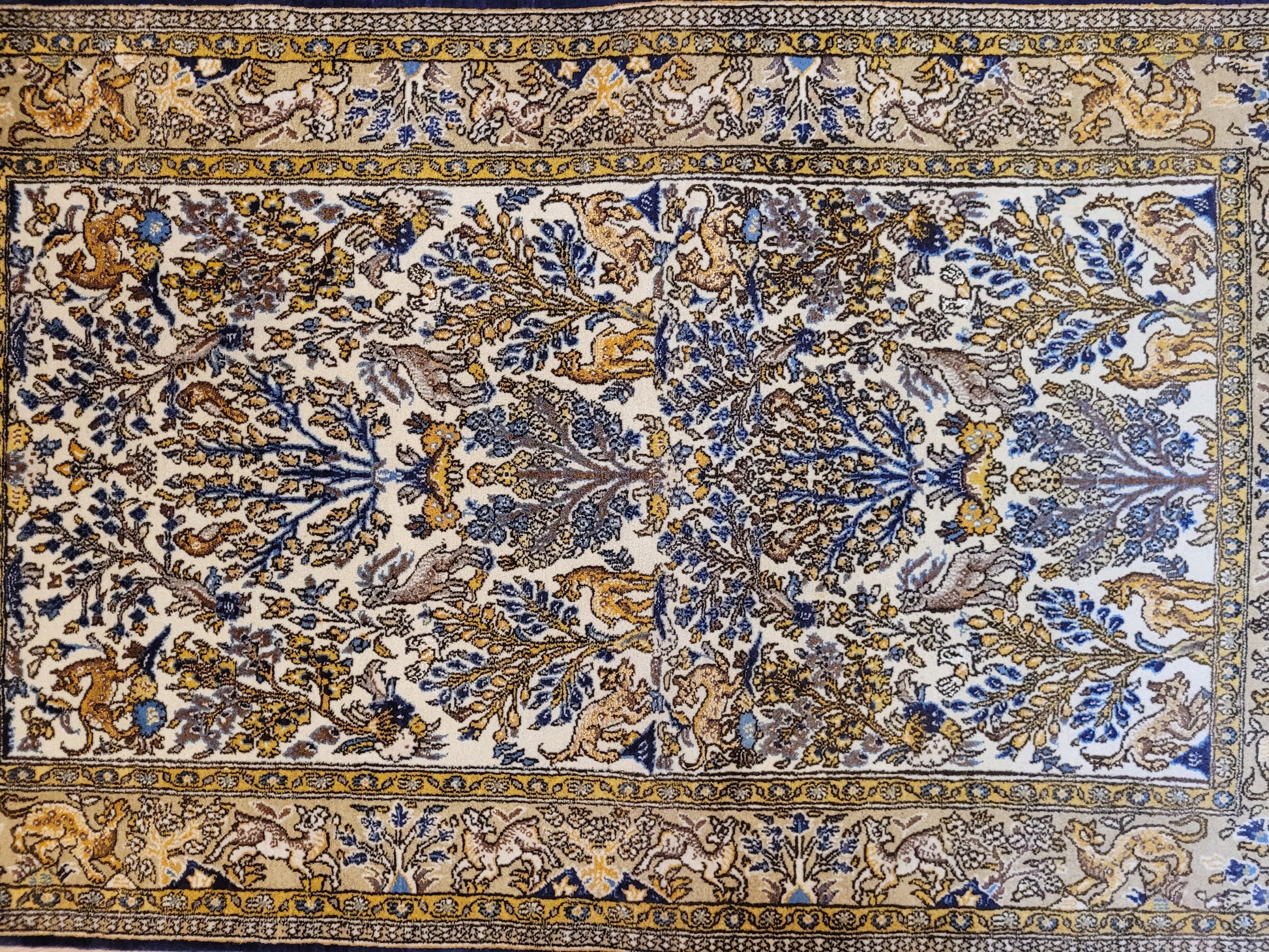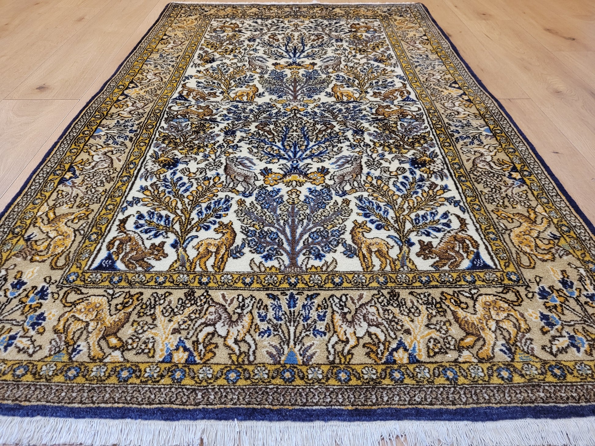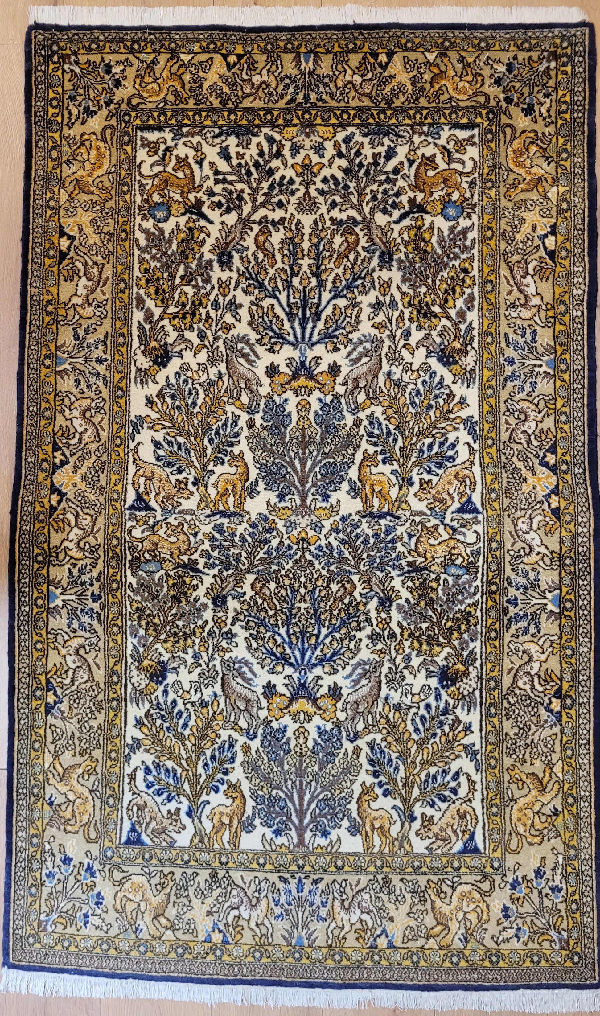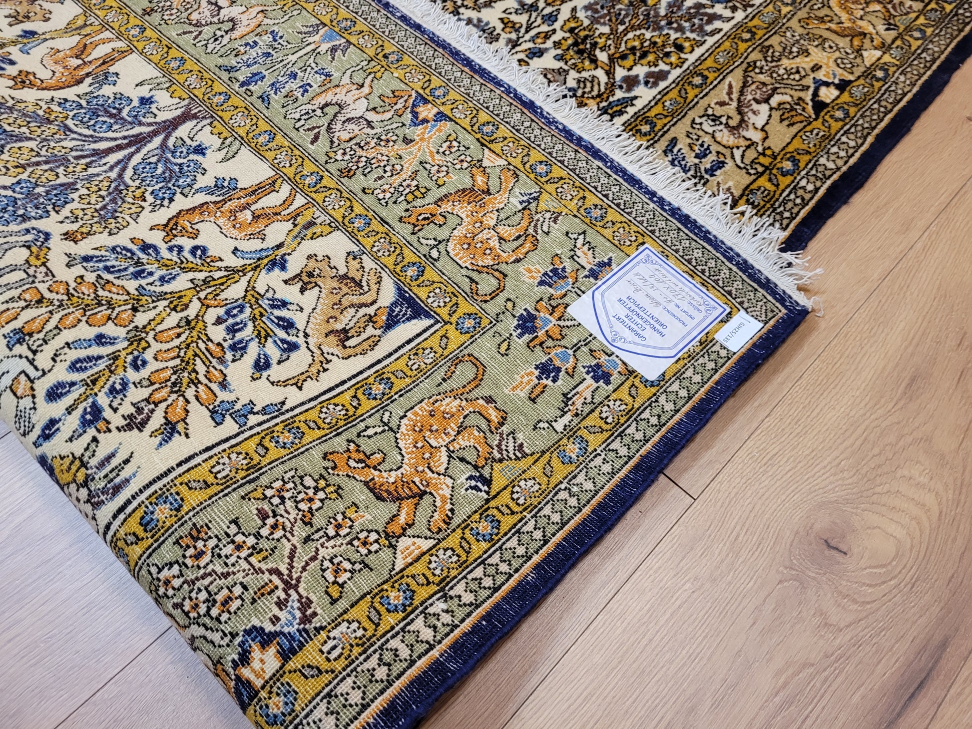 angeboten wird ein edler Ghom Teppich aus feiner Korkwolle auf Seide, handgeknüpft in meisterlicher Qualität. Das Motiv zeigt eine reich gestaltete Naturdarstellung mit Bäumen, floralen Elementen und zahlreichen Tieren wie Löwen, Hirschen und Fabelwesen. Die Bordüre ist detailreich ausgeführt und ergänzt das zentrale Bild mit harmonischen Ranken und Tiermotiven. Die Komposition besticht durch ihre Symmetrie und die feine Abstimmung der Farben.