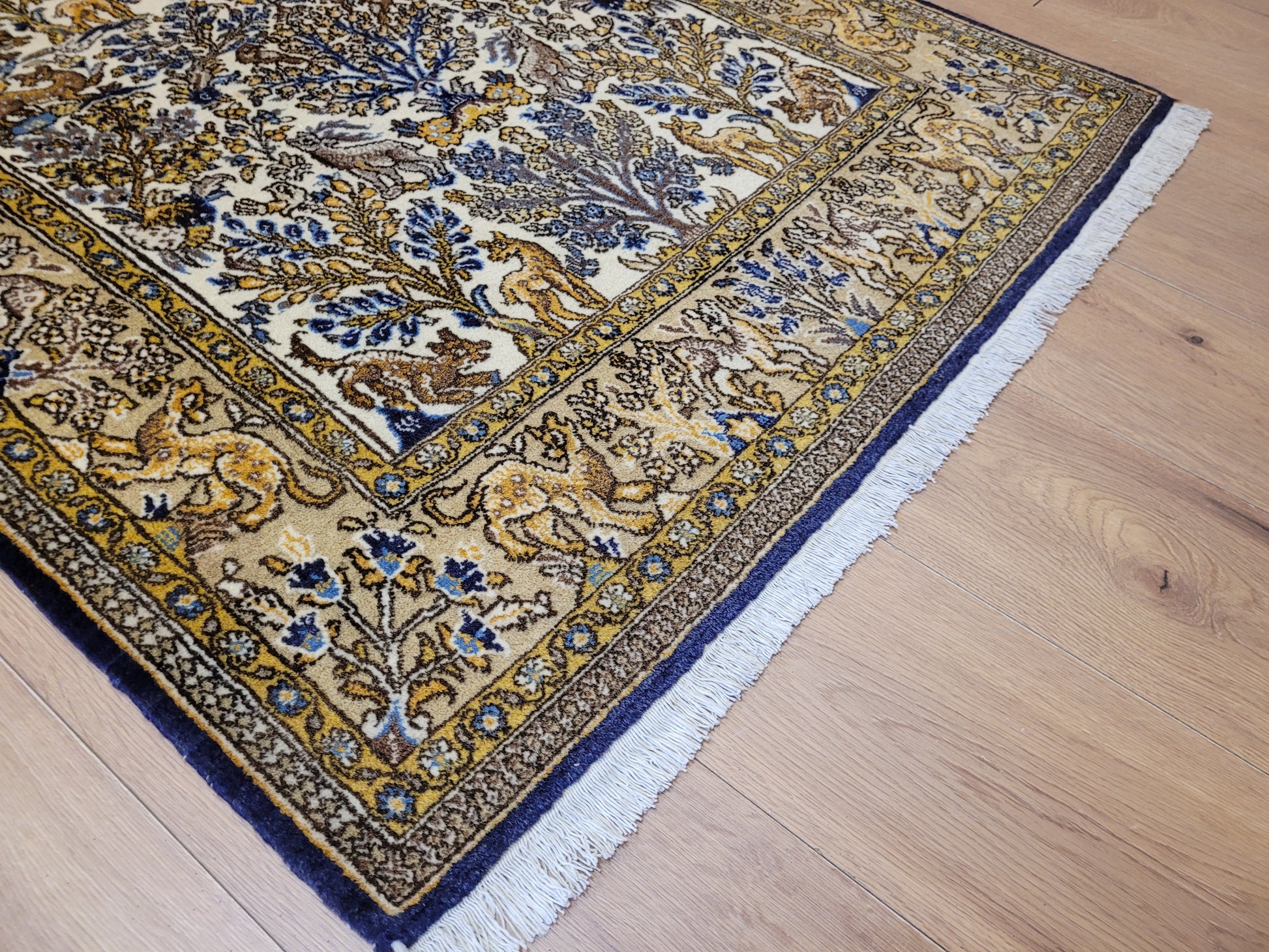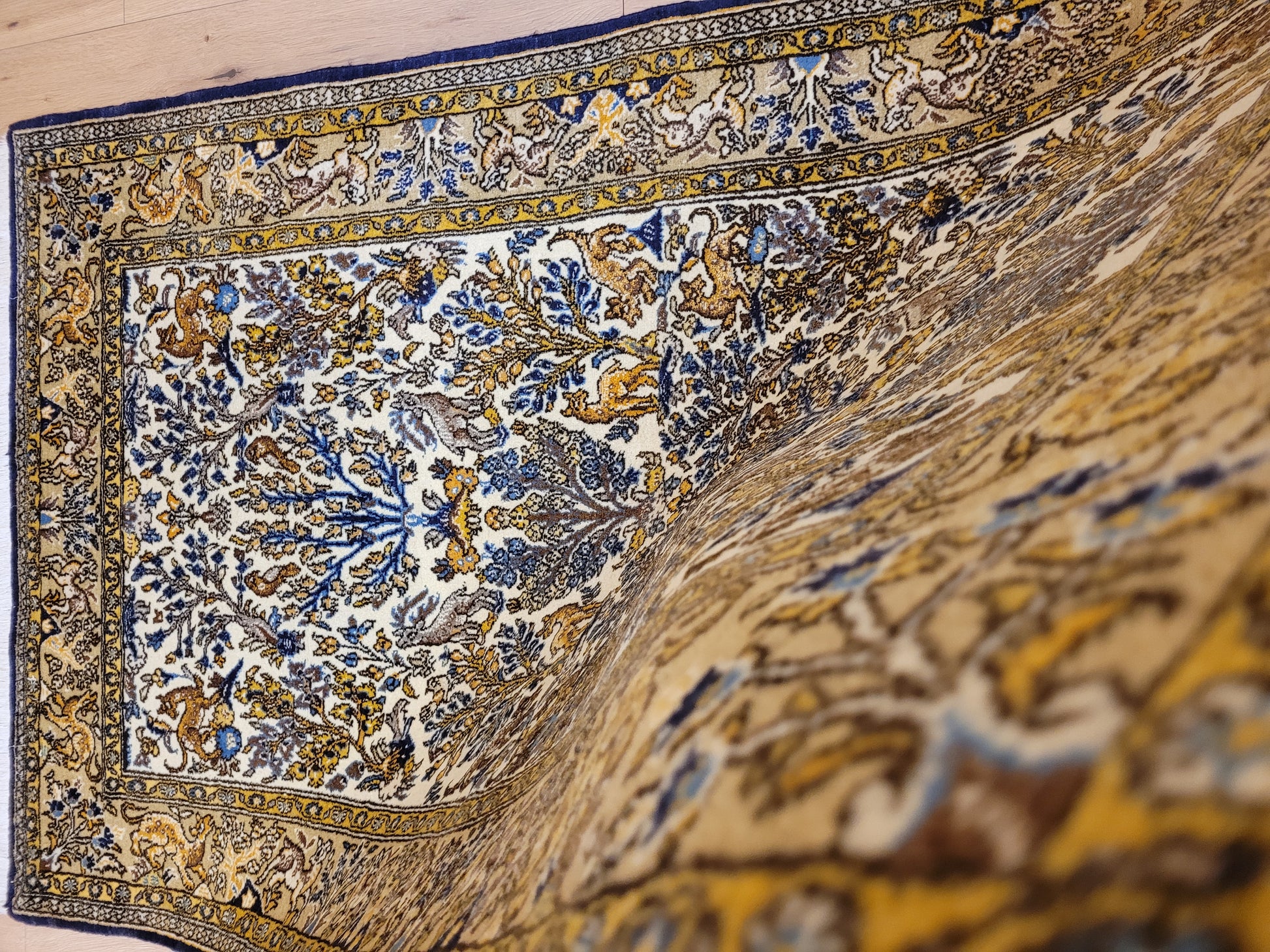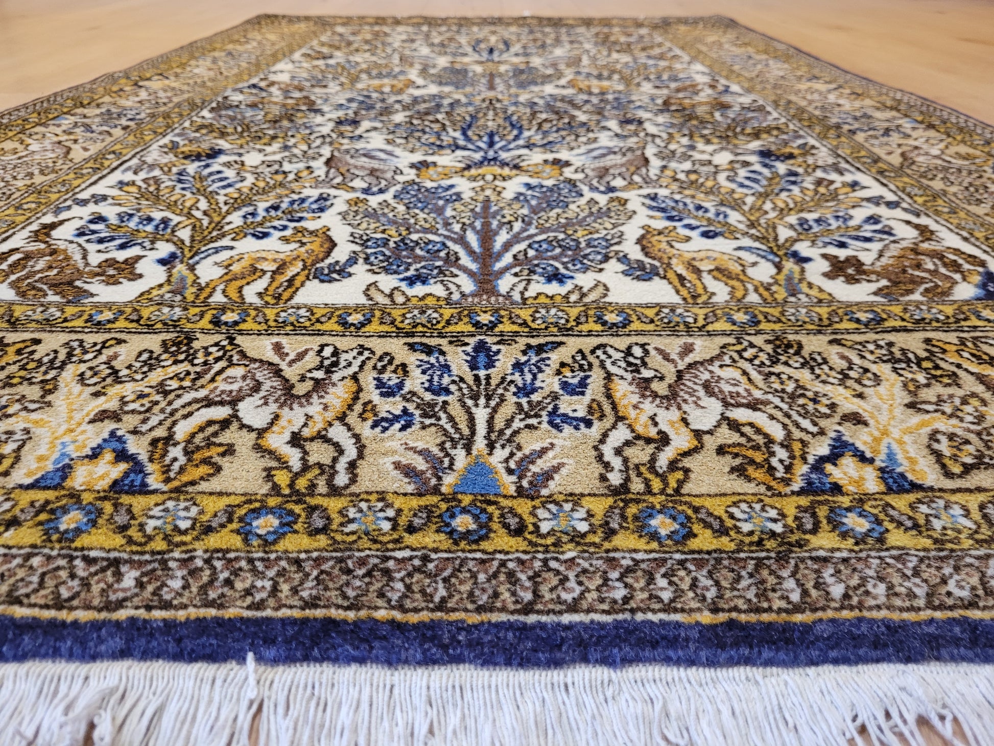 angeboten wird ein edler Ghom Teppich aus feiner Korkwolle auf Seide, handgeknüpft in meisterlicher Qualität. Das Motiv zeigt eine reich gestaltete Naturdarstellung mit Bäumen, floralen Elementen und zahlreichen Tieren wie Löwen, Hirschen und Fabelwesen. Die Bordüre ist detailreich ausgeführt und ergänzt das zentrale Bild mit harmonischen Ranken und Tiermotiven. Die Komposition besticht durch ihre Symmetrie und die feine Abstimmung der Farben.