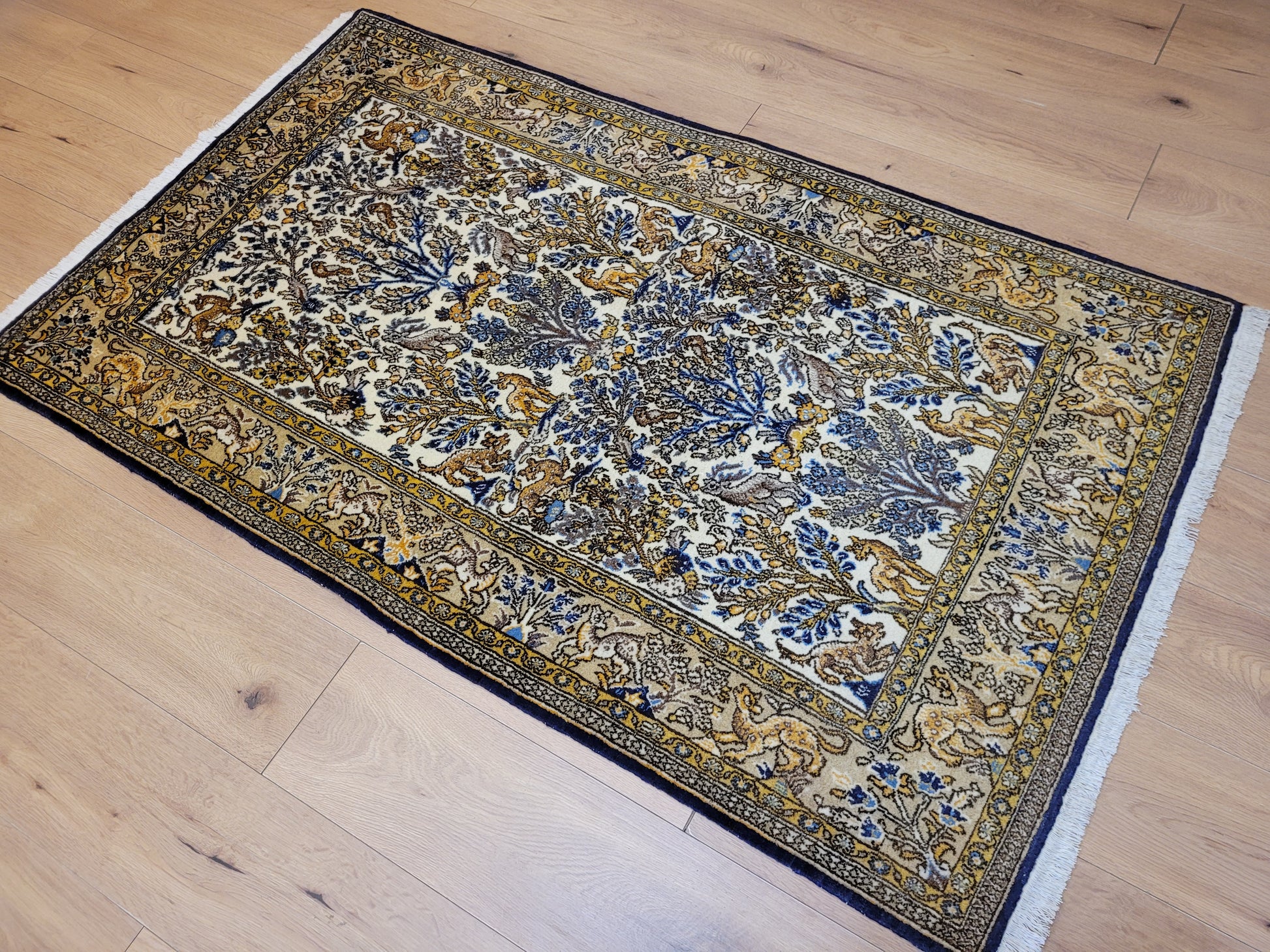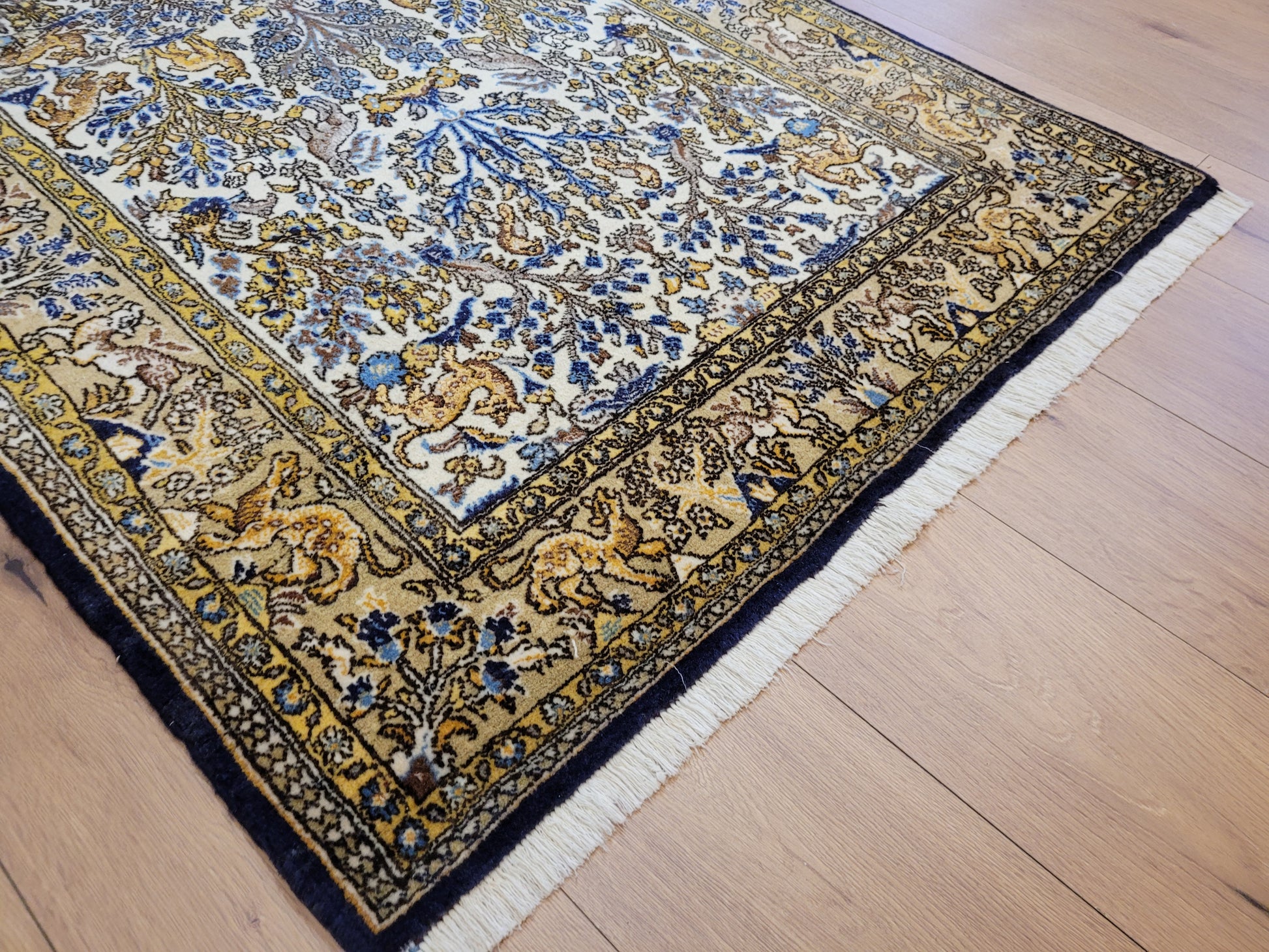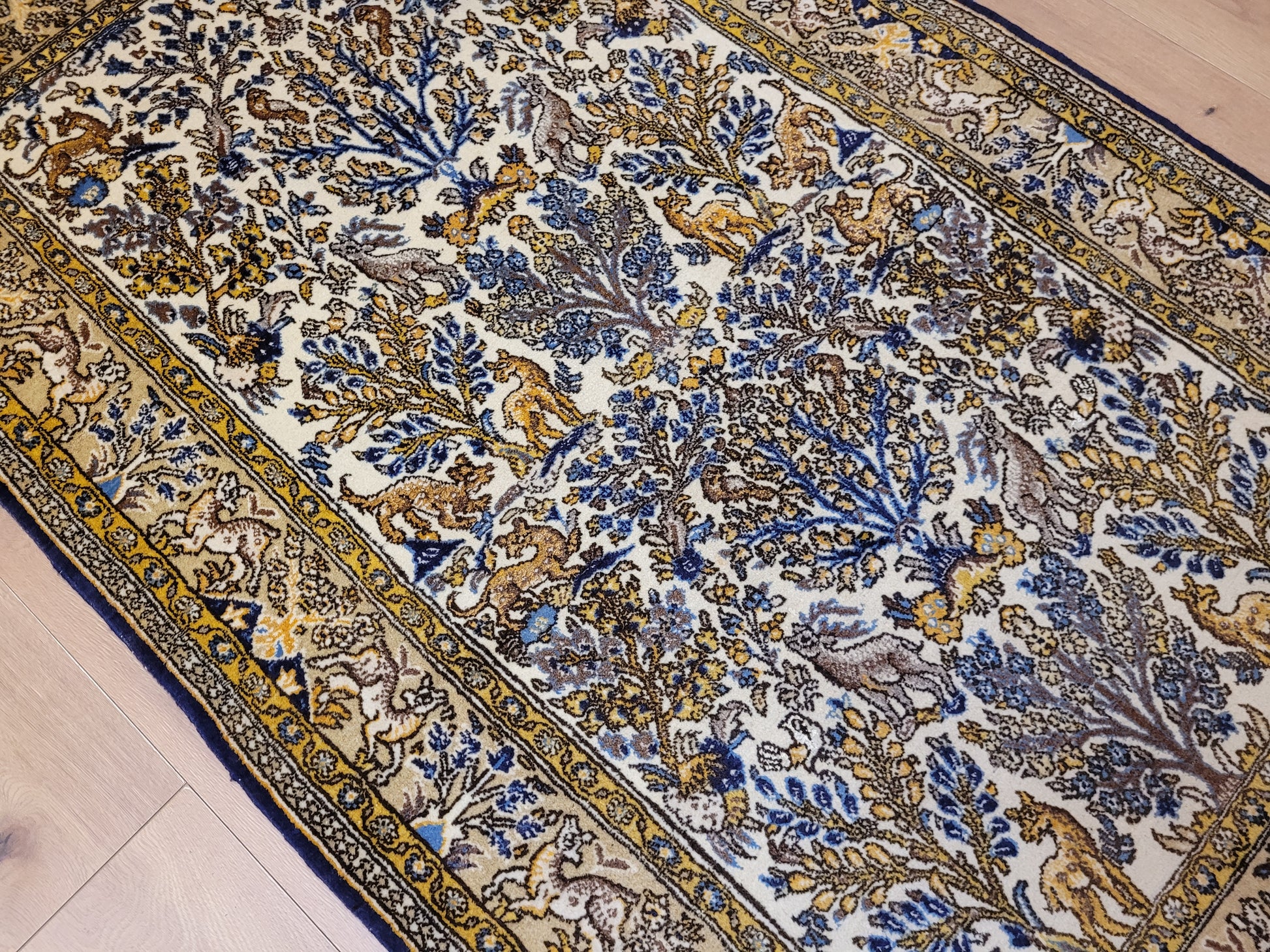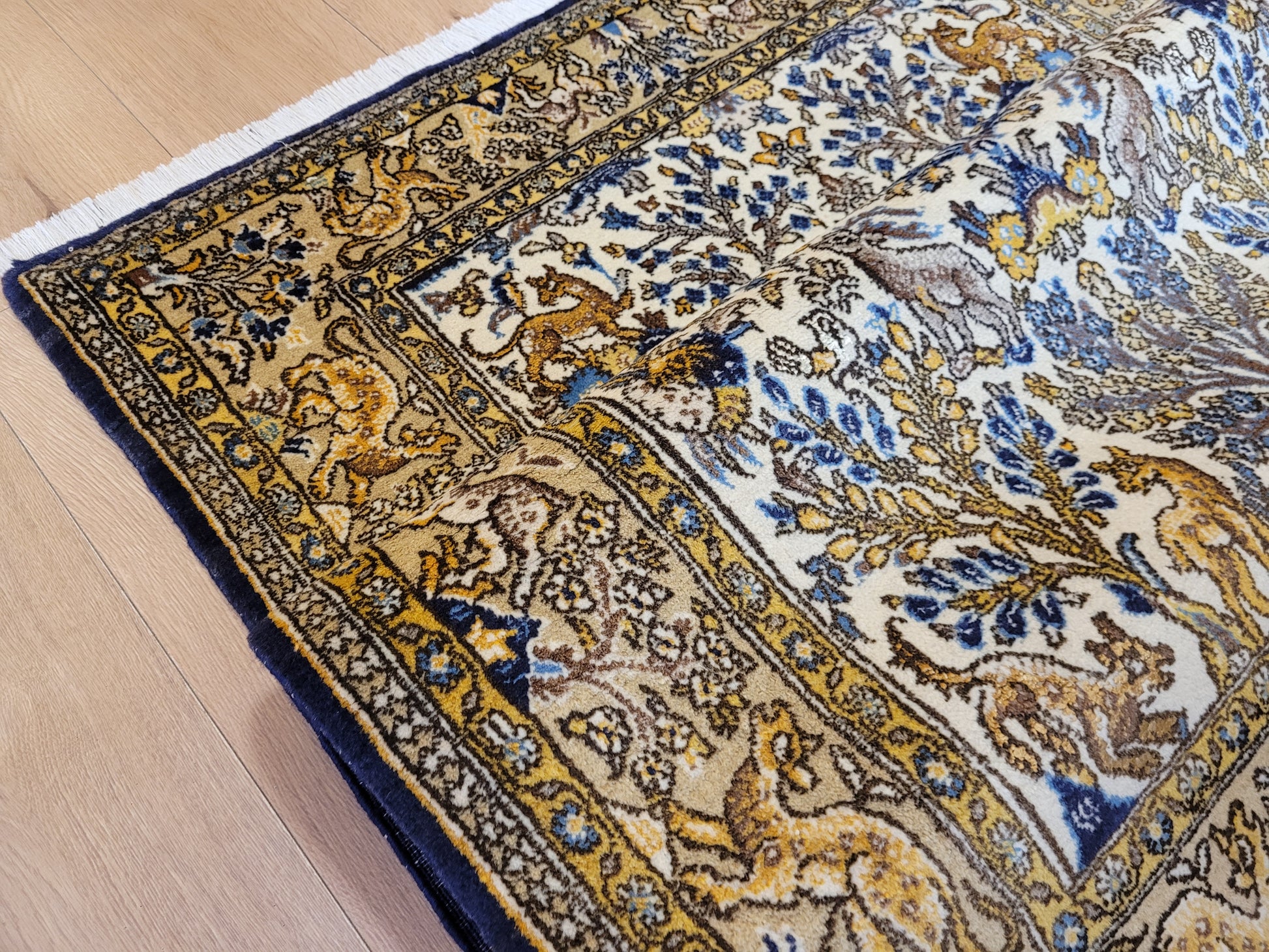 angeboten wird ein edler Ghom Teppich aus feiner Korkwolle auf Seide, handgeknüpft in meisterlicher Qualität. Das Motiv zeigt eine reich gestaltete Naturdarstellung mit Bäumen, floralen Elementen und zahlreichen Tieren wie Löwen, Hirschen und Fabelwesen. Die Bordüre ist detailreich ausgeführt und ergänzt das zentrale Bild mit harmonischen Ranken und Tiermotiven. Die Komposition besticht durch ihre Symmetrie und die feine Abstimmung der Farben.