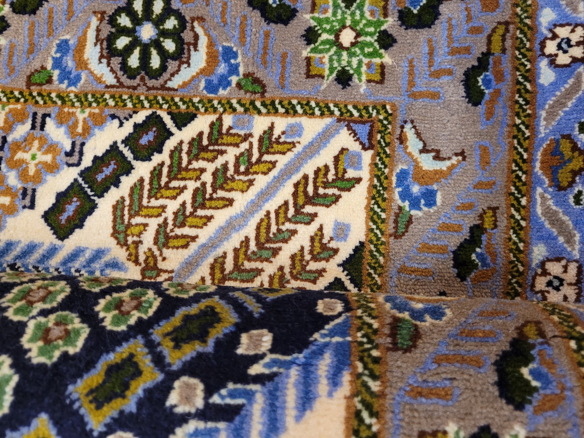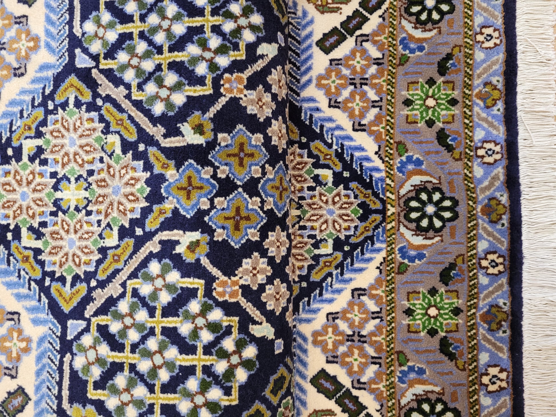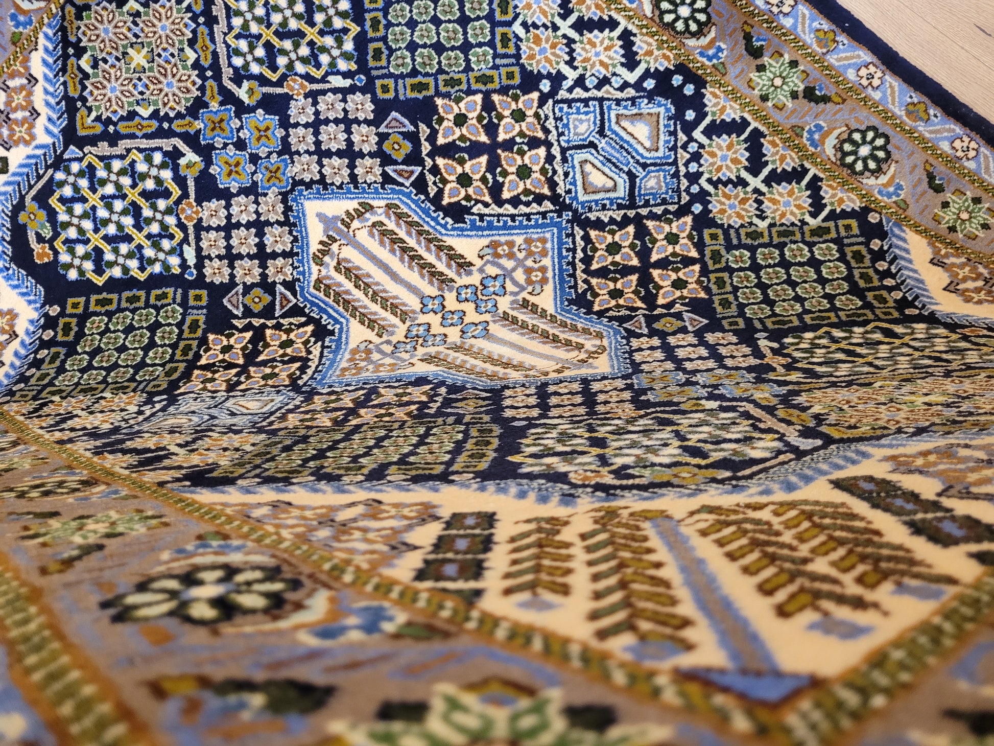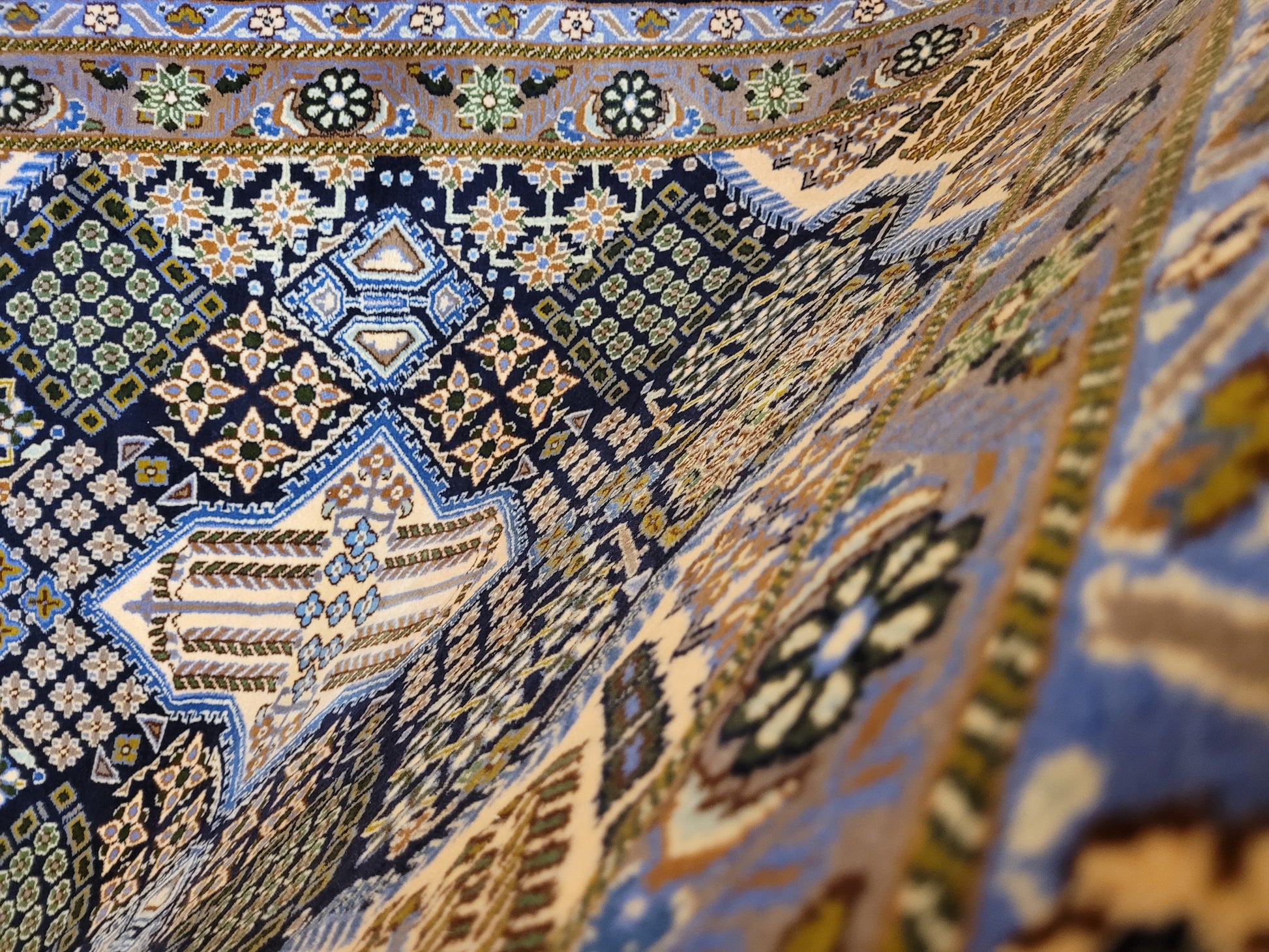 angeboten wird ein edler Ghom Teppich aus feiner Korkwolle, handgeknüpft in aufwendiger und detailreicher Knüpfkunst. Das Zentrum zeigt ein großflächiges, geometrisches Medaillon, umgeben von sternförmigen Mustern, filigranen Rauten und floralen Blütenornamenten. Die Farbkomposition mit Blau, Grün und Beige wird durch feine Akzente in Gold und Weiß harmonisch ergänzt.