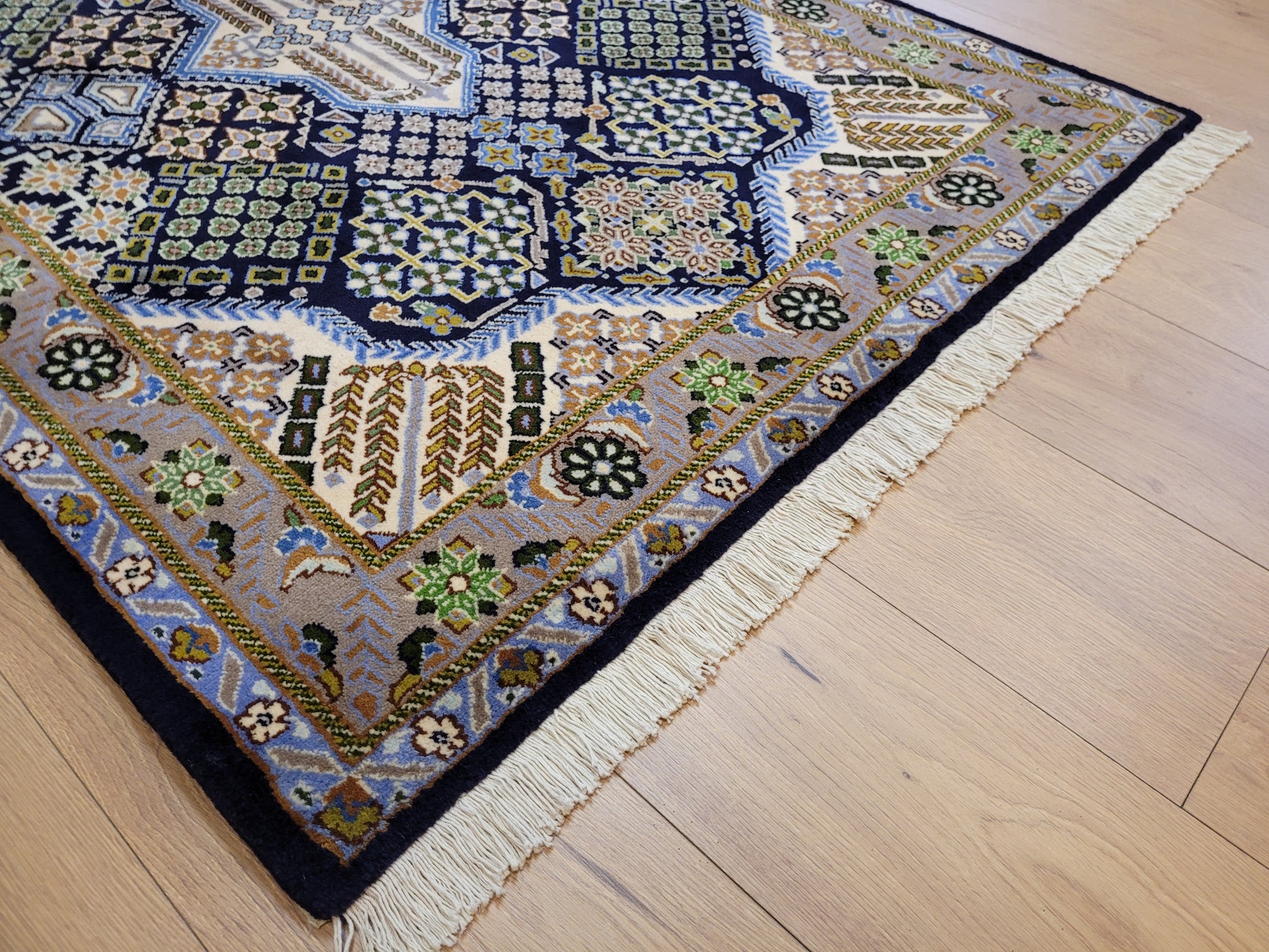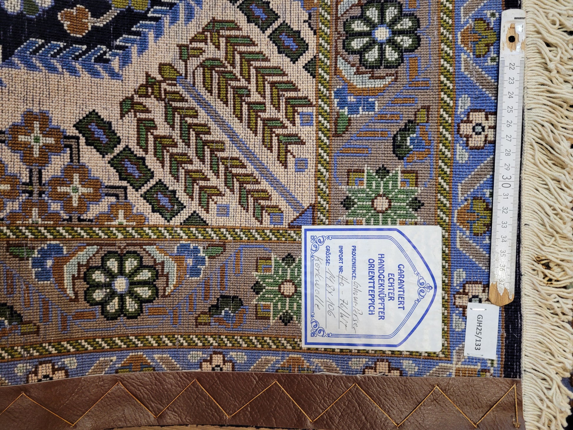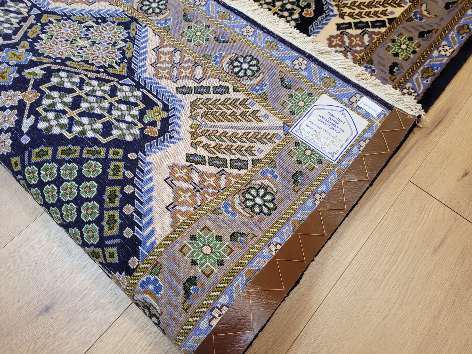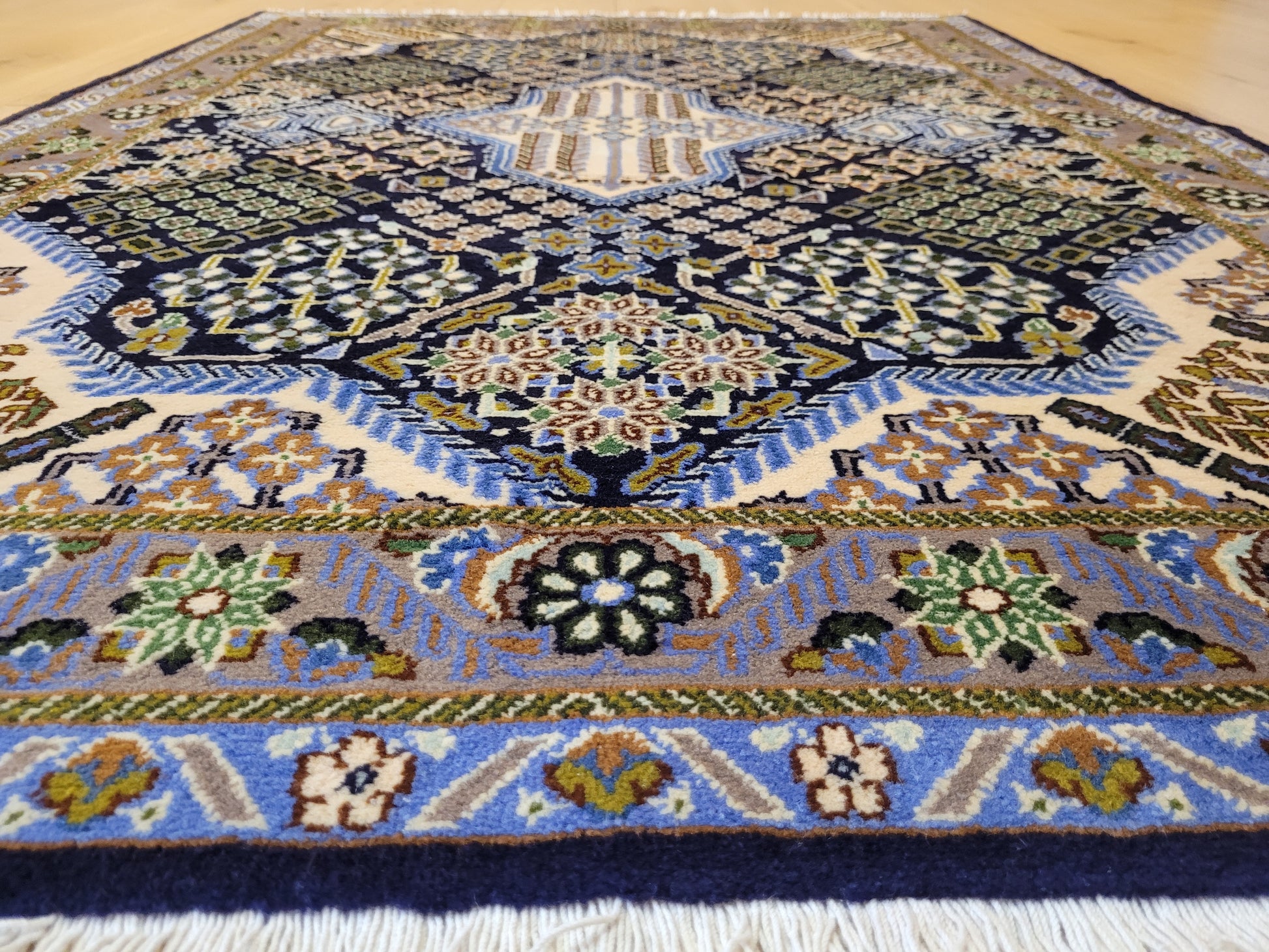 angeboten wird ein edler Ghom Teppich aus feiner Korkwolle, handgeknüpft in aufwendiger und detailreicher Knüpfkunst. Das Zentrum zeigt ein großflächiges, geometrisches Medaillon, umgeben von sternförmigen Mustern, filigranen Rauten und floralen Blütenornamenten. Die Farbkomposition mit Blau, Grün und Beige wird durch feine Akzente in Gold und Weiß harmonisch ergänzt.