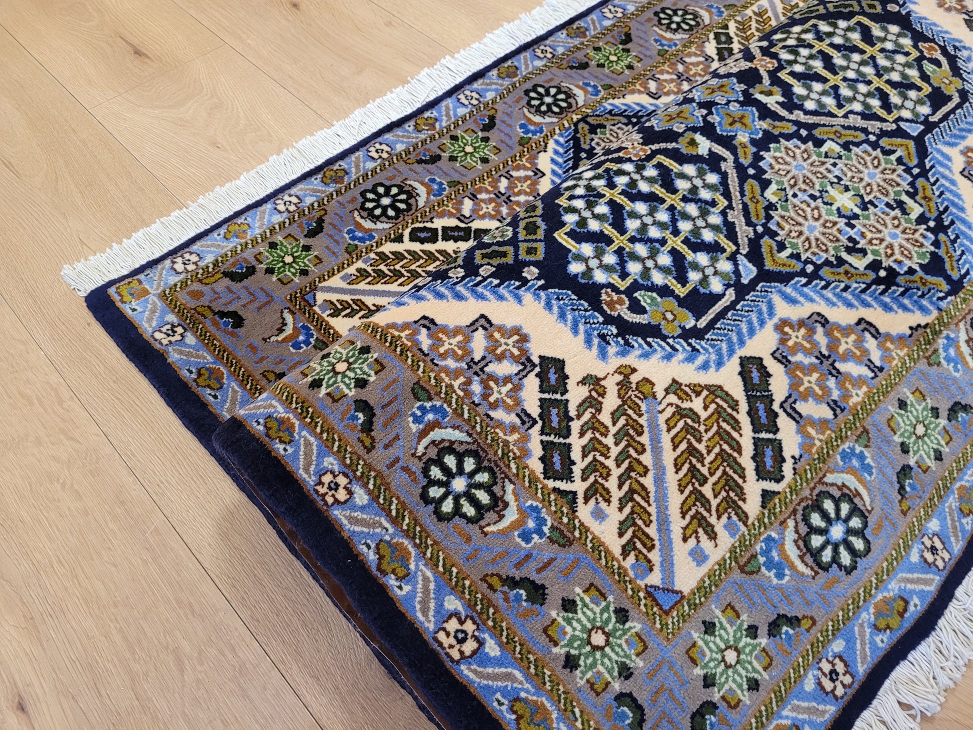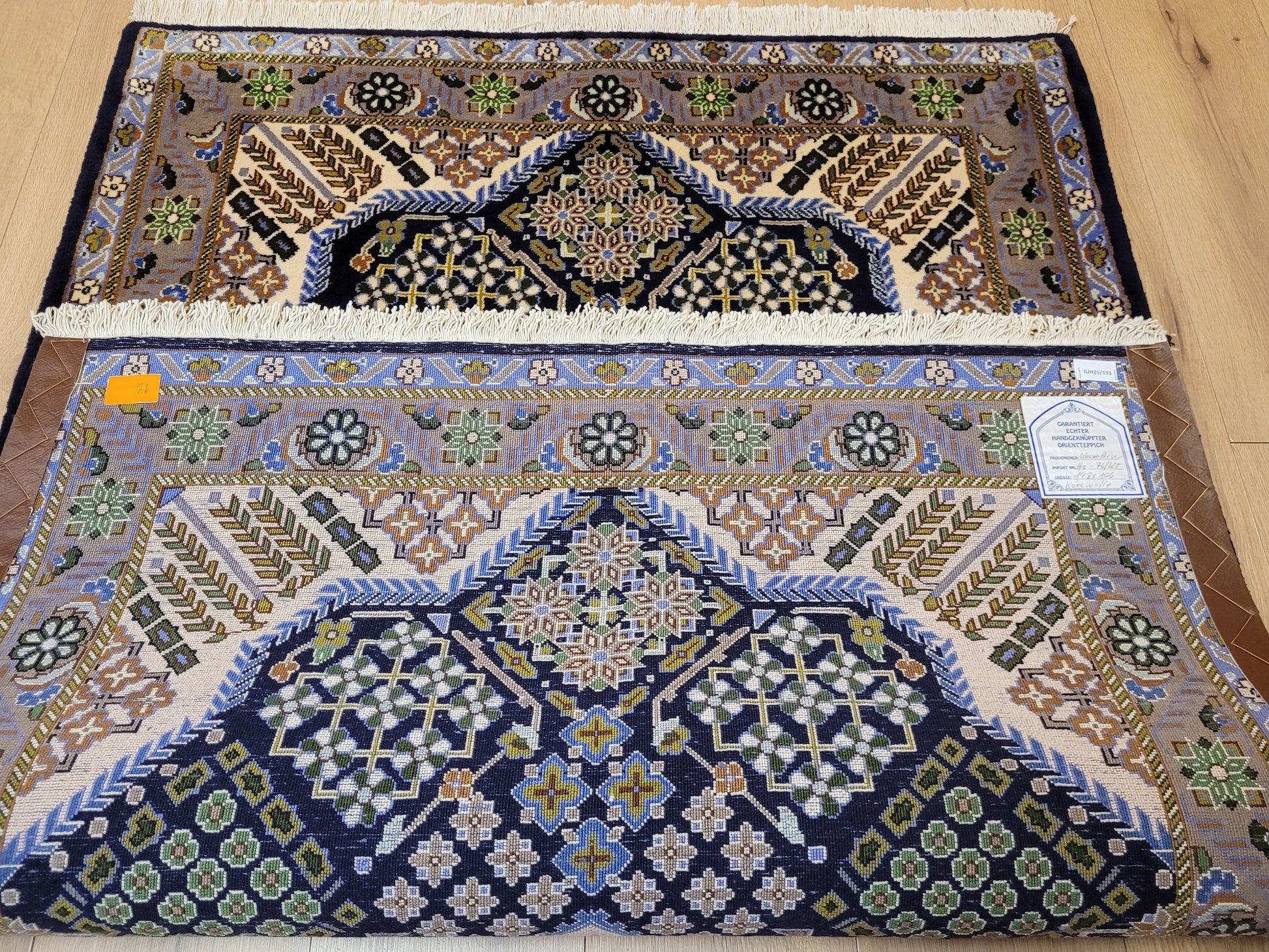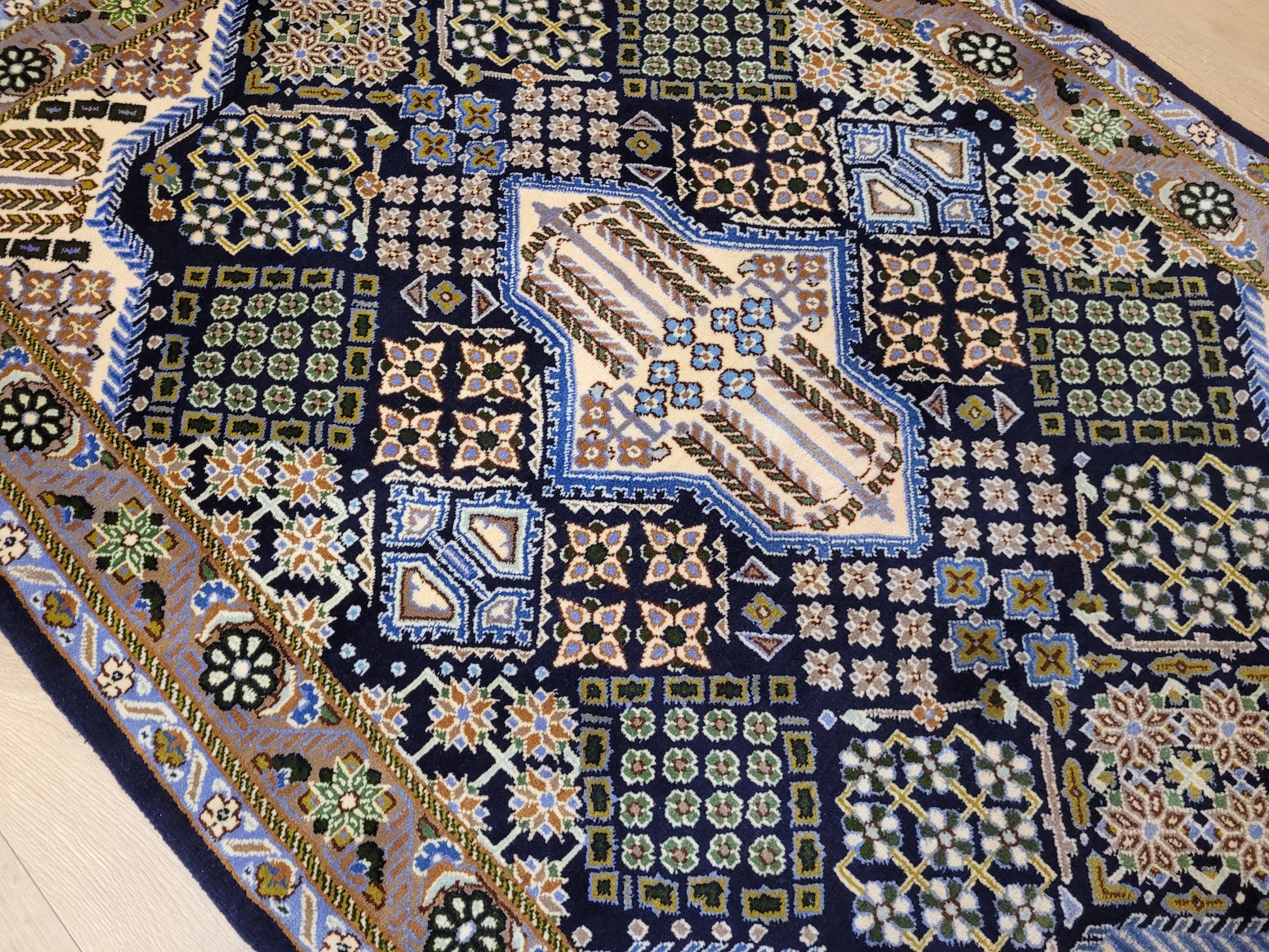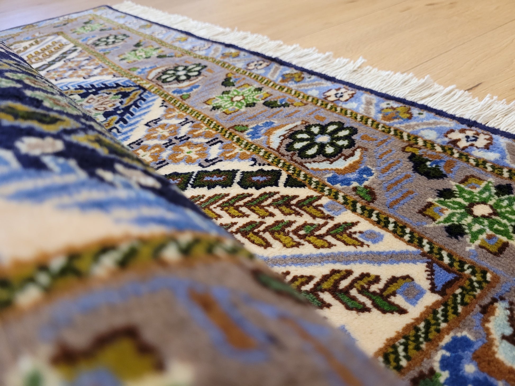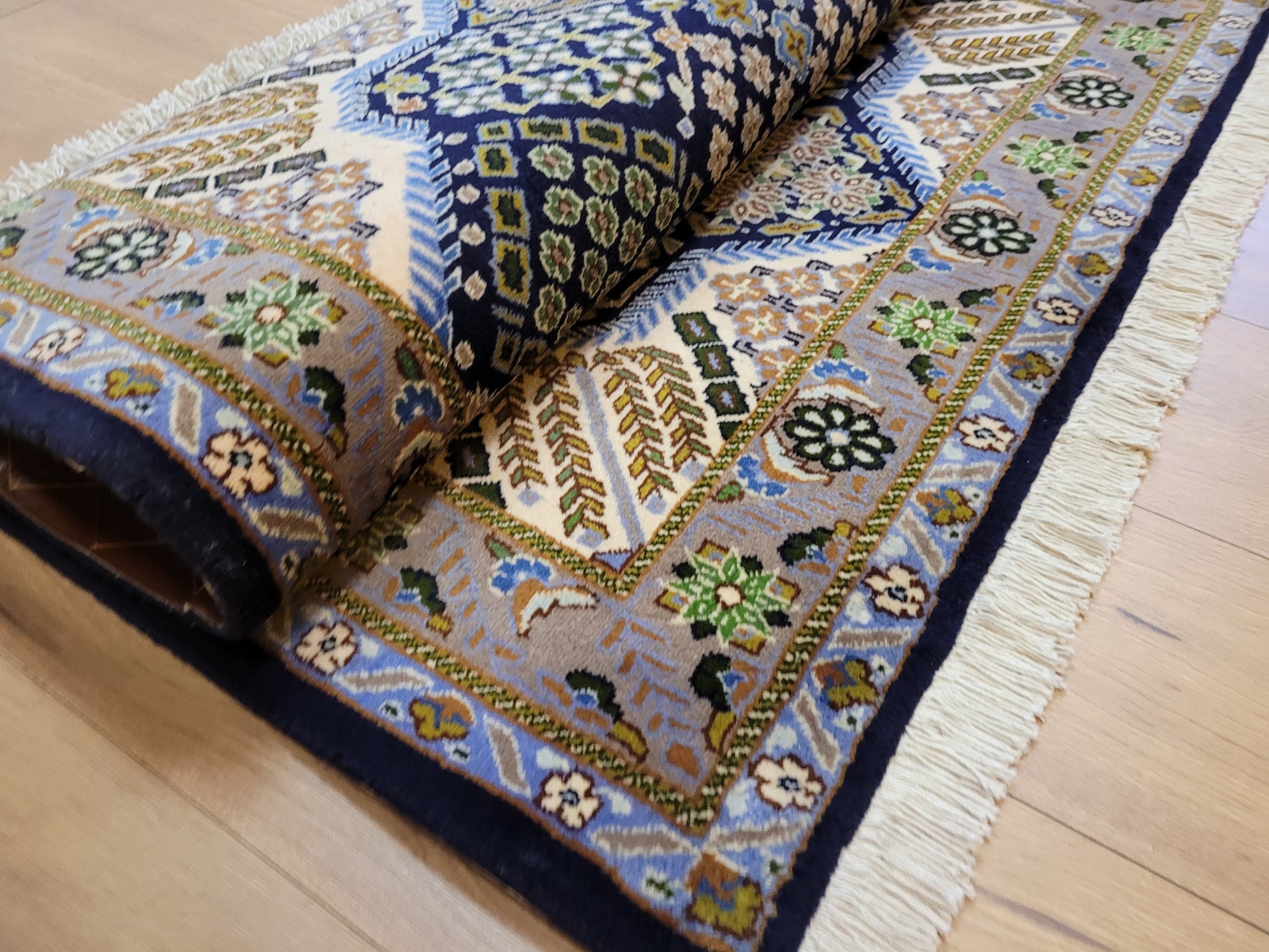 angeboten wird ein edler Ghom Teppich aus feiner Korkwolle, handgeknüpft in aufwendiger und detailreicher Knüpfkunst. Das Zentrum zeigt ein großflächiges, geometrisches Medaillon, umgeben von sternförmigen Mustern, filigranen Rauten und floralen Blütenornamenten. Die Farbkomposition mit Blau, Grün und Beige wird durch feine Akzente in Gold und Weiß harmonisch ergänzt.