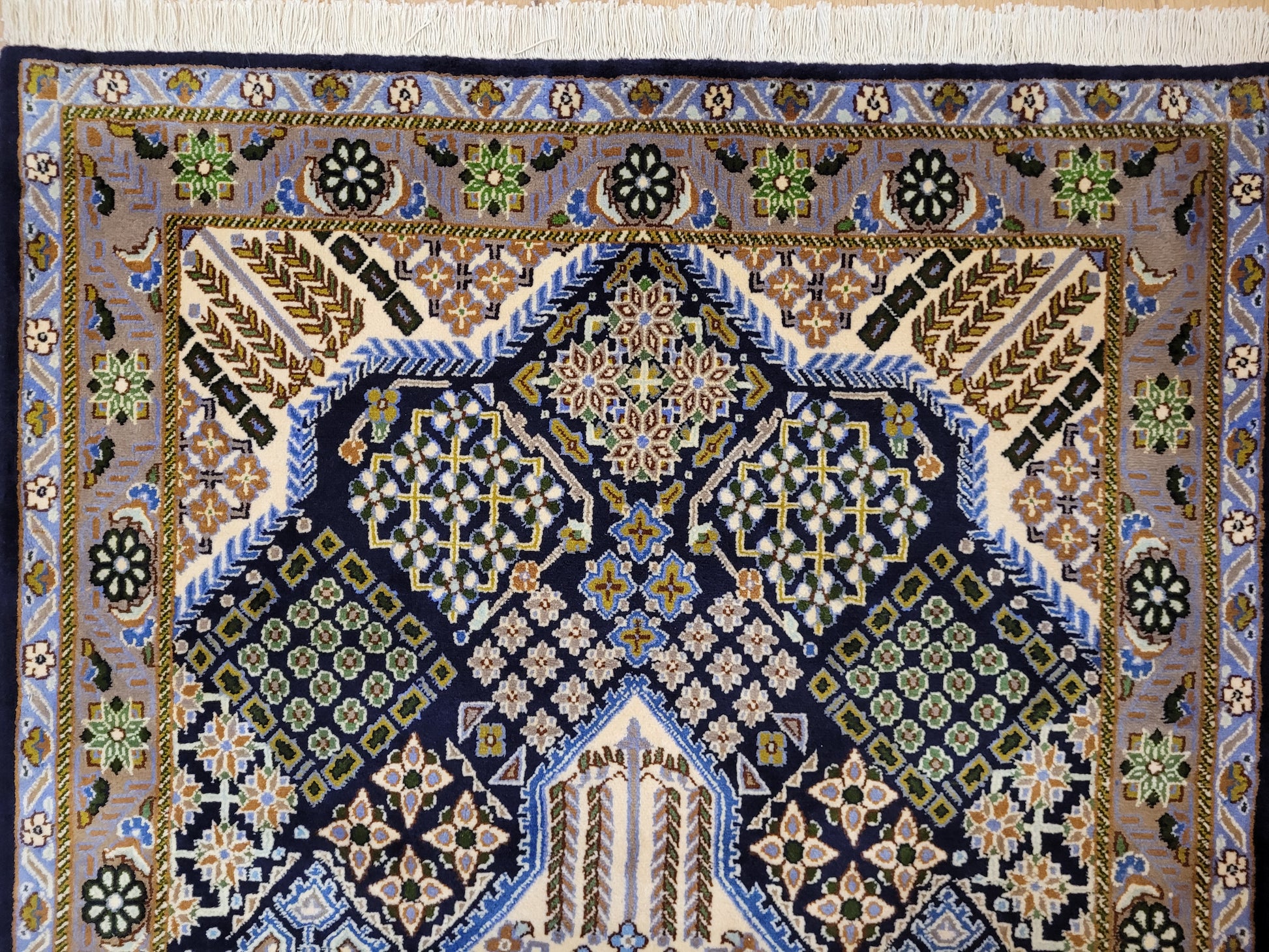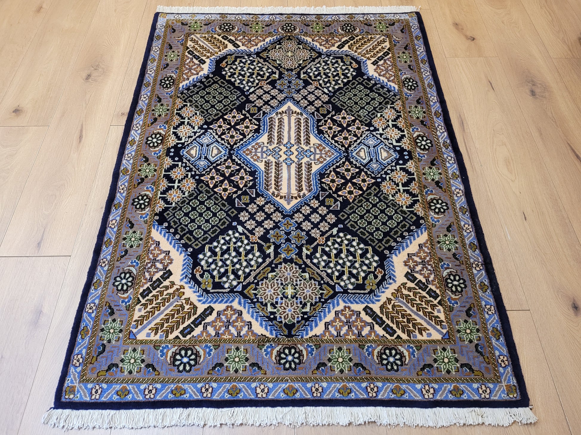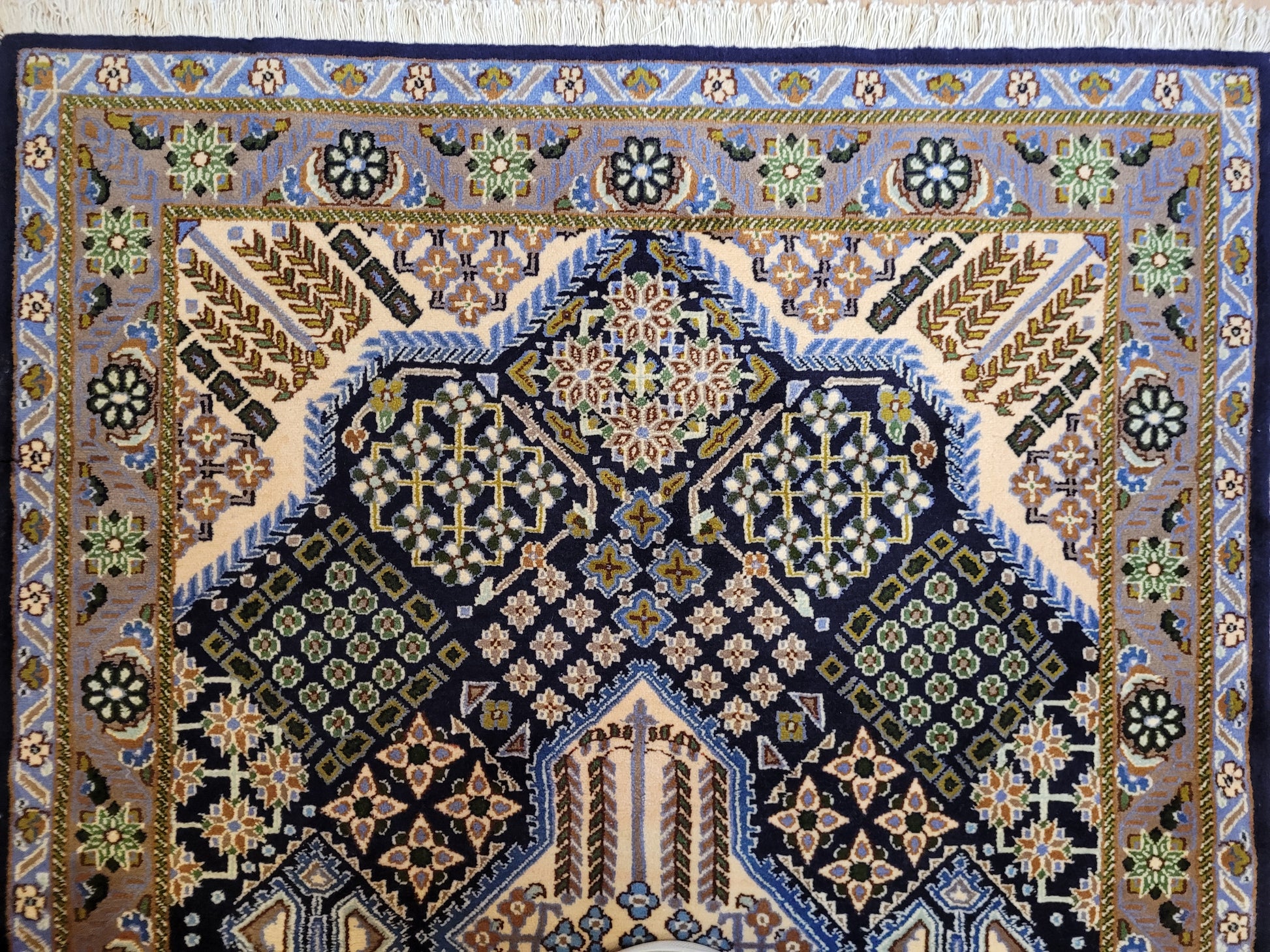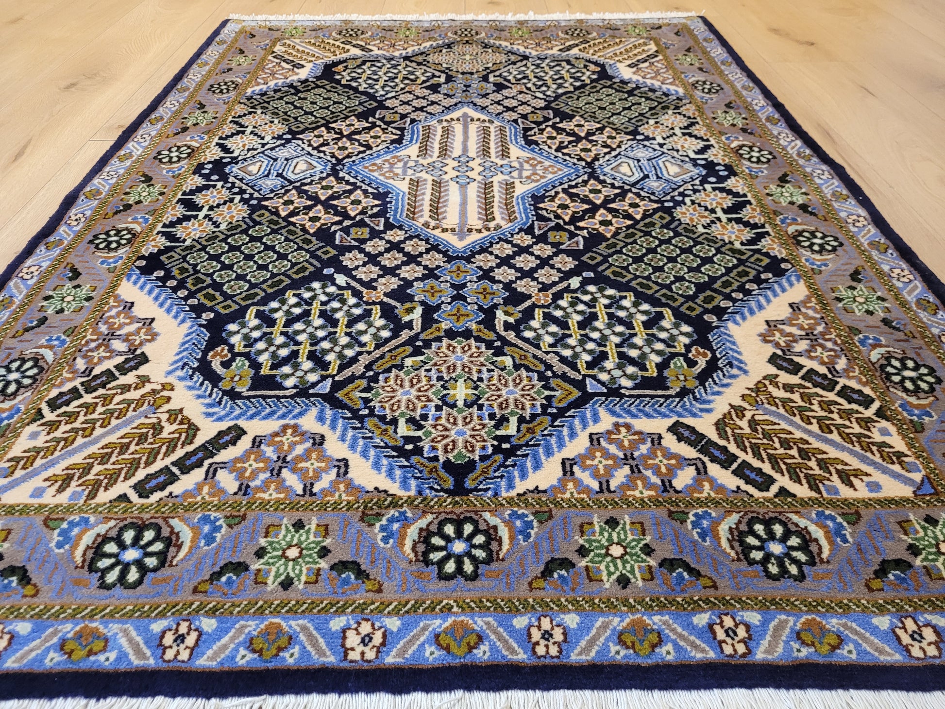 angeboten wird ein edler Ghom Teppich aus feiner Korkwolle, handgeknüpft in aufwendiger und detailreicher Knüpfkunst. Das Zentrum zeigt ein großflächiges, geometrisches Medaillon, umgeben von sternförmigen Mustern, filigranen Rauten und floralen Blütenornamenten. Die Farbkomposition mit Blau, Grün und Beige wird durch feine Akzente in Gold und Weiß harmonisch ergänzt.