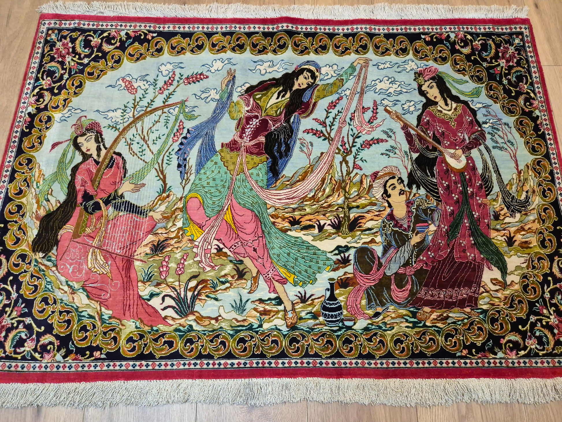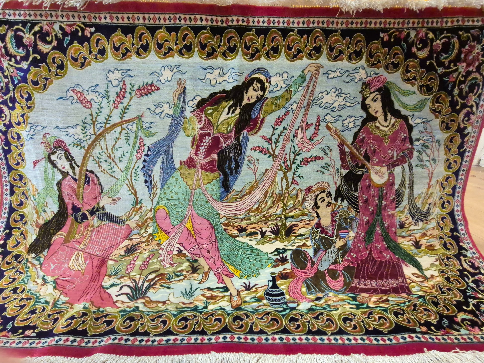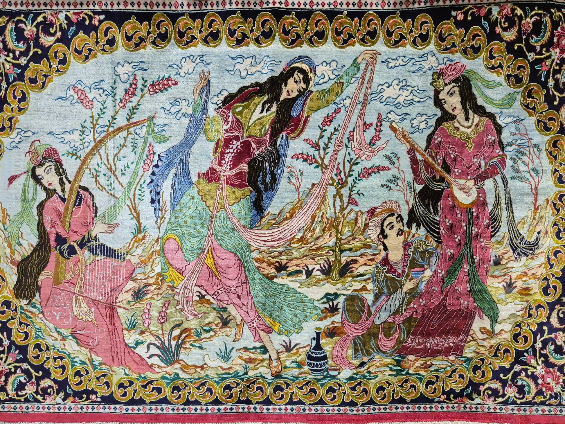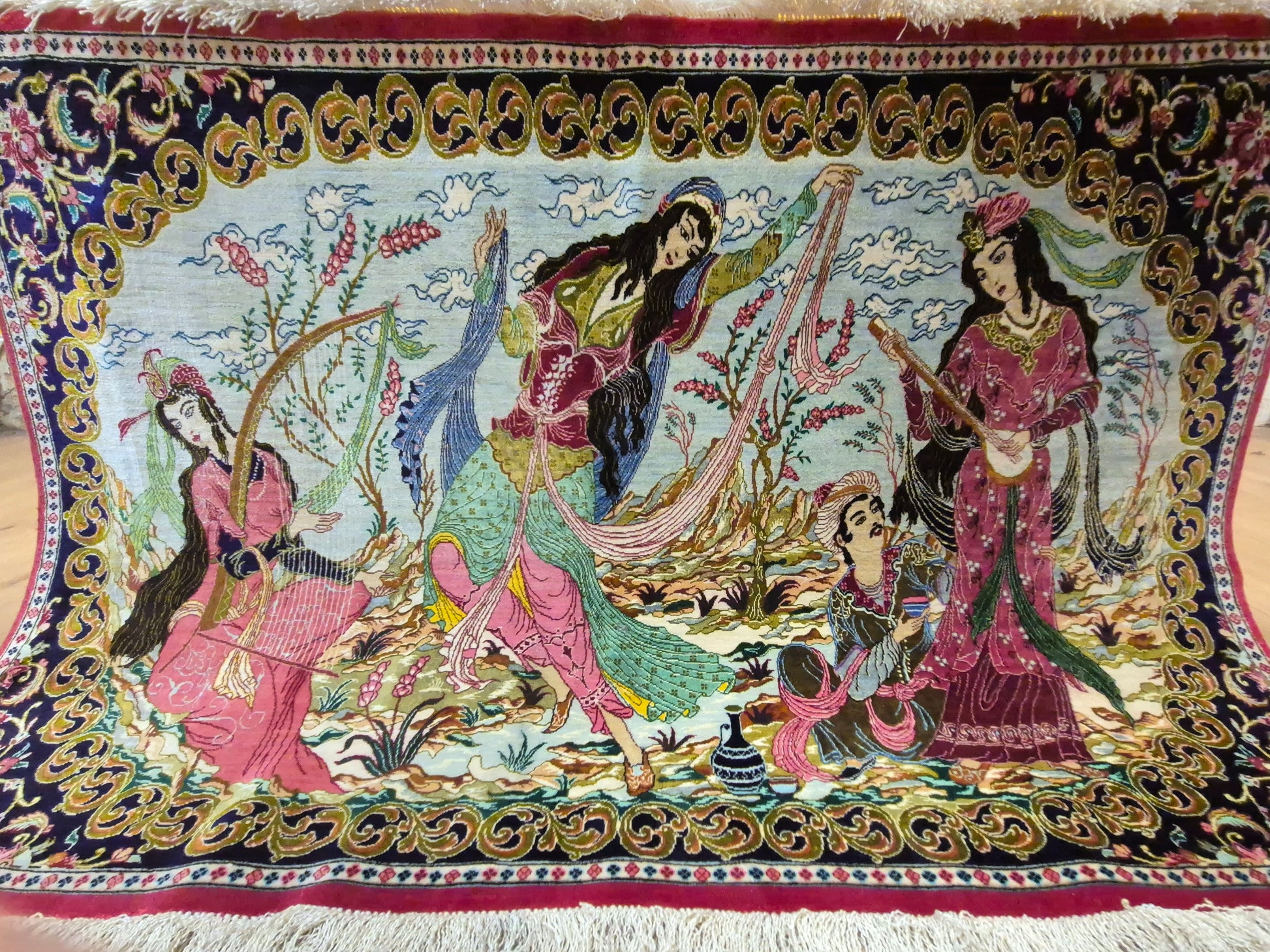 angeboten wird ein edler Ghom Teppich aus reiner Seide, handgeknüpft in äußerst feiner Ausführung. Das kunstvolle Motiv zeigt eine figürliche Szene mit vier Damen und einem sitzenden Mann: musizierend, tanzend und in lebendiger Interaktion. Die Komposition wird von einer farbenprächtigen Landschaft mit Blüten, Ranken und Bäumen begleitet.