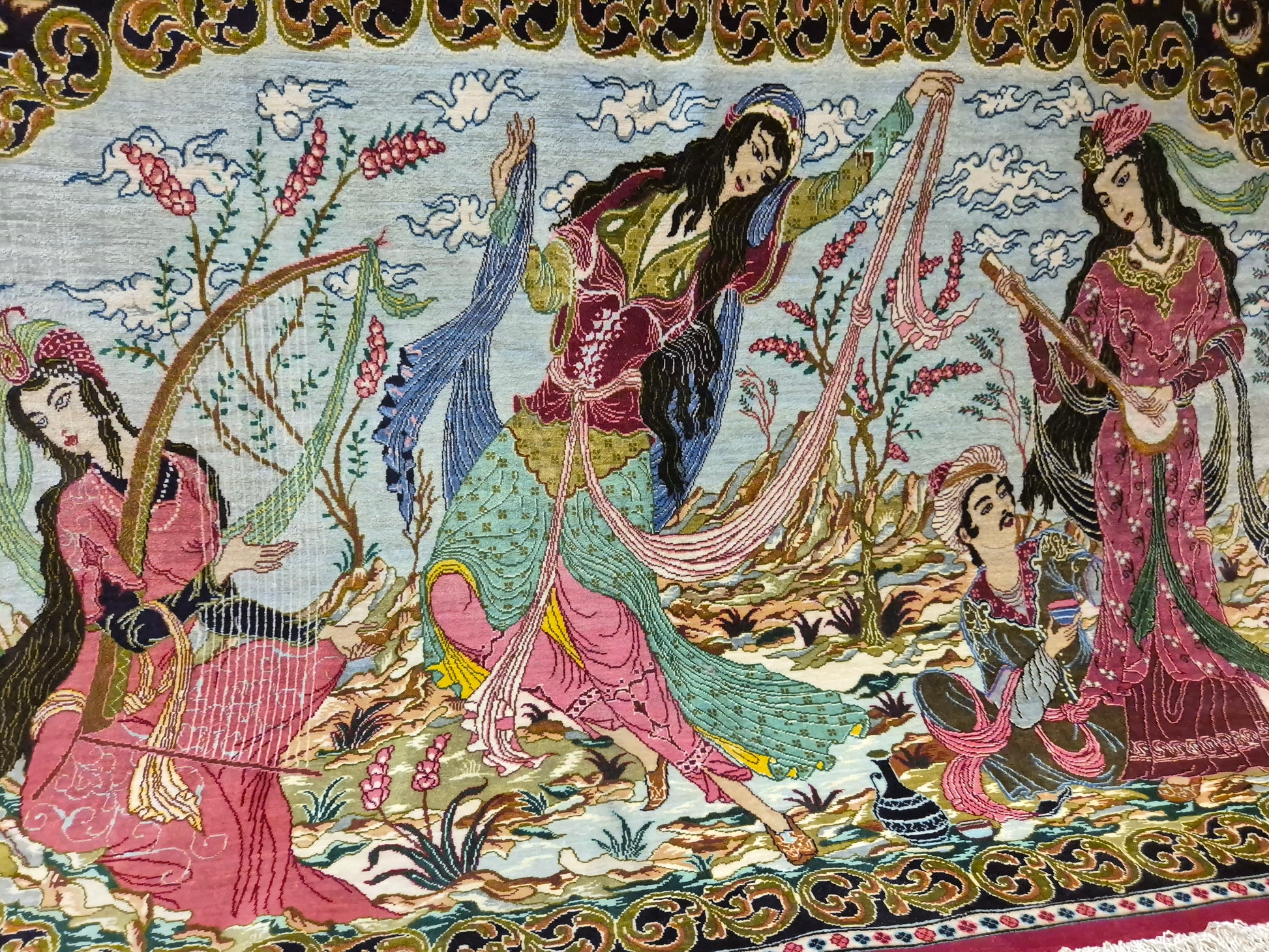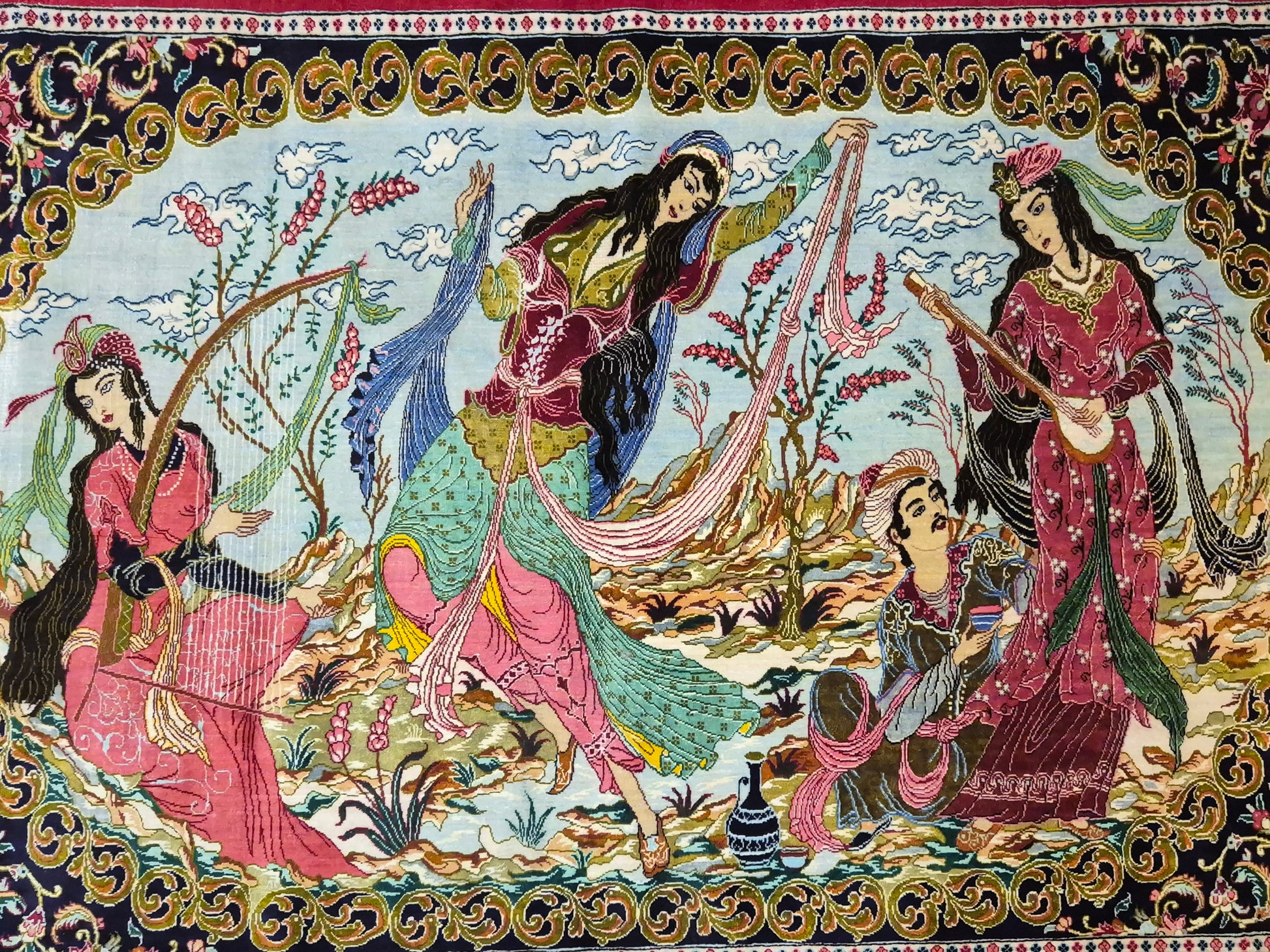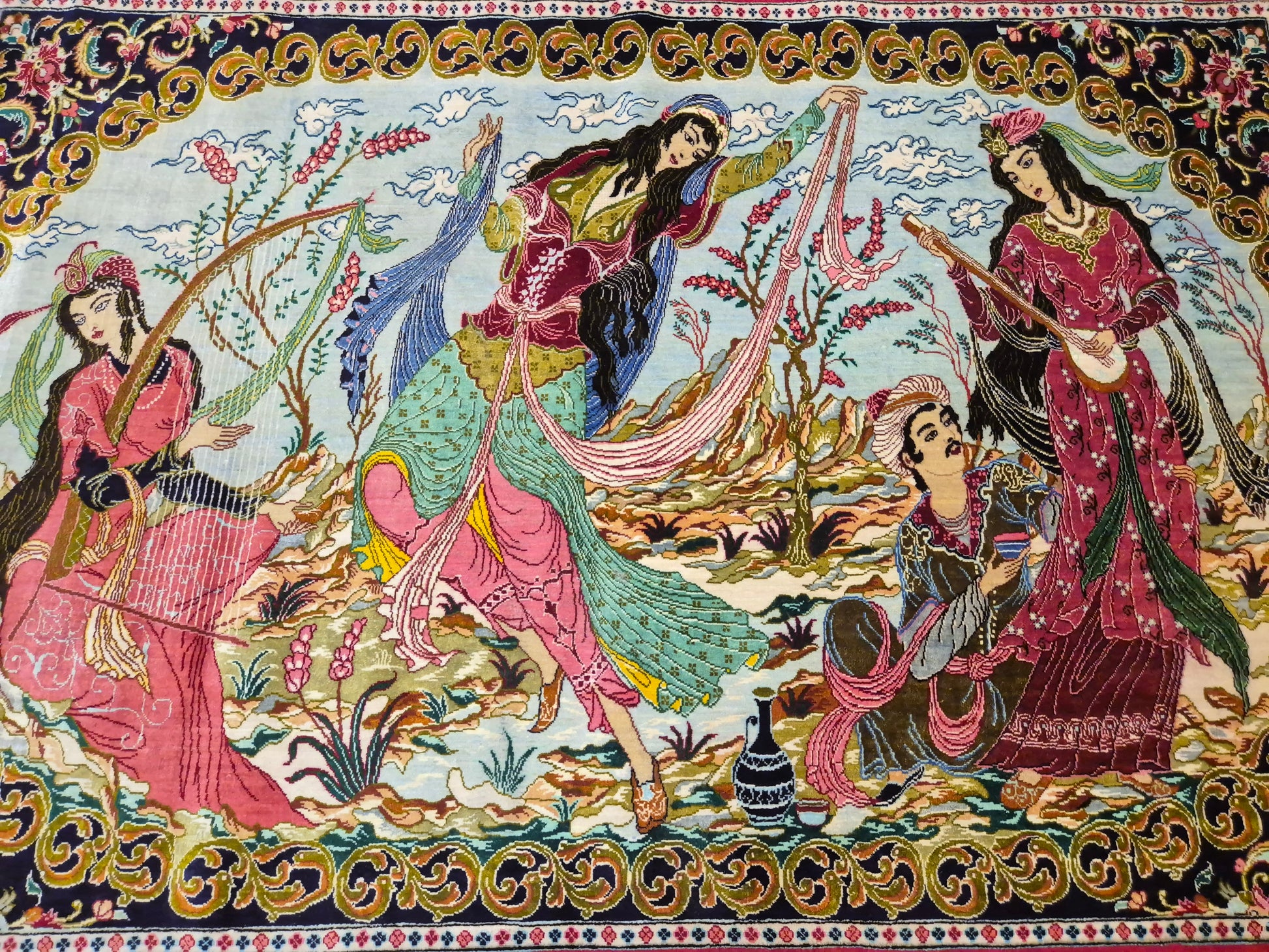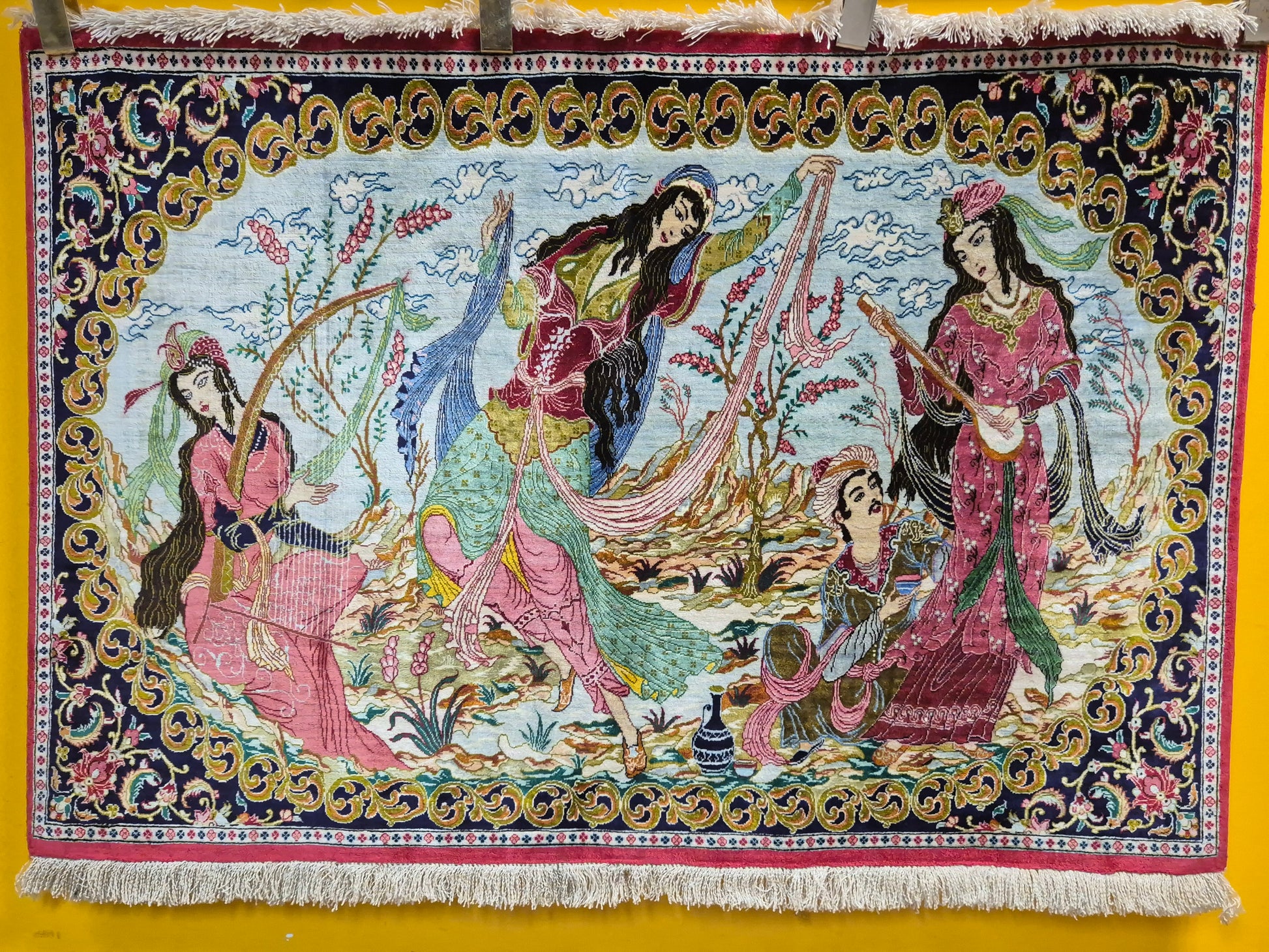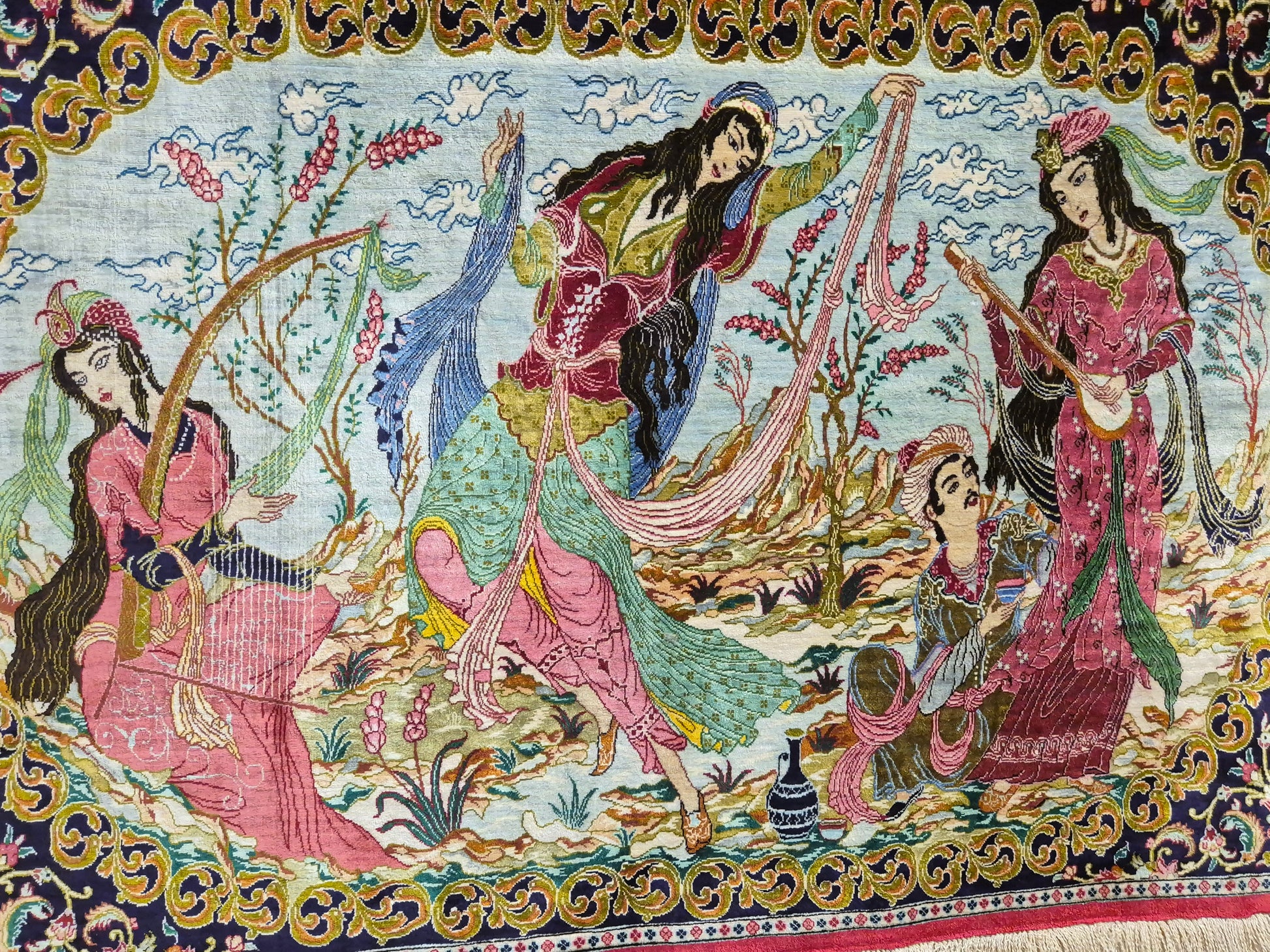 angeboten wird ein edler Ghom Teppich aus reiner Seide, handgeknüpft in äußerst feiner Ausführung. Das kunstvolle Motiv zeigt eine figürliche Szene mit vier Damen und einem sitzenden Mann: musizierend, tanzend und in lebendiger Interaktion. Die Komposition wird von einer farbenprächtigen Landschaft mit Blüten, Ranken und Bäumen begleitet.