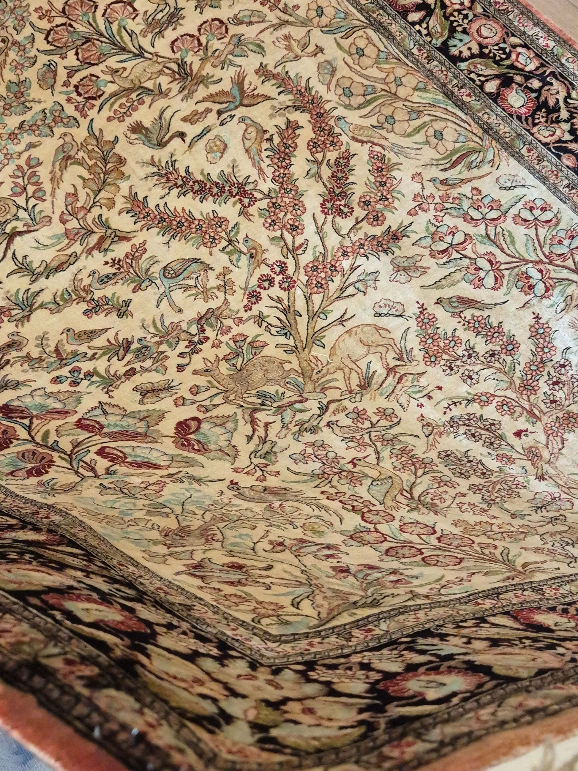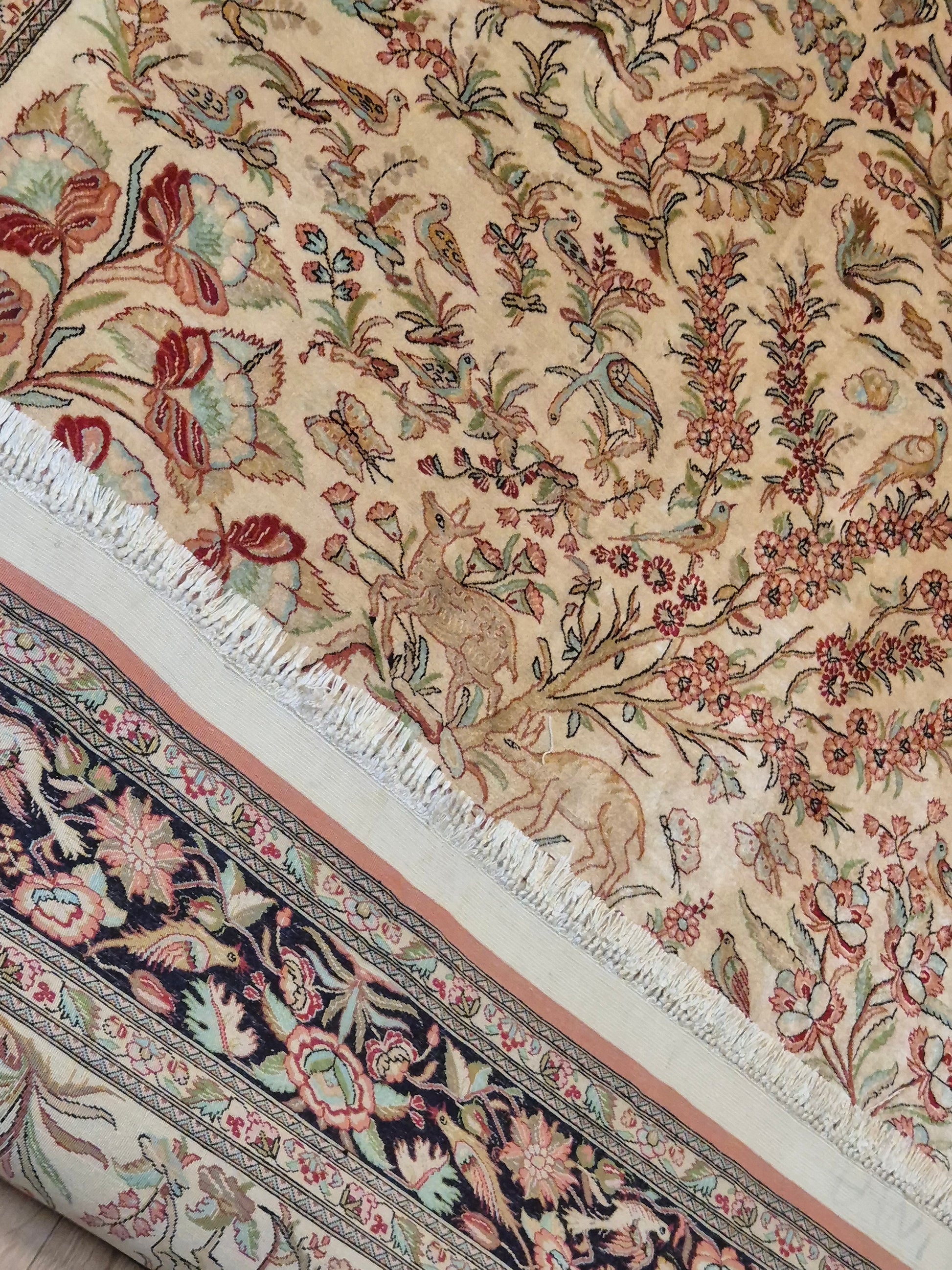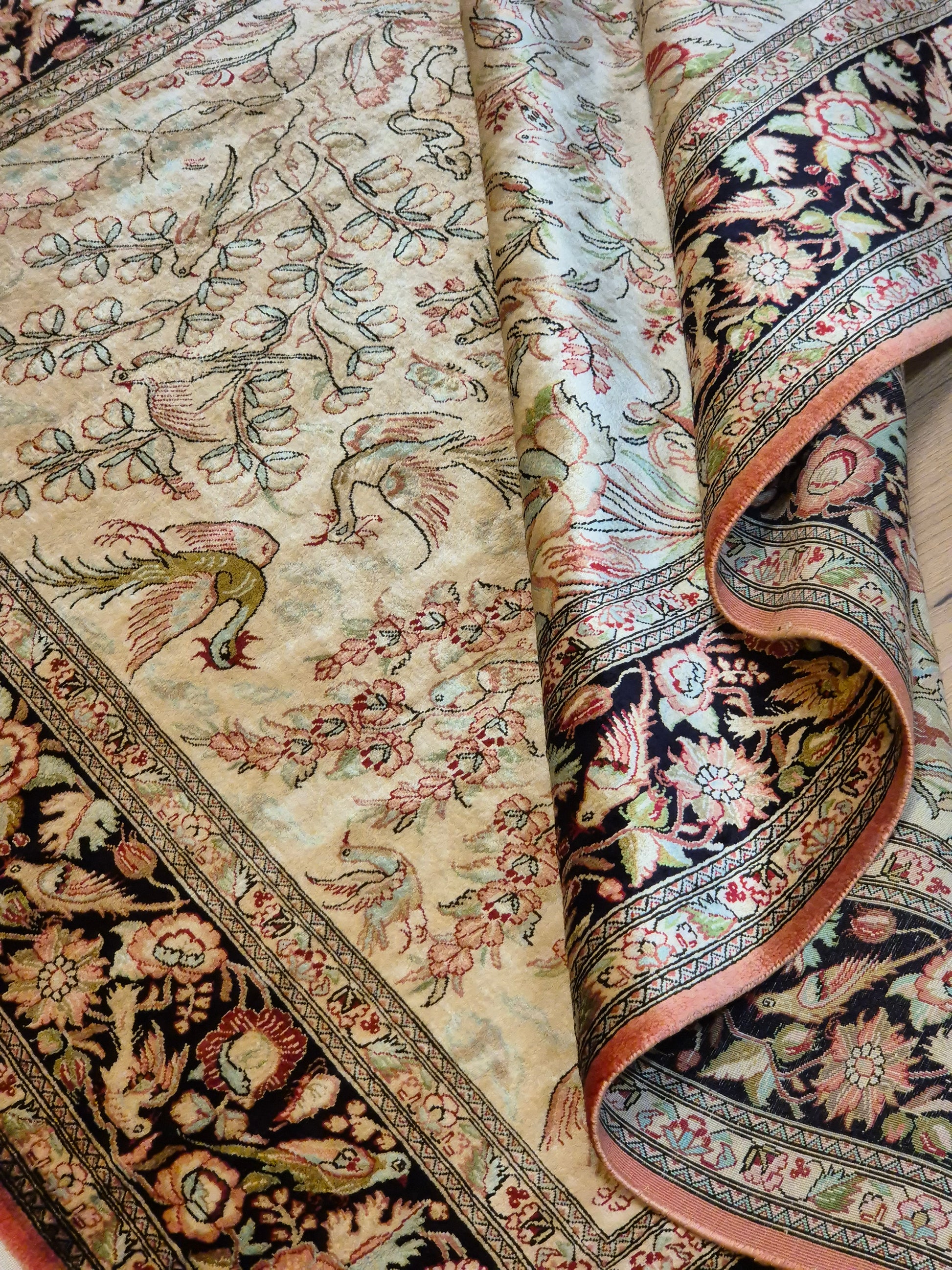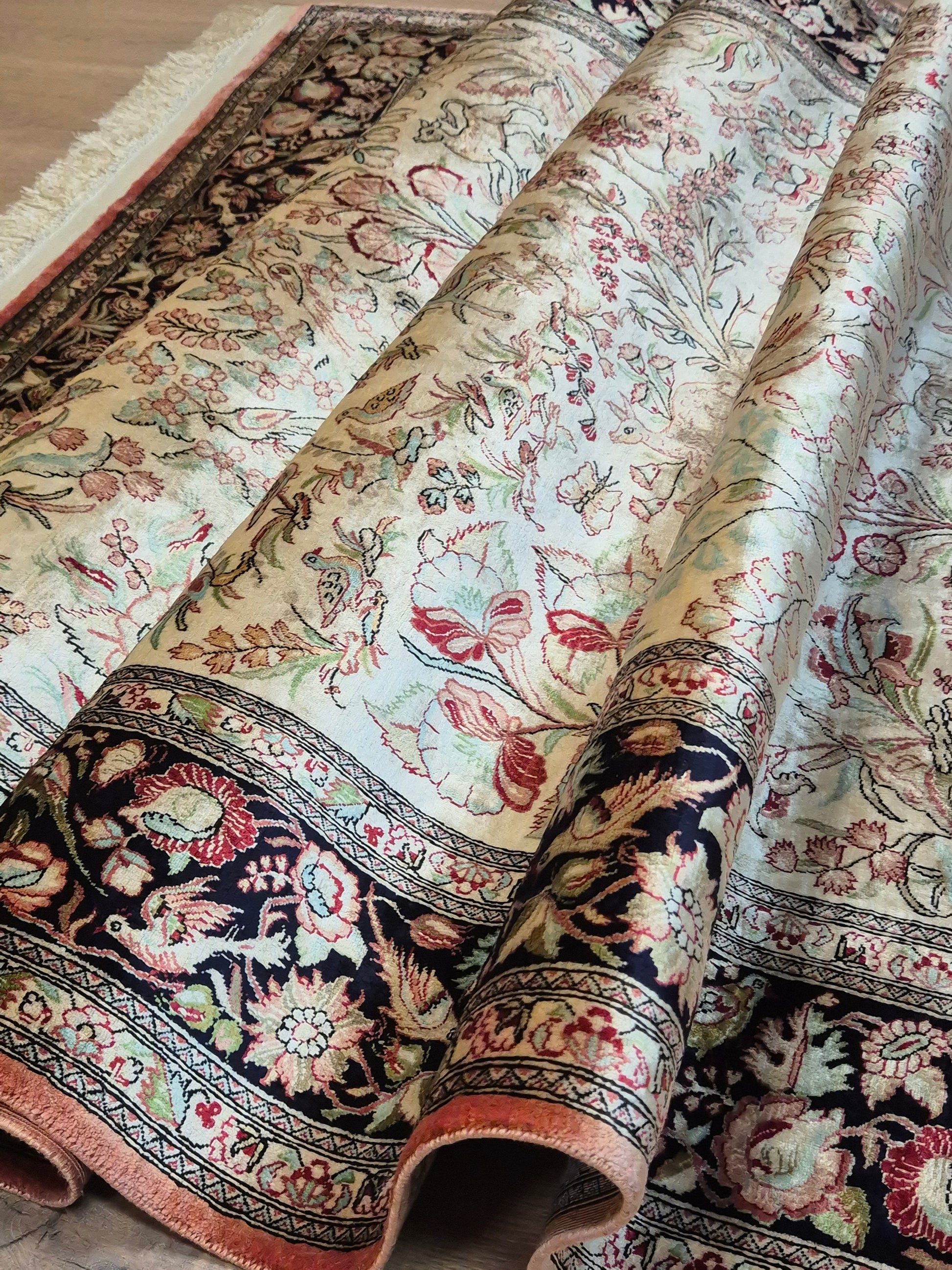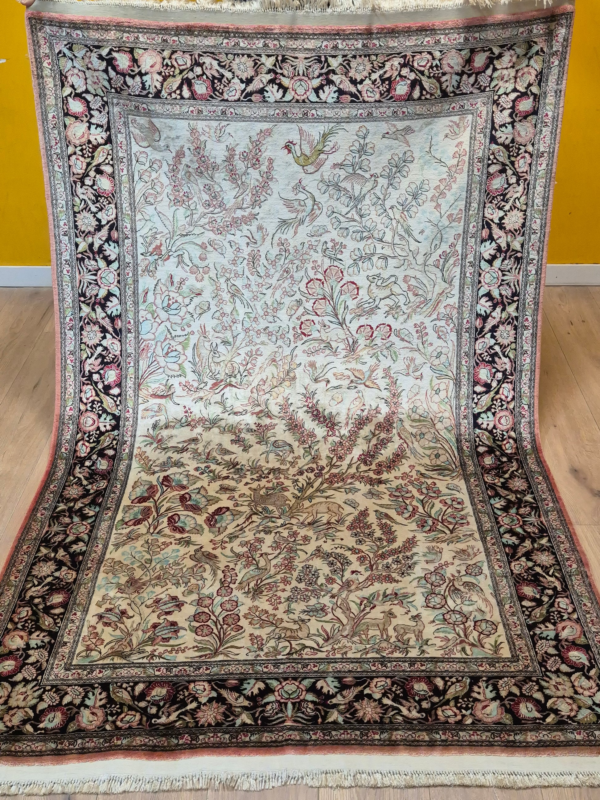 angeboten wird ein edler Ghom Teppich aus reiner Seide auf Seide, handgeknüpft in äußerst feiner Ausführung. Das Design zeigt ein Paradiesgarten-Motiv mit detailreich dargestellten Vögeln, blühenden Zweigen und zarten Ranken – kunstvoll arrangiert auf hellem Fond.
