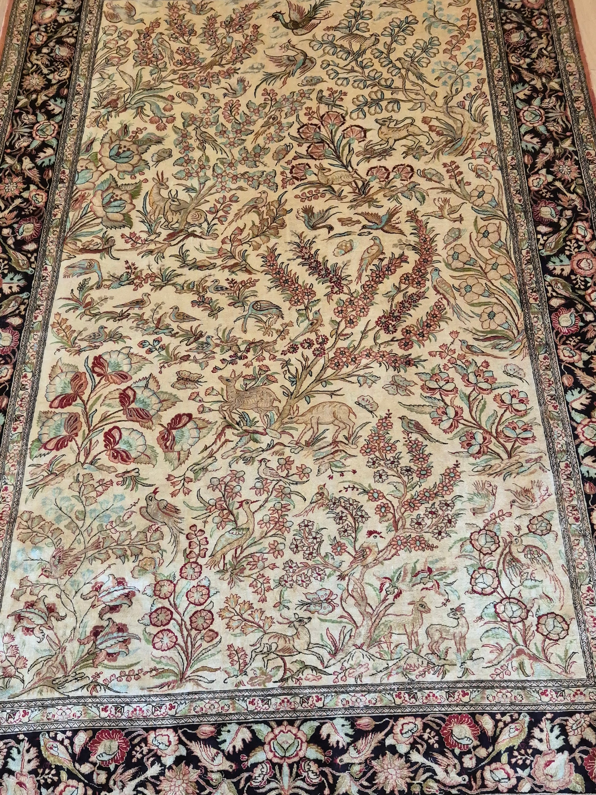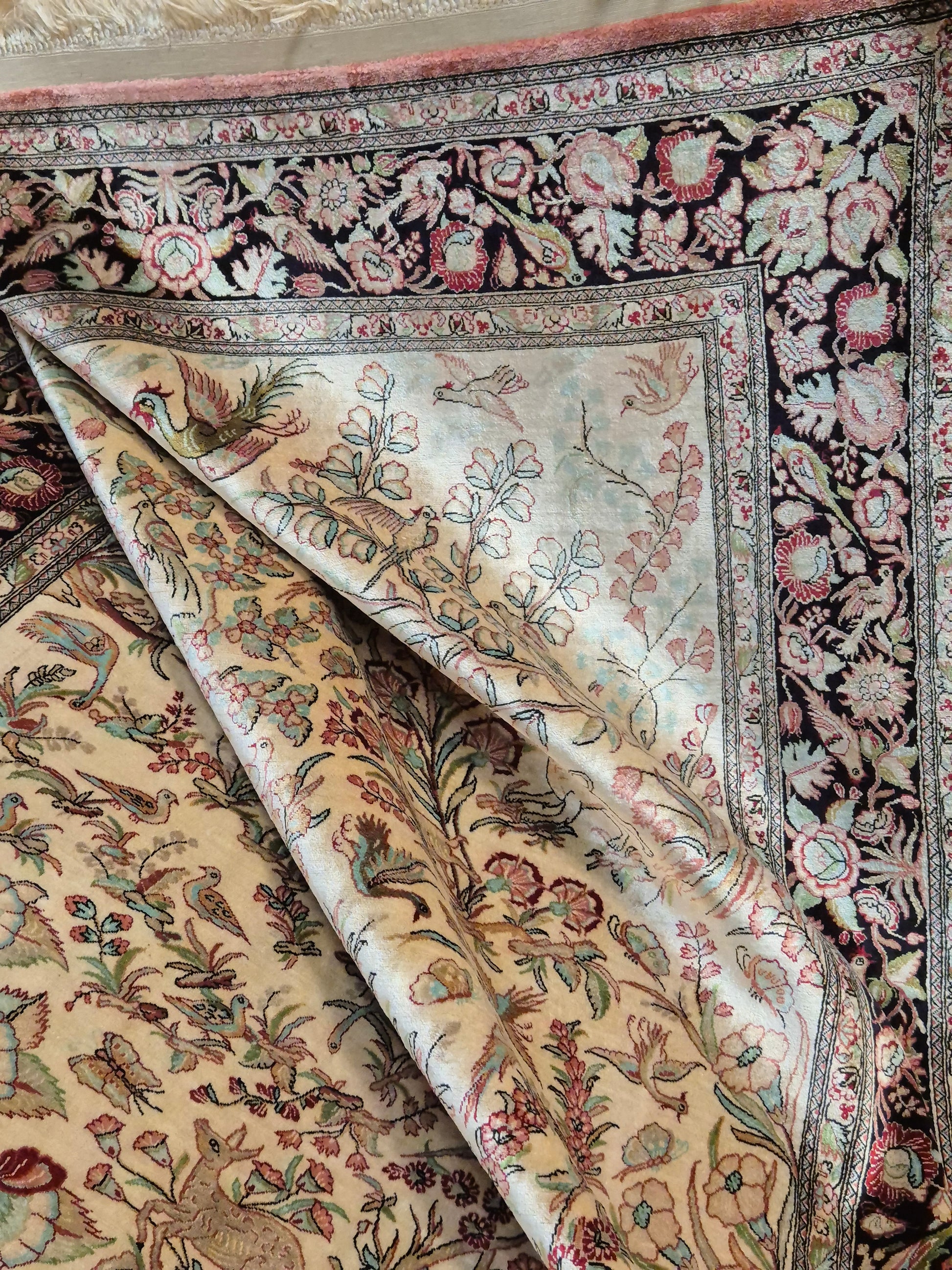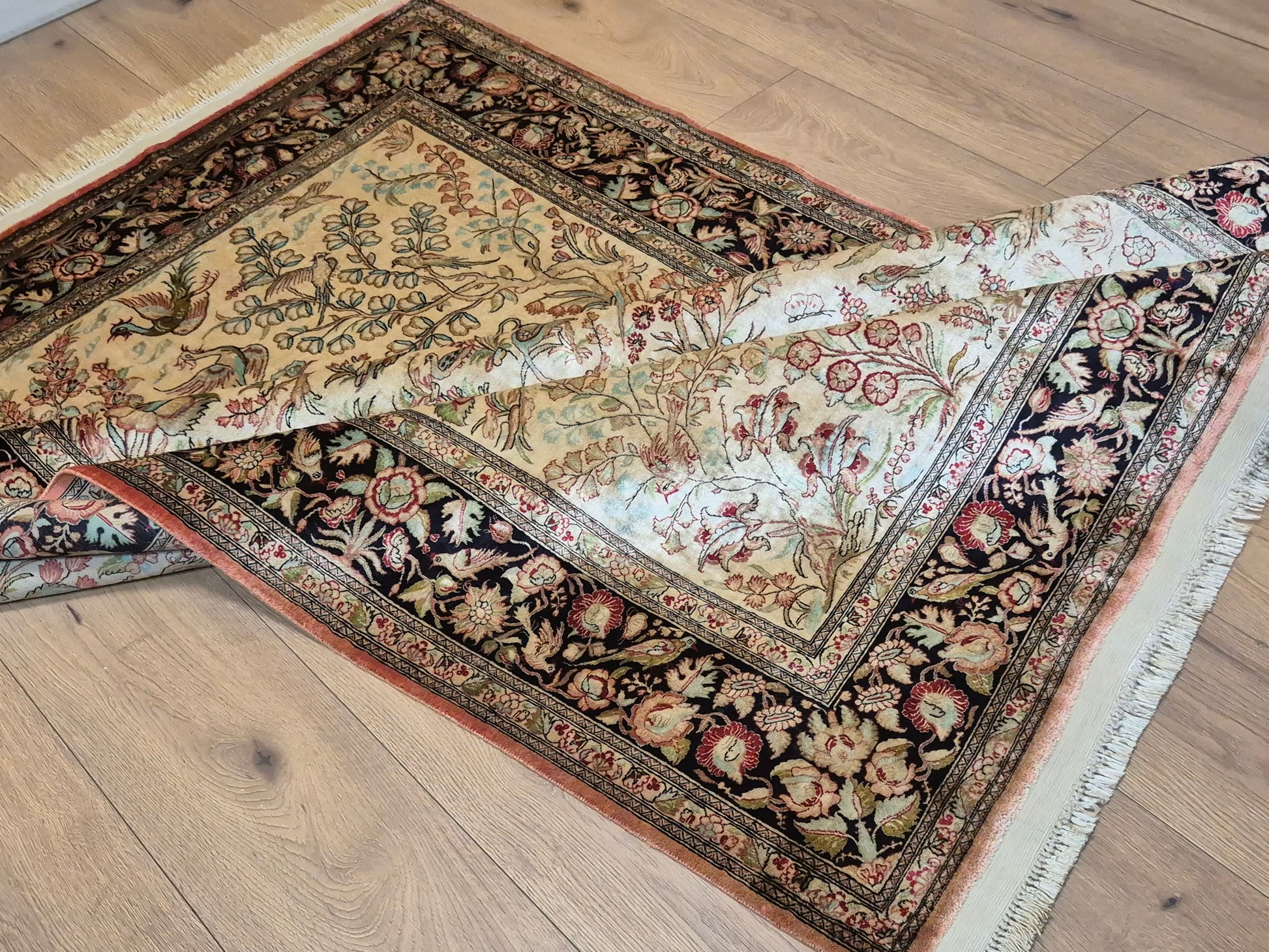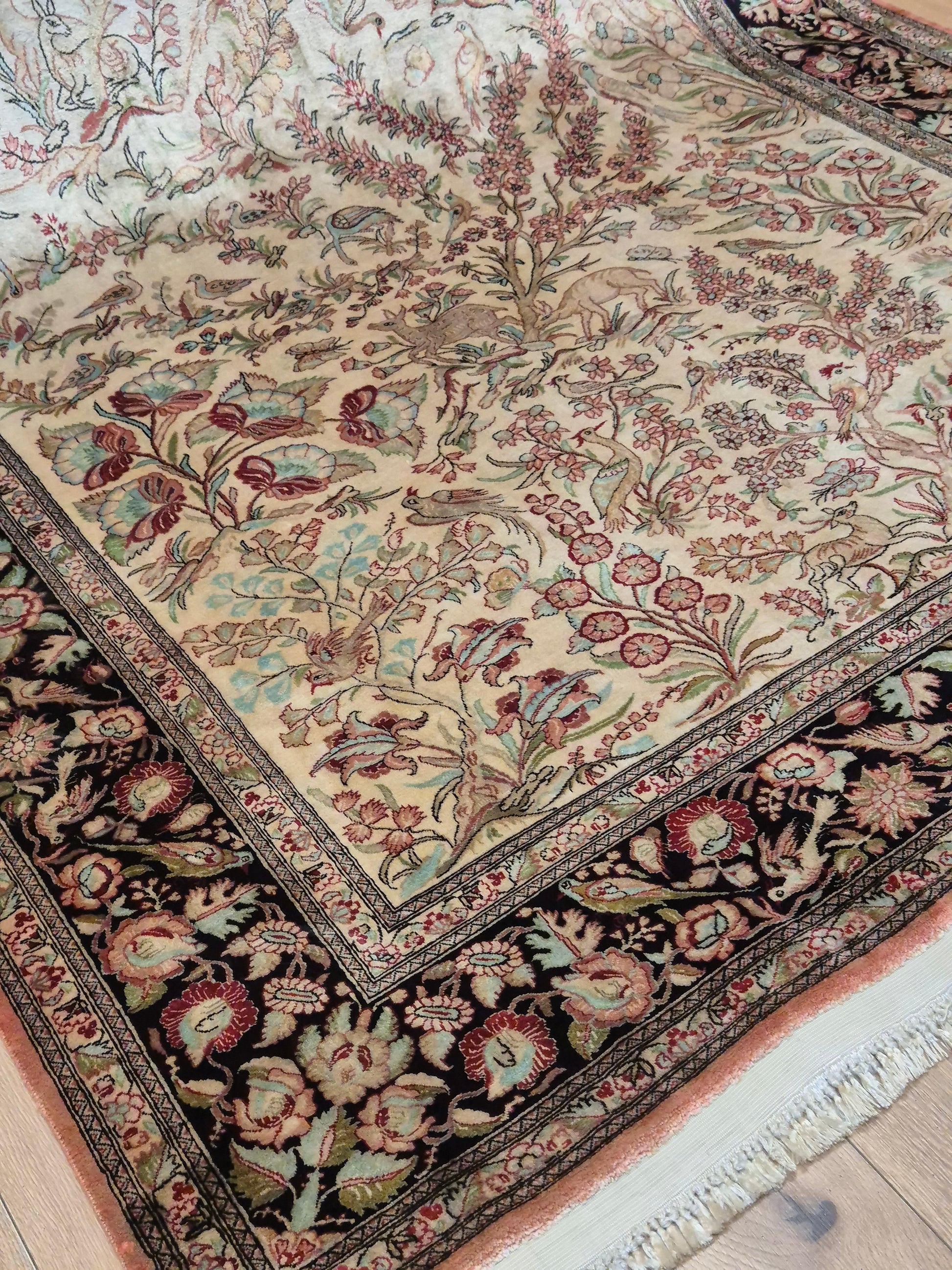 angeboten wird ein edler Ghom Teppich aus reiner Seide auf Seide, handgeknüpft in äußerst feiner Ausführung. Das Design zeigt ein Paradiesgarten-Motiv mit detailreich dargestellten Vögeln, blühenden Zweigen und zarten Ranken – kunstvoll arrangiert auf hellem Fond.