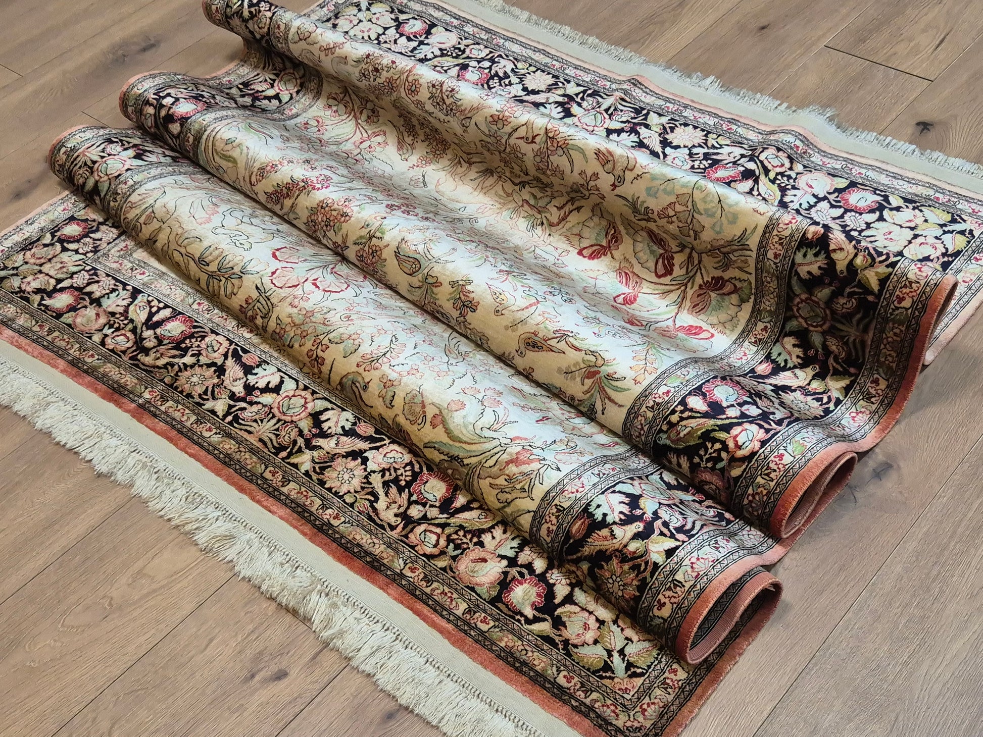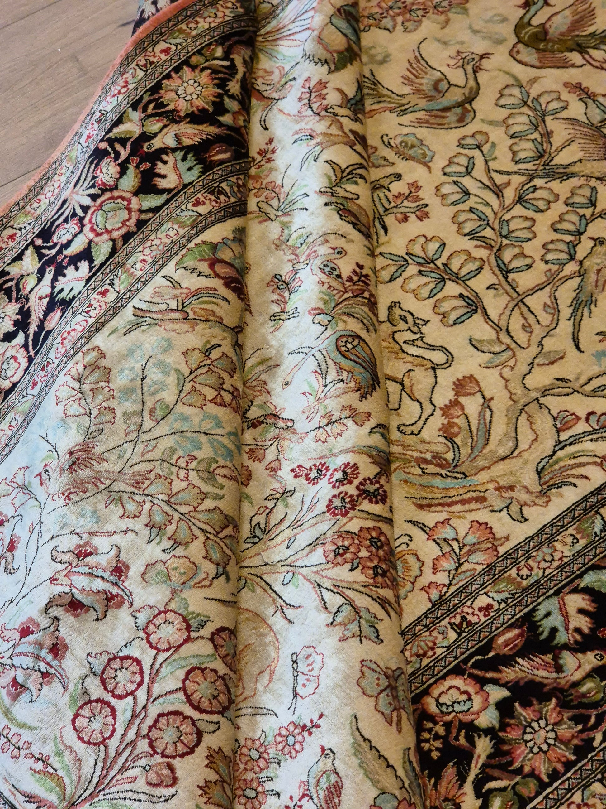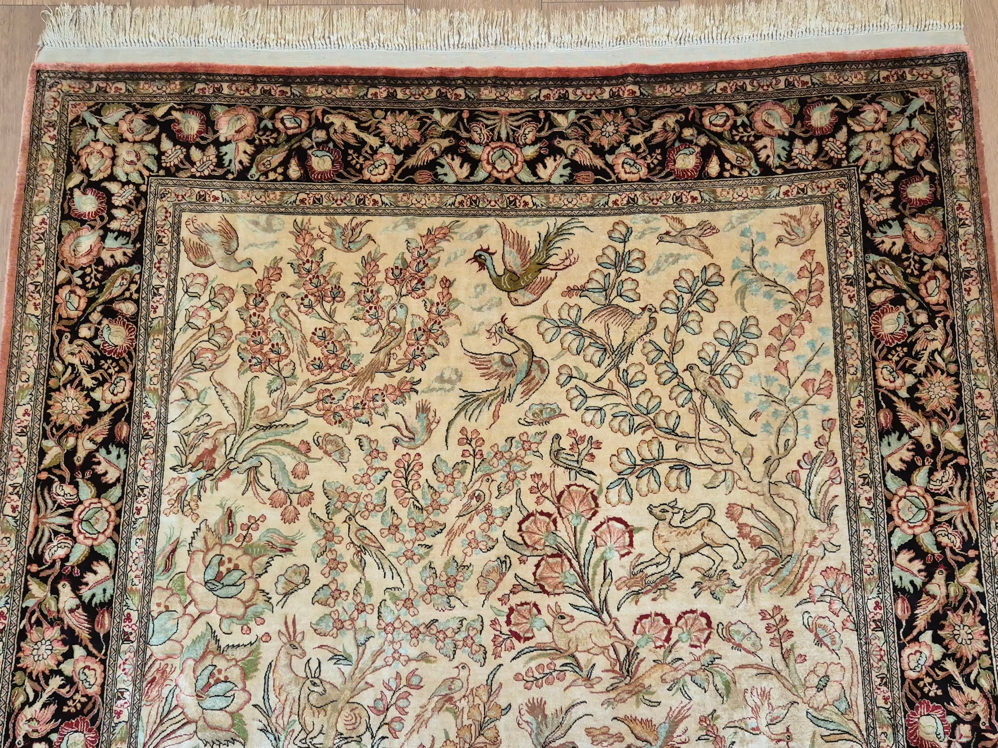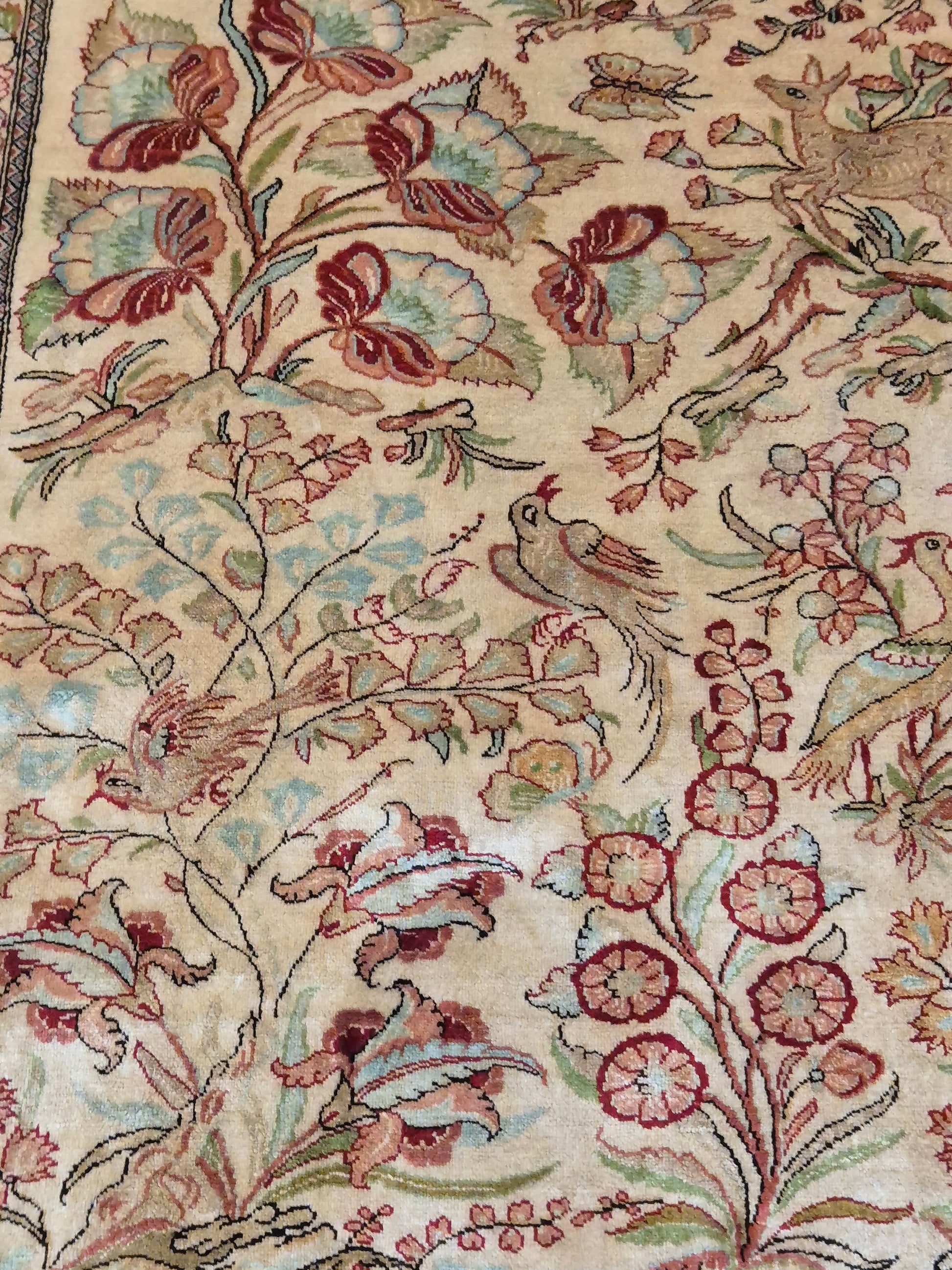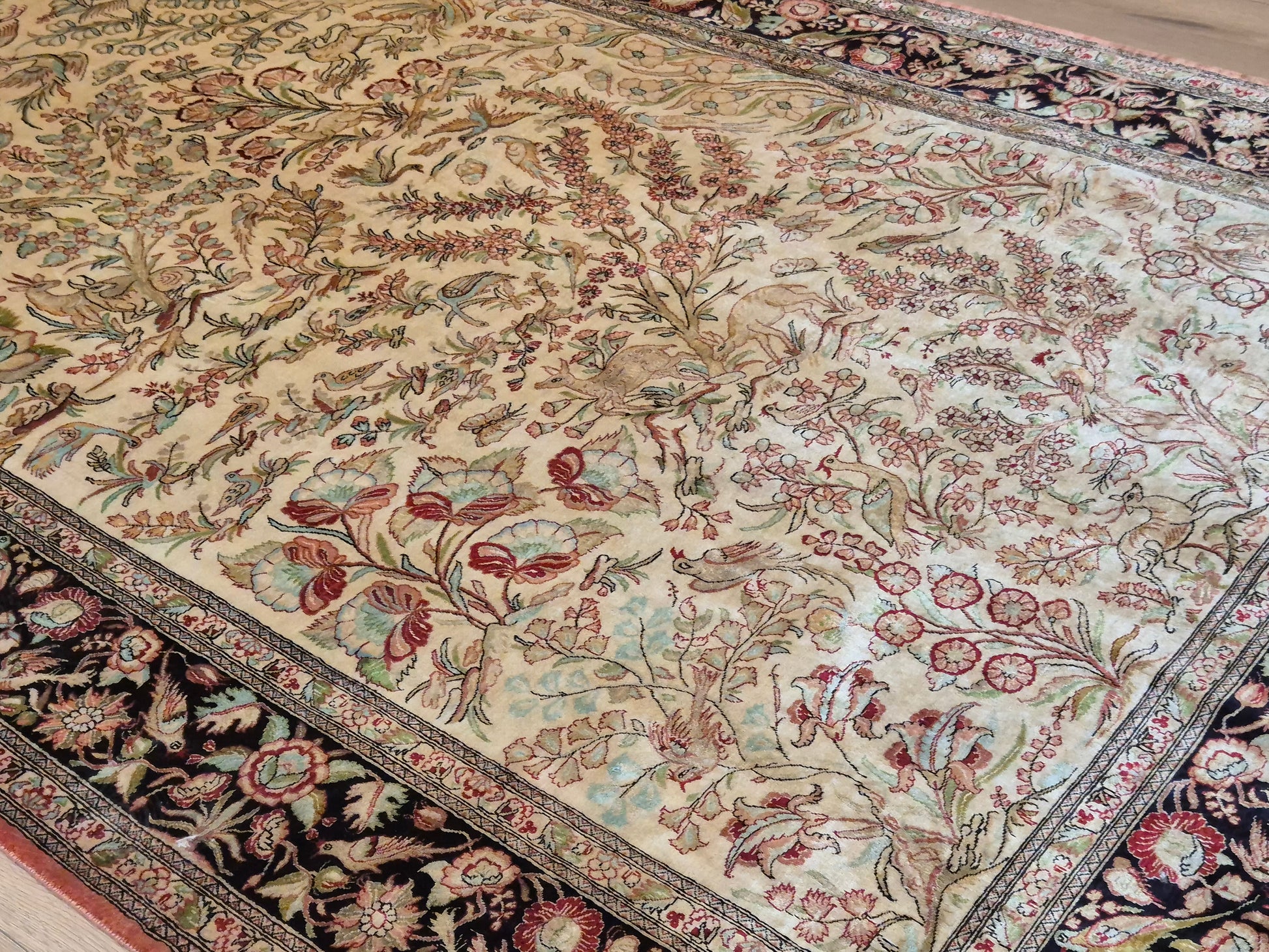 angeboten wird ein edler Ghom Teppich aus reiner Seide auf Seide, handgeknüpft in äußerst feiner Ausführung. Das Design zeigt ein Paradiesgarten-Motiv mit detailreich dargestellten Vögeln, blühenden Zweigen und zarten Ranken – kunstvoll arrangiert auf hellem Fond.