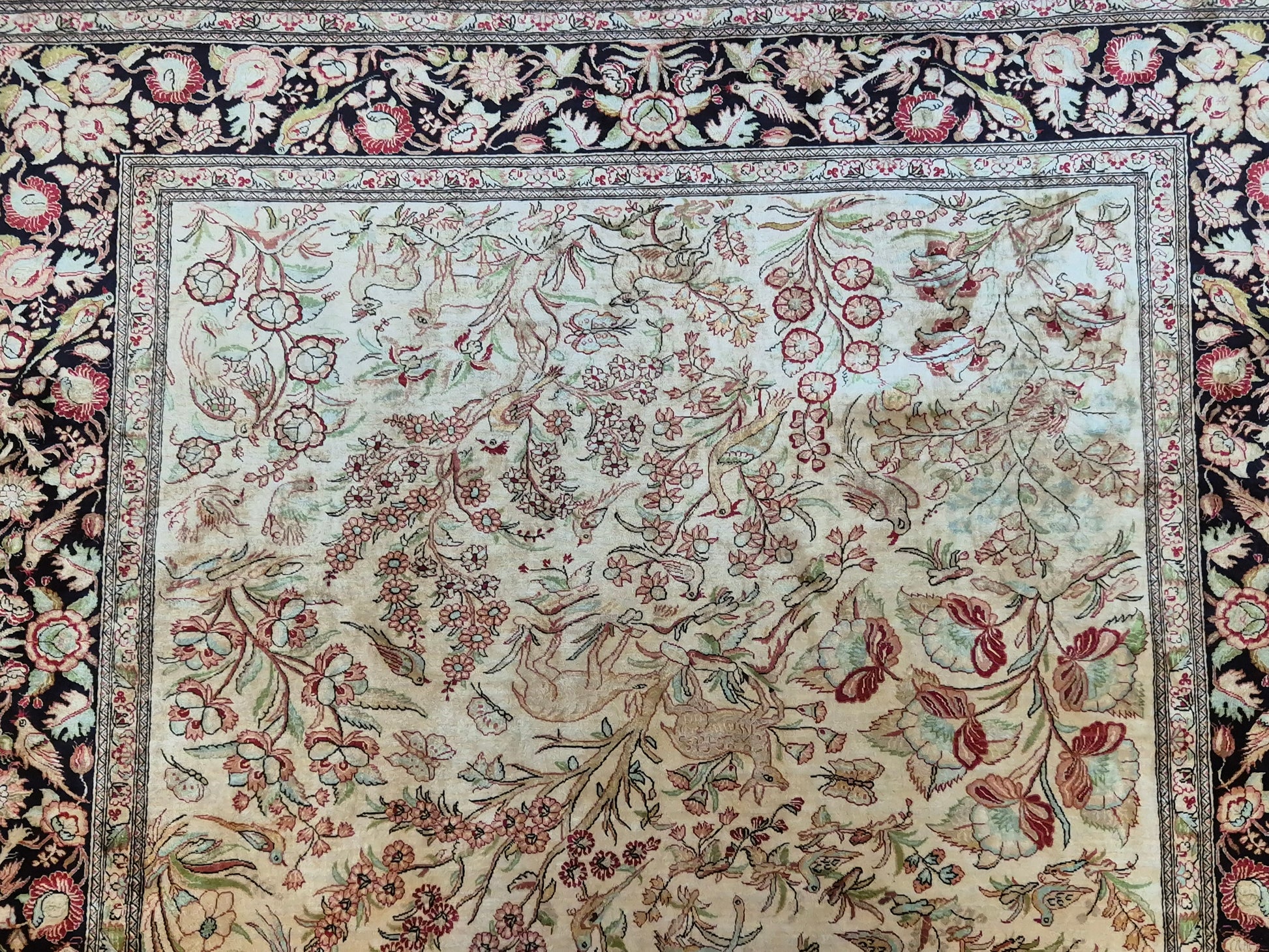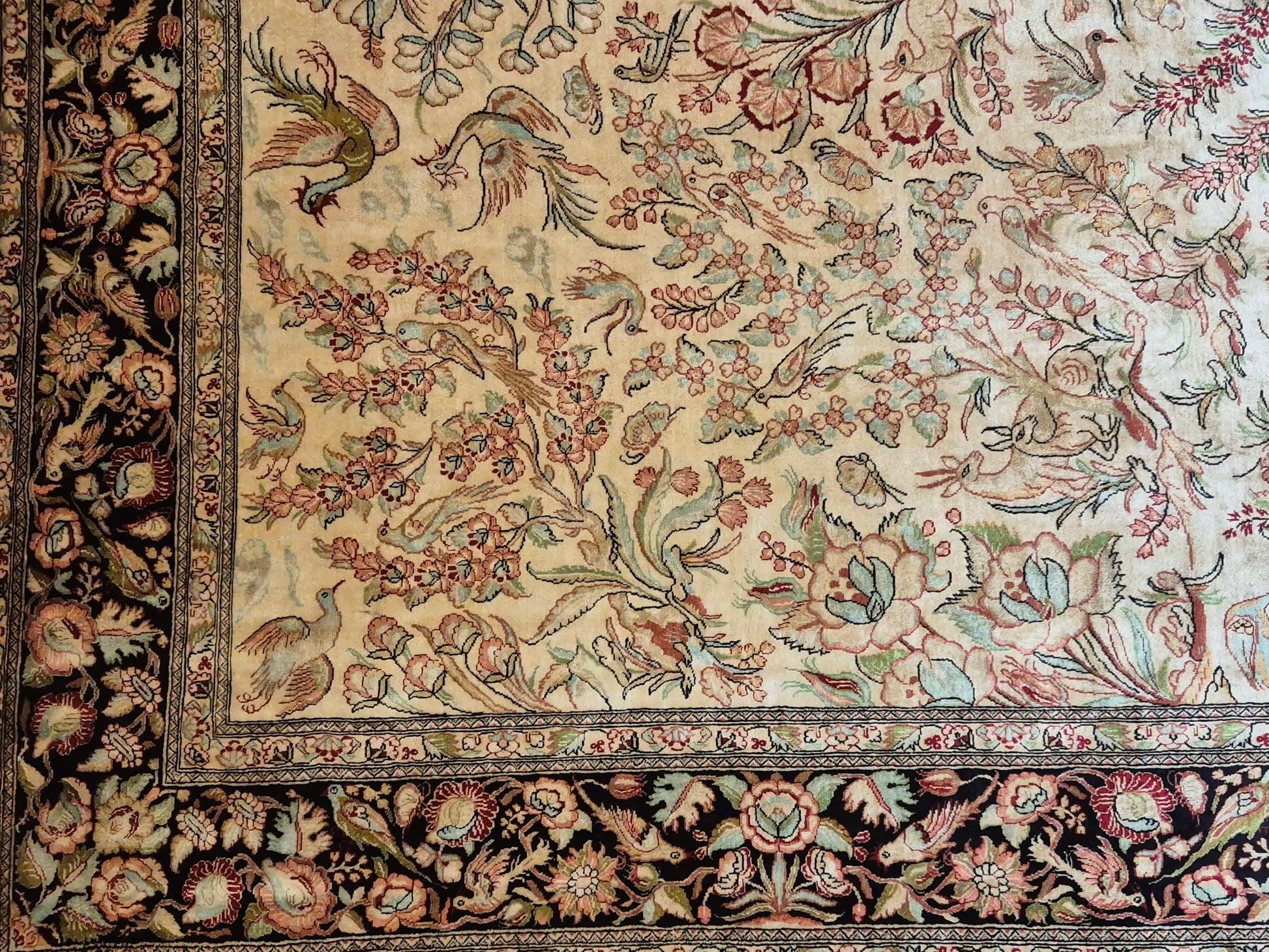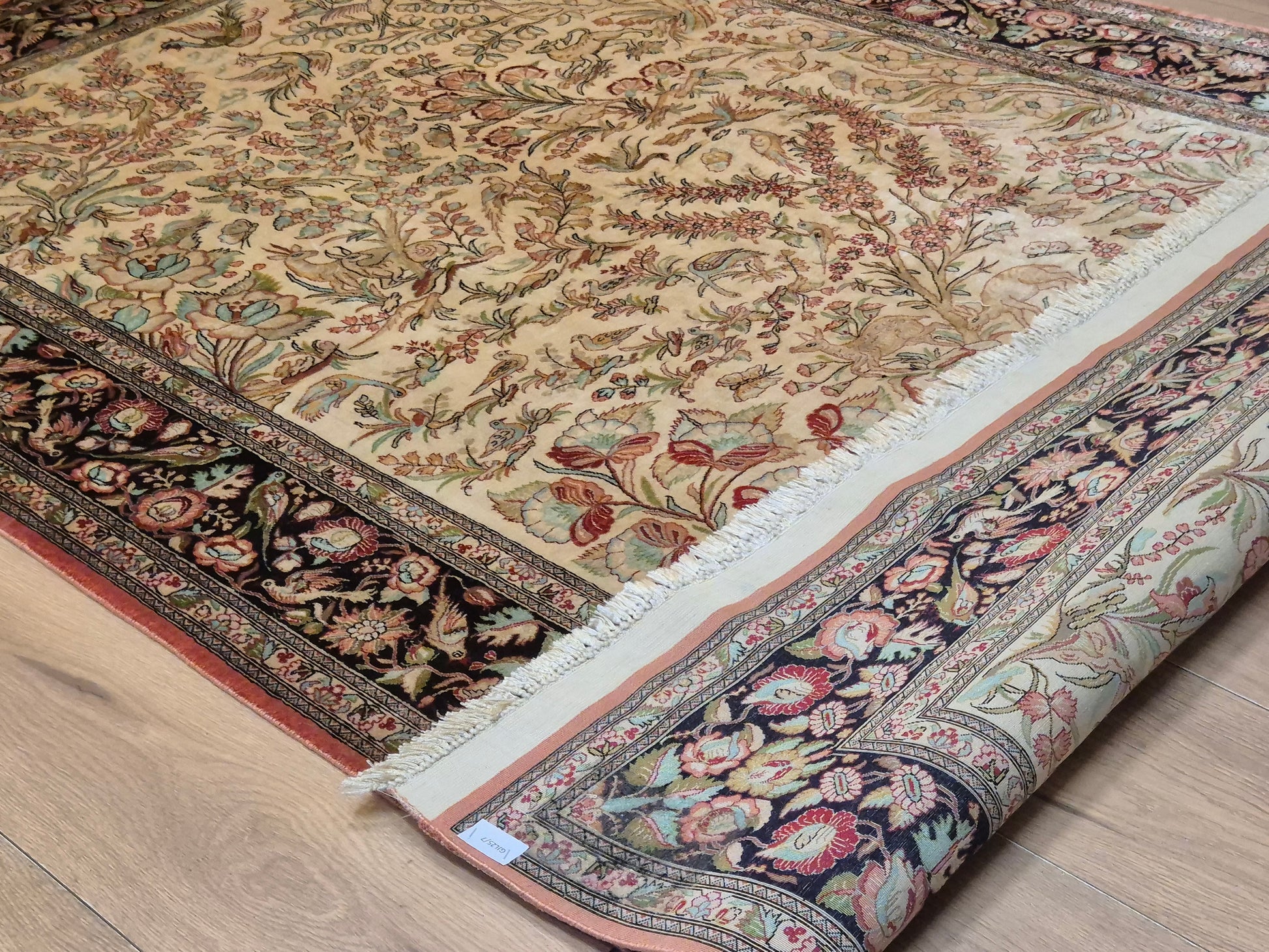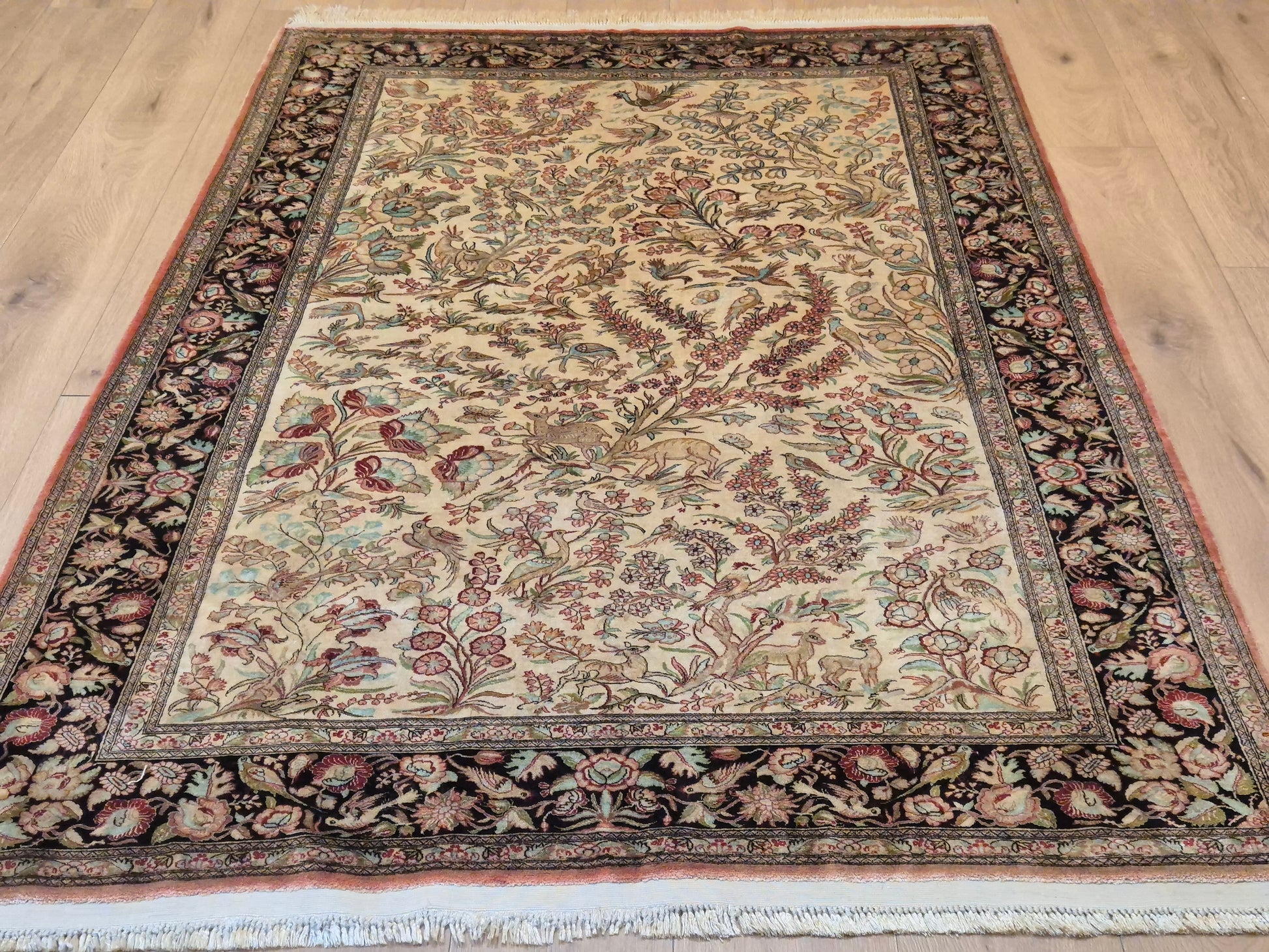 angeboten wird ein edler Ghom Teppich aus reiner Seide auf Seide, handgeknüpft in äußerst feiner Ausführung. Das Design zeigt ein Paradiesgarten-Motiv mit detailreich dargestellten Vögeln, blühenden Zweigen und zarten Ranken – kunstvoll arrangiert auf hellem Fond.